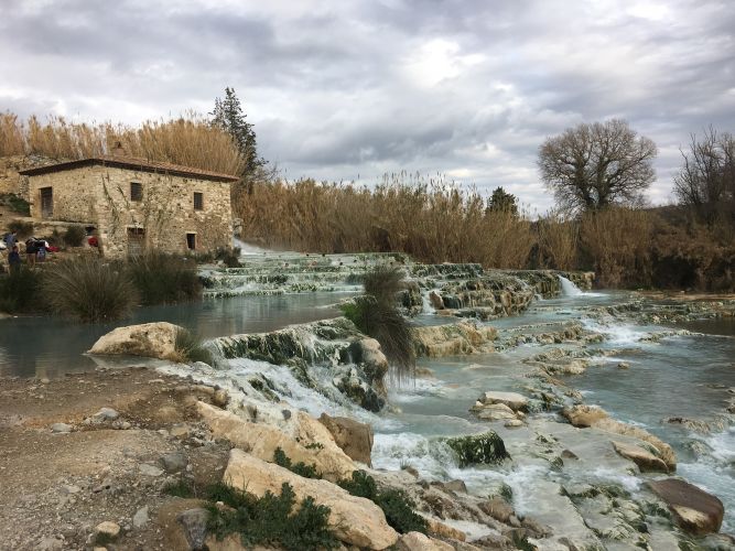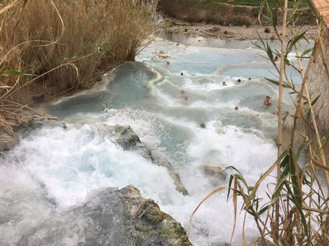 The closest hot springs were at Saturnia, another Tuscan hill town with a spa, but also free public bathing in the warm waters. I’d done a bit more research this time and knew that we would get water at about 38.5 degress, which is pleasantly warm, and that the baths are used year round.