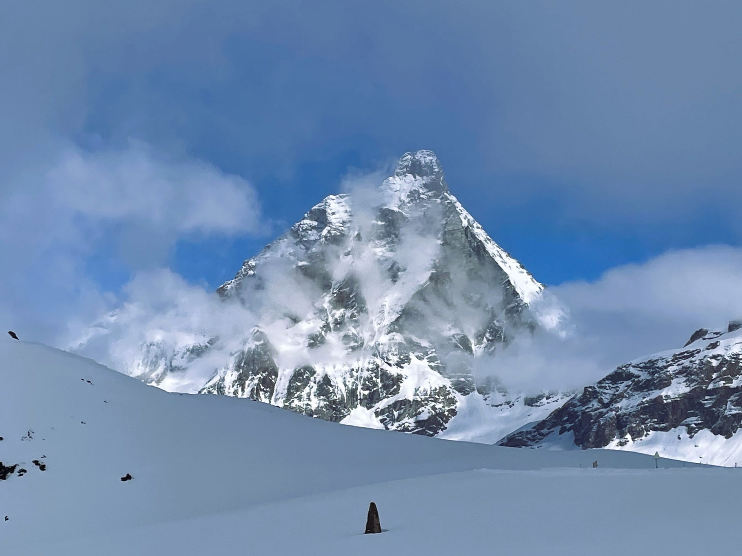 At the end of the day I decided to ski the long run all the way down to the Valtournenche car park. Paul declined to join me and I don’t blame him, piles of slush had mounded up on the slopes and made for very heavy going. But I had to do it, the snow was disappearing from the bottom end of the run fast and I knew that if I didn’t do it now I might not get a chance this year.