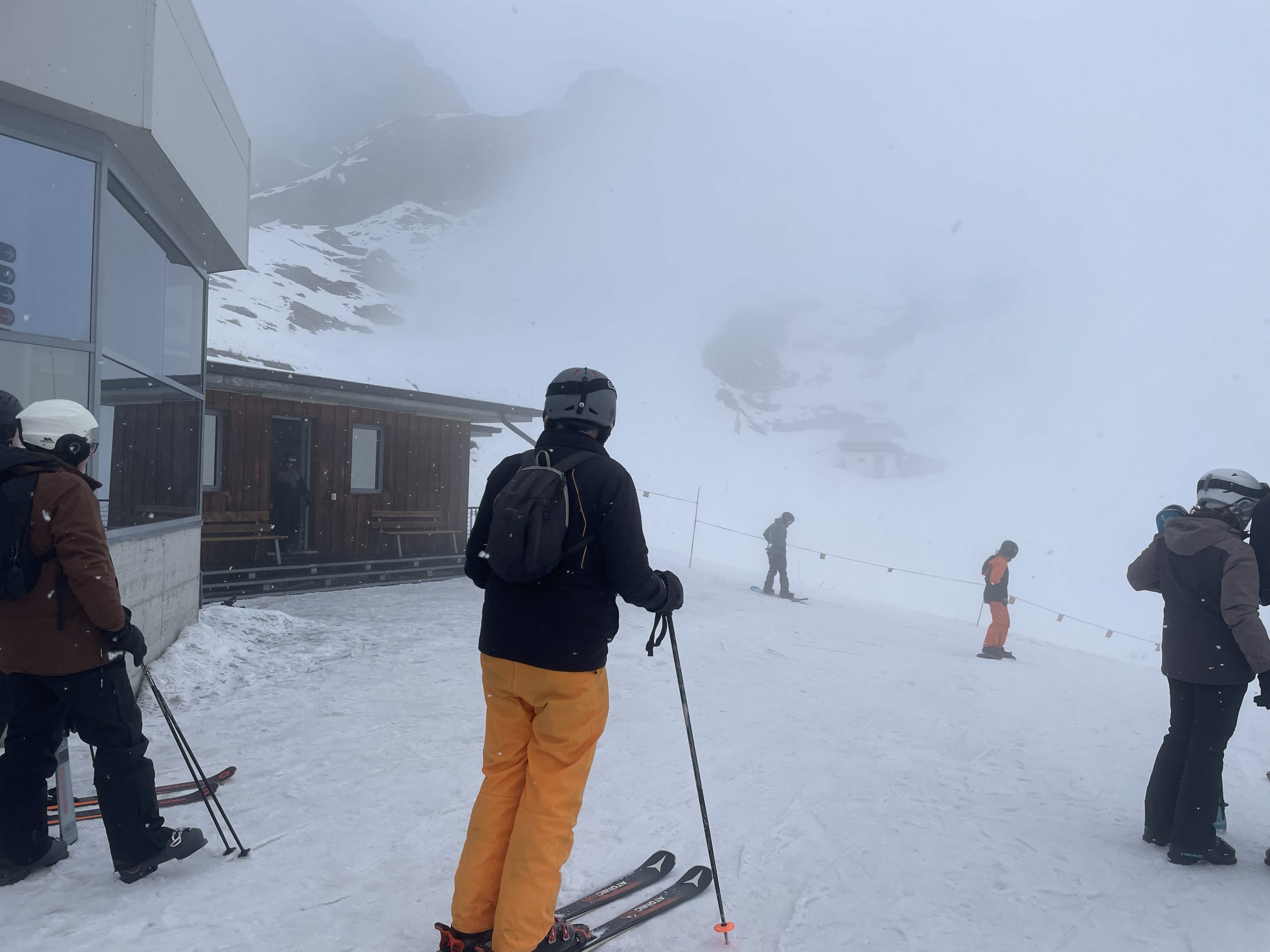 On our second day the piste conditions were much improved with a few cms of new snow.  We headed up the other side of the resort. The cloud was still around, a blanket of grey that hovered just below the top of the gondola, obscuring the Indren lift and causing mild carnage at the top of the runs. But below the cloud the visibility was fine and the skiing very enjoyable.