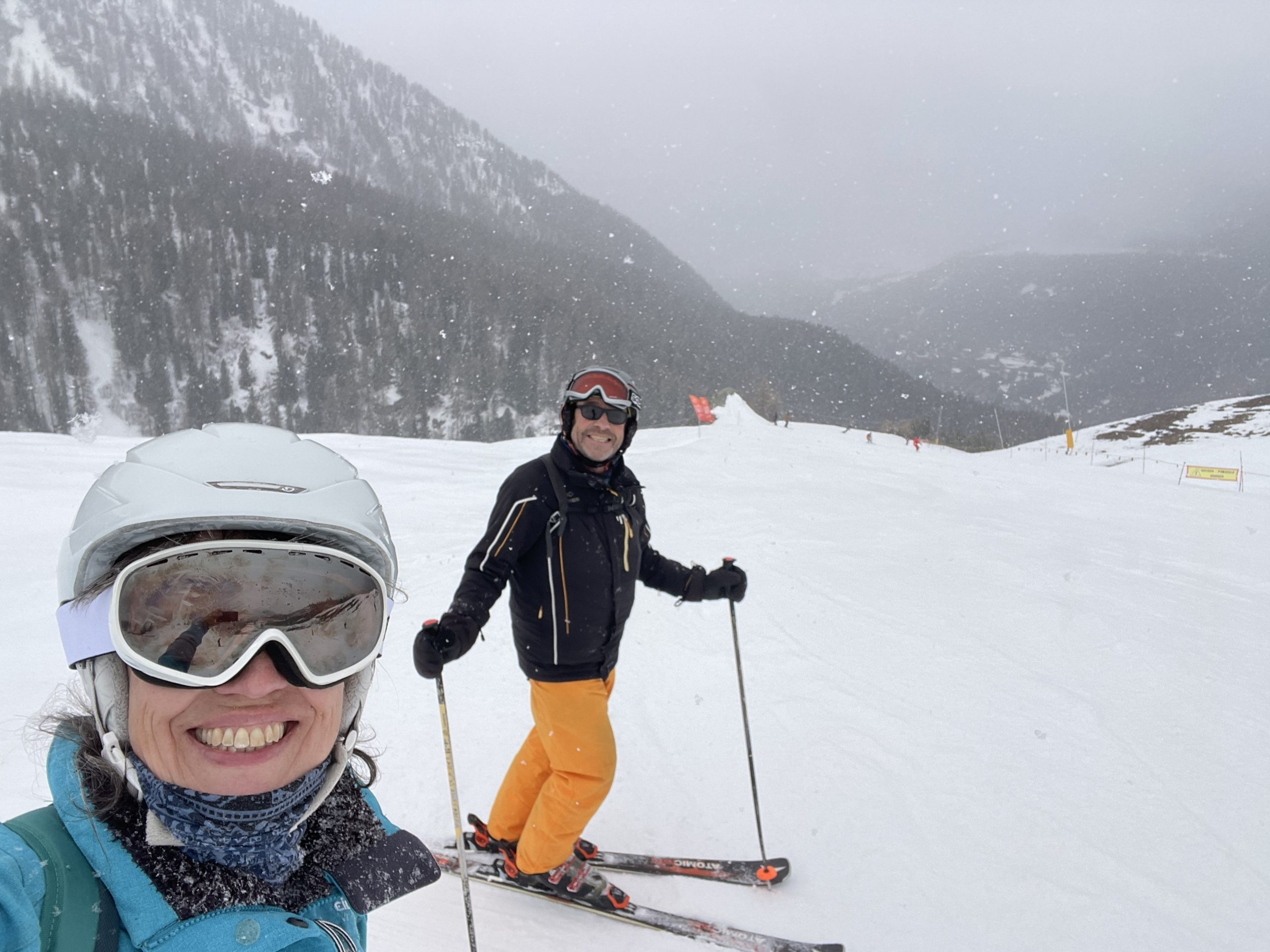 After such a long period of sunshine we were a little discombobulated to find that the mountains were shrouded in cloud. This was a bit of test for our skiing. Fortunately the slopes were never too busy as we felt our way around in occasional thick fog and snow flurries on the Val d’Ayas side of the resort. Skiing by feel is a good exercise even if it’s slightly stressful. It did make me feel very disorientated, the skiing itself was ok but each time I came to a standstill I lost all sense of which way was up which resulted in a couple of instances where i just toppled over. It didn’t seem to affect Paul’s sense of balance in the same way. I’m in awe of the visually impaired skiers we’ve been seeing in the Paralympics.