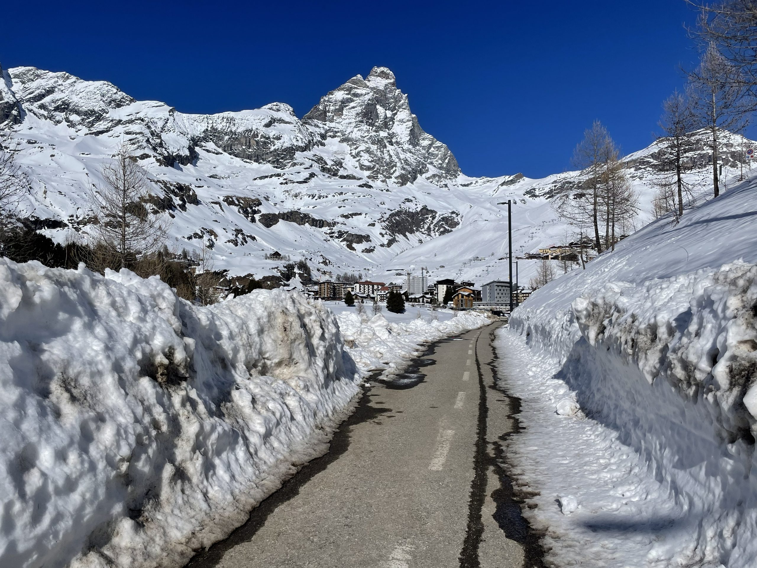 Walk the walk into town is best tackled by crossing the road and then entering the car park near the petrol station. Walk all the way through the car park to the bus station and then you can walk up through town town to the Cretaz lift. It’s about 1.5km so it’s not a short walk but there are several places in Cervinia where you can store skis so that you don’t have to be encumbered while walking. We have used 2.0 Ski Rental and have also used the lockers in the basement of the Plan Maison Gondola station.