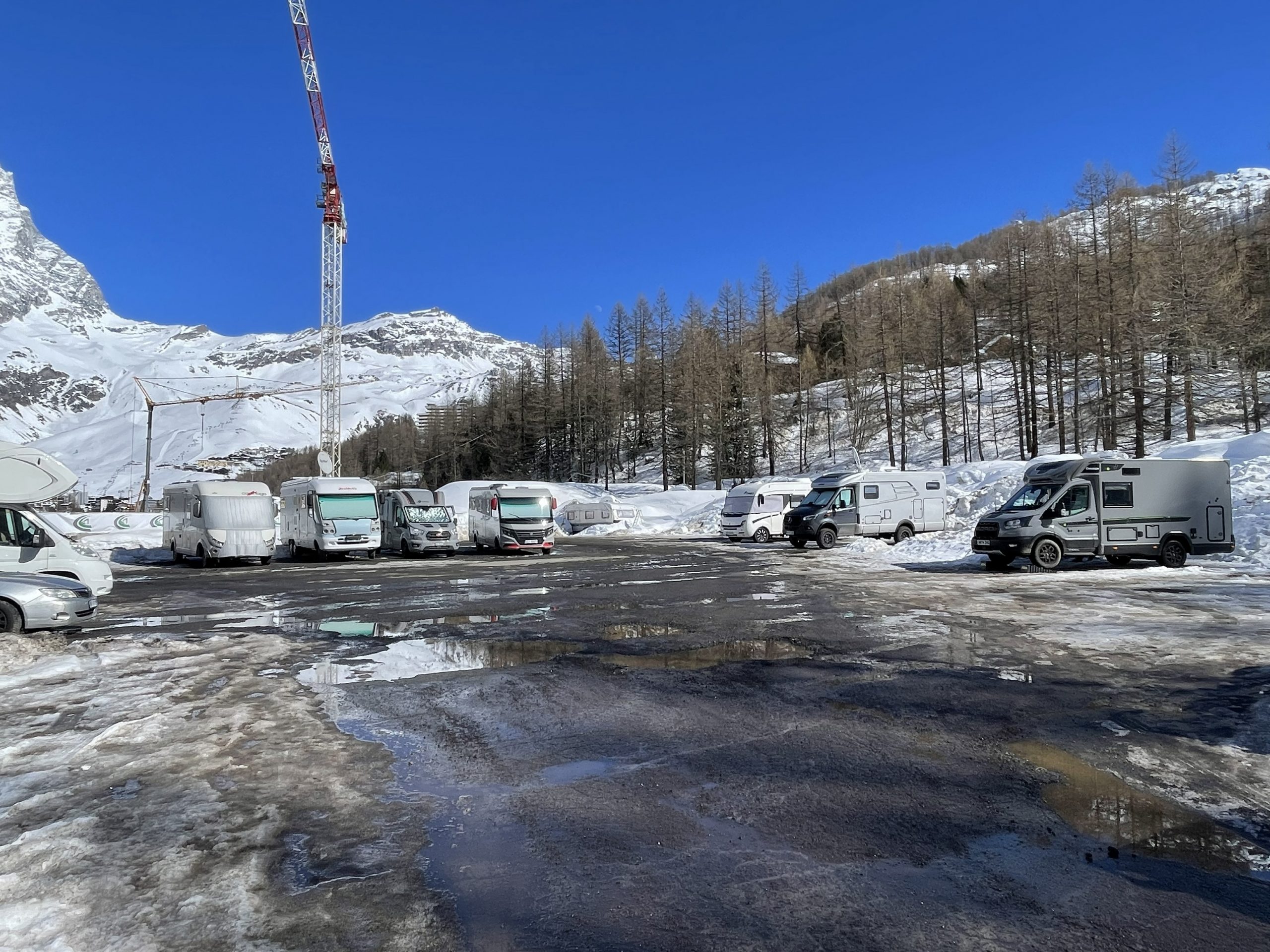 We have been coming to Cervinia for years, first as package tourists when it was a good Easter holiday option while Aaron was at school. Then in the motorhome. In fact it was Cervinia where we first realised that motorhome skiing was possible. We were driven past the sosta in our package holiday coach, wondering how cold people got in their white boxes and how they could possibly camp in sub zero temperatures. We had no idea about motorhomes back in those days.