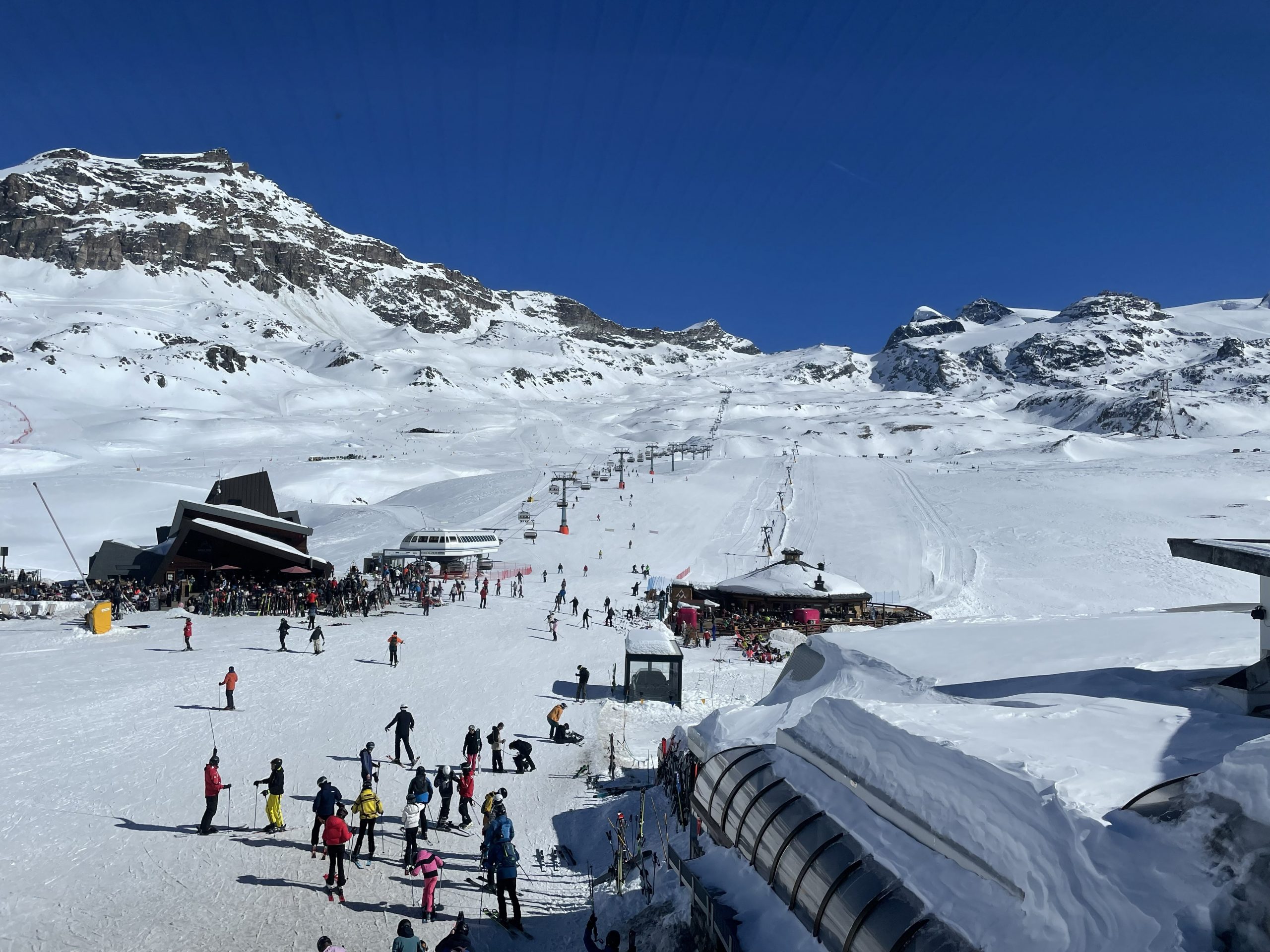We enjoyed a couple of days back on the slopes in Cervinia, making our way around all of the slopes. As always the snow conditions were excellent although the endless sunshine was starting to take it’s toll on the lower slopes in the afternoons. It was also relatively busy, with tourists from across the globe. That snow-sure reputation is really making Cervinia a popular destination and it’s noticeable, where once it would have been possible to find empty slopes in the mid-week, now there is no escaping people. Luckily its still not as busy as some of the popular French resorts.