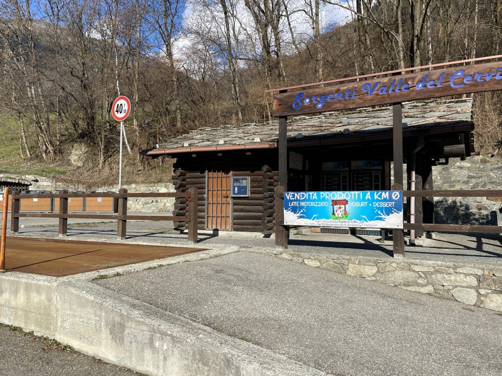 On the way up the valley we stopped somewhere we had seen many times but always shot past. This is a location on the side of the road that used to be a weighbridge. The ramp and weighing platform are still there, but no longer in use. Instead, under the cover of the hut, a local dairy has two self service fridges where you can purchase yoghurt and desserts. There is also a still and sparkling water dispenser in the same location. Sadly for Paul all of the desserts were set milk based options, chocolate budino (a word more closely associated in my mind with a blood sausage), caramel pudding and panna cotta. Paul has a definite aversion to anything blancmange textured. I’m not keen either but a swift stir makes it less wobbly and edible for me.
