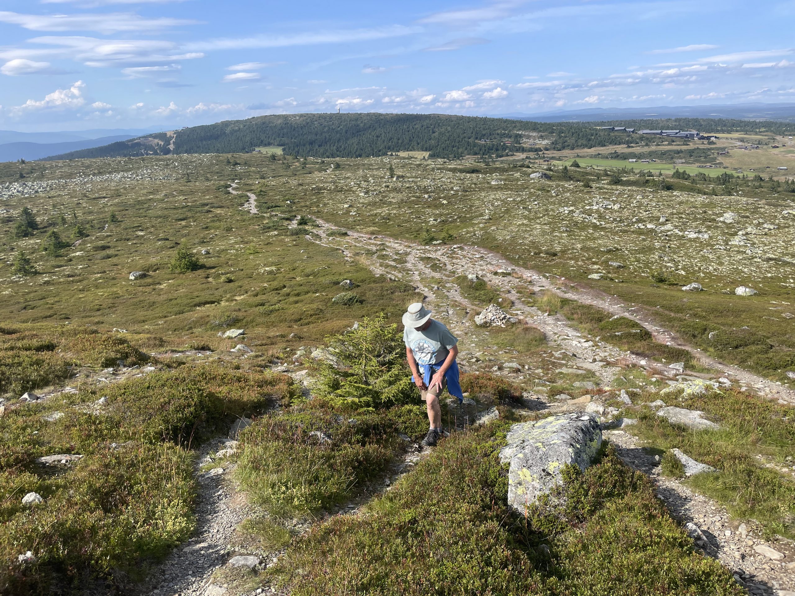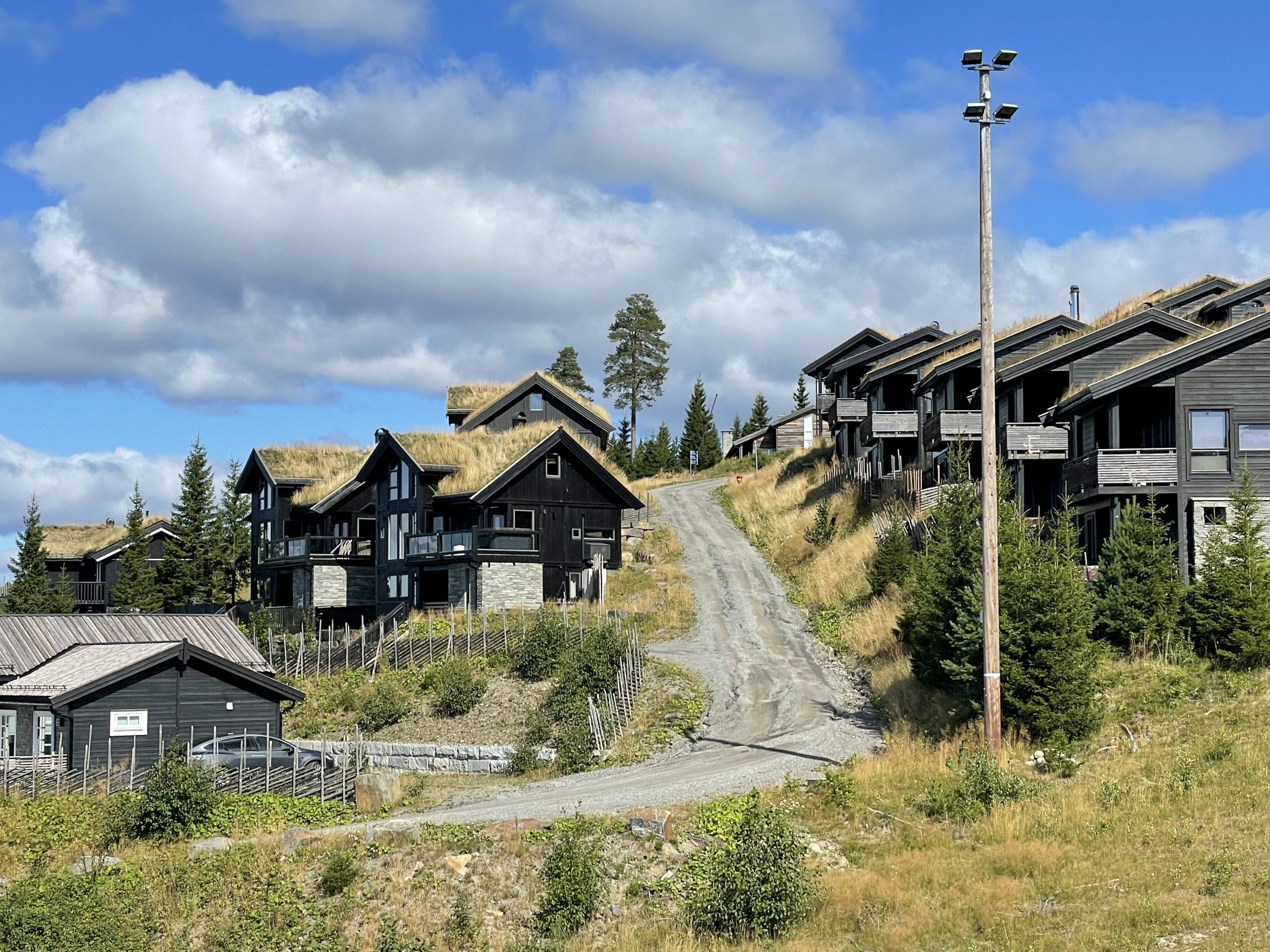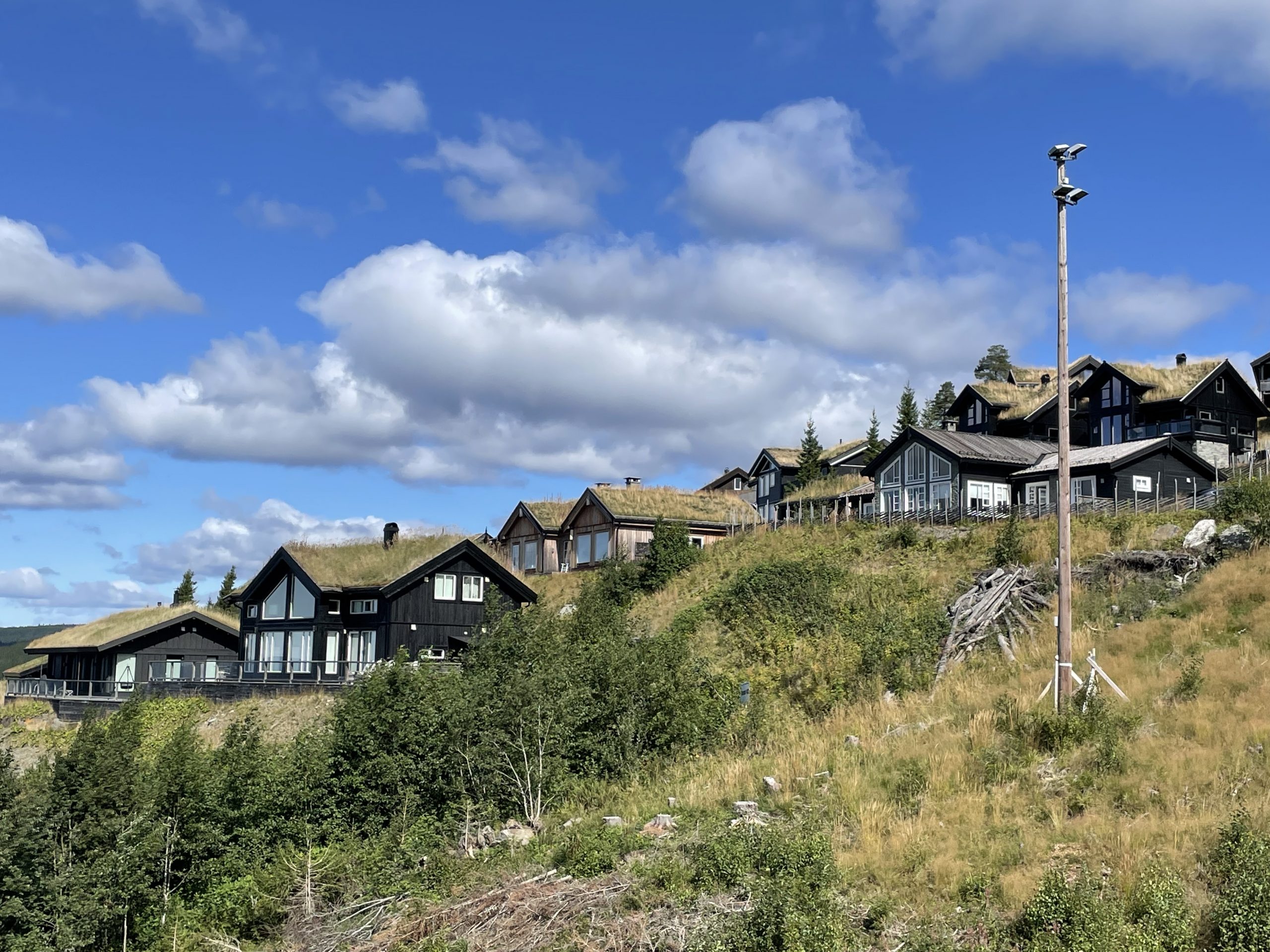 We took a private toll road up to a large parking area on the open moorland above the ski resort. The toll was a mere 30 NOK and had to be paid on exit. We used the Autopay app for this although there was also a machine to collect tolls. On the way up we saw the many holiday chalets that cluster on the slopes. Most of them were wooden with living roofs. They actually looked rather cute and not the eye sore we had expected when we’d seen them on the map.