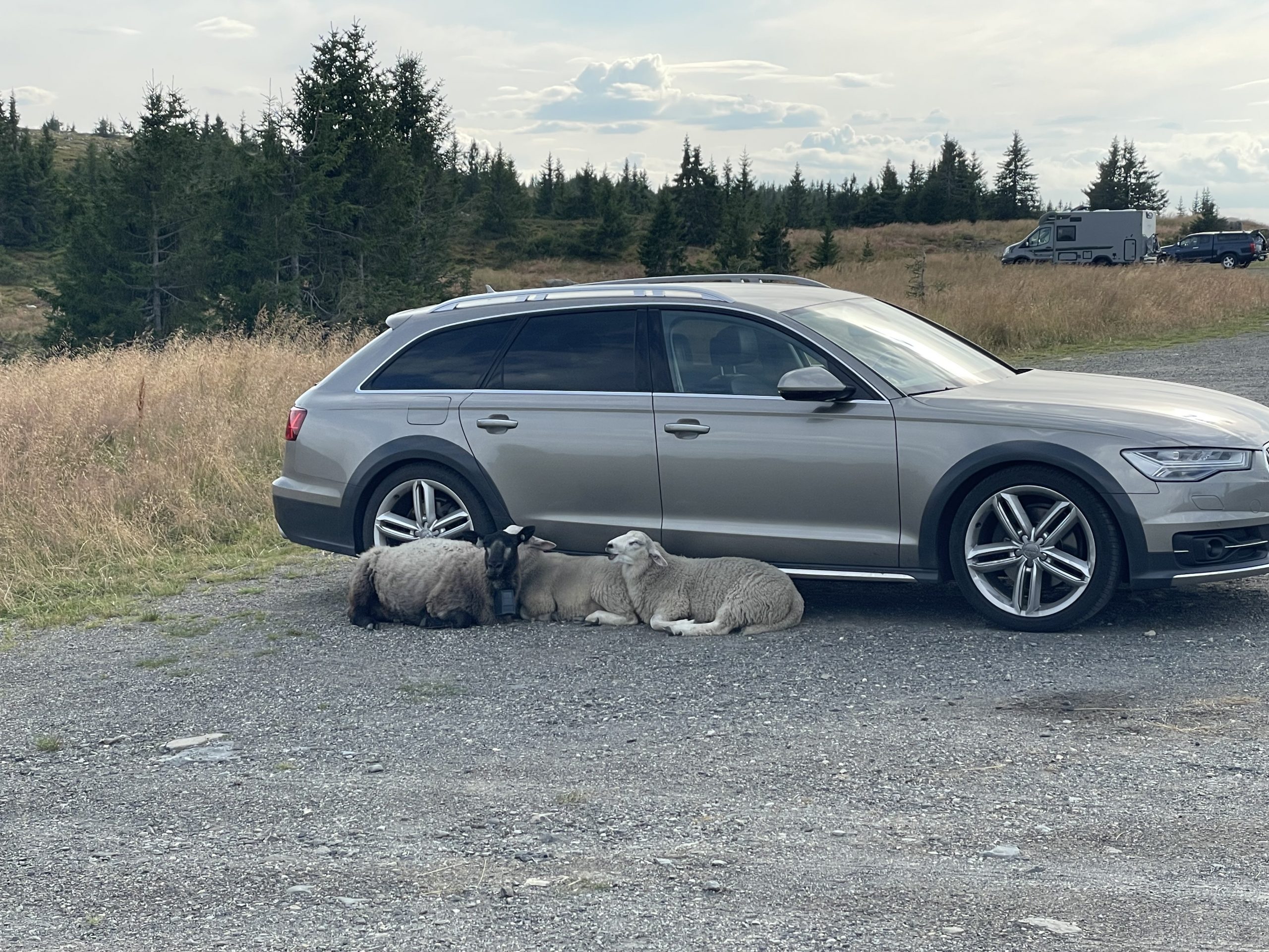 It was easy enough to find a flattish parking spot with lovely views over the fells and Reinsvatnet lake. Over the two nights we stayed here people came and went frequently. Mostly walkers and cyclists and one person roller-skiing along the road. A sheep and a pair of large lambs seemed to have taken responsibility for patrolling the car park, often coming to have a scratch against the van or take shelter from the wind.