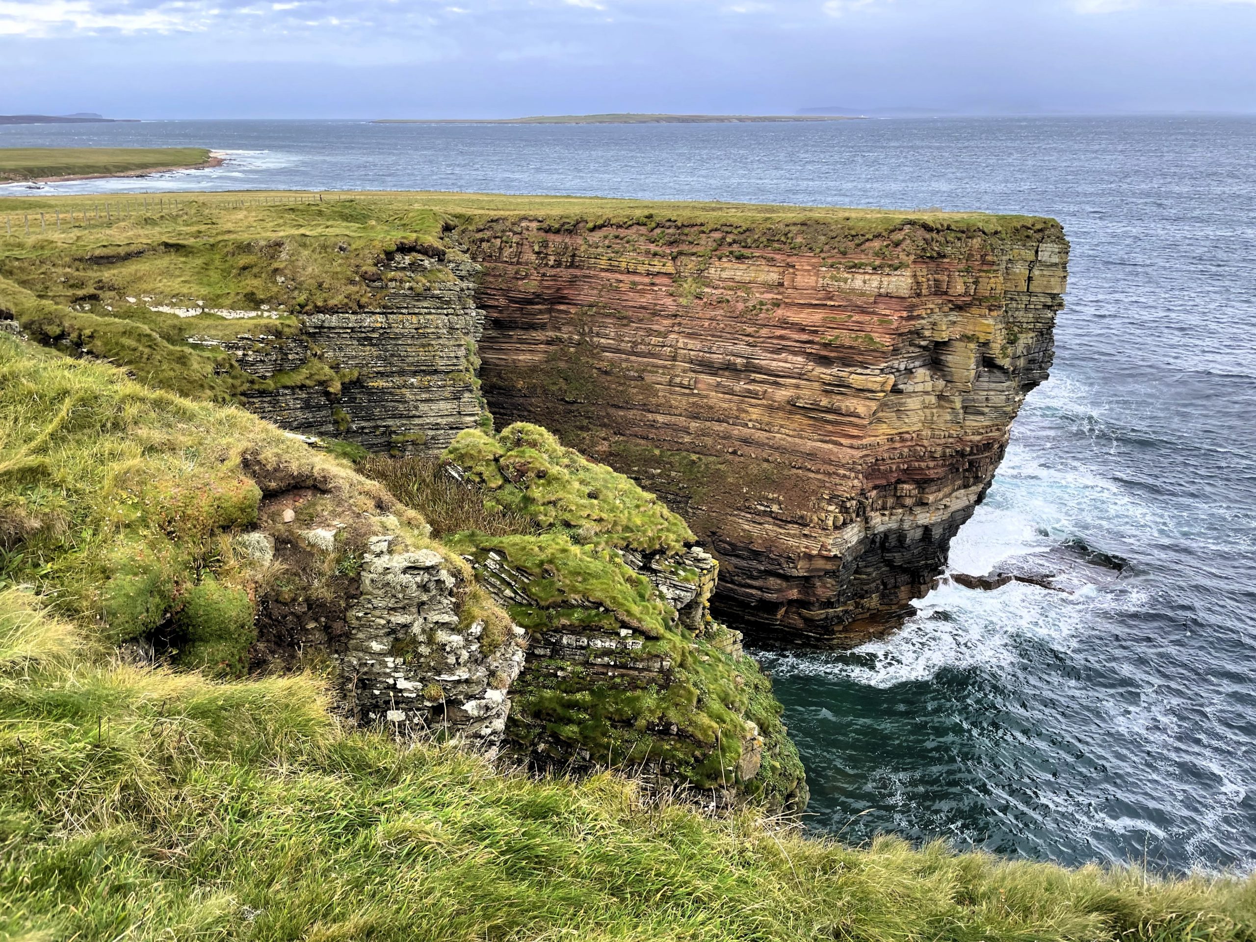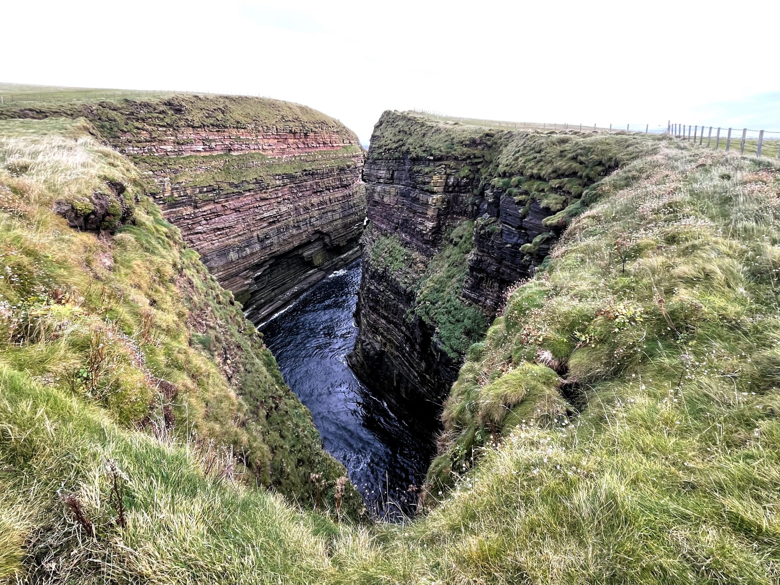 After the Bay of Sannick it started to climb up towards the rocky cliffs of Duncansby Head where a sea arch and narrow inlets are carved into the striated sandstone of the high cliffs.