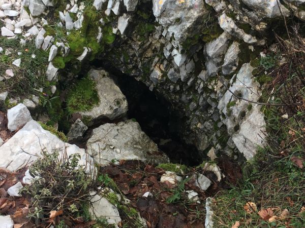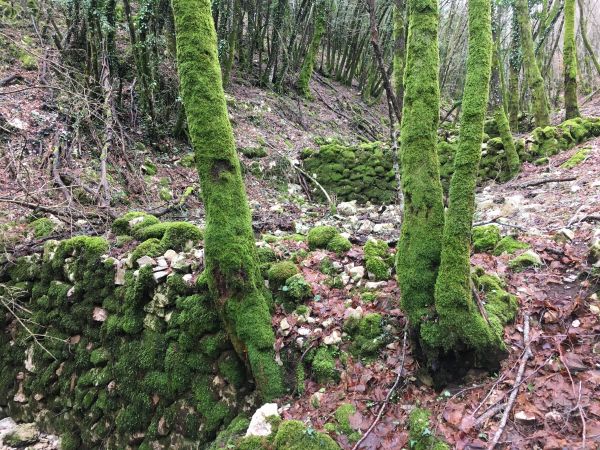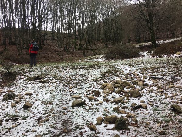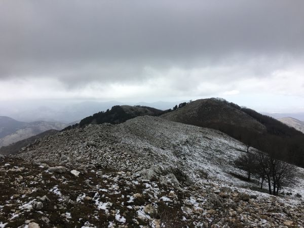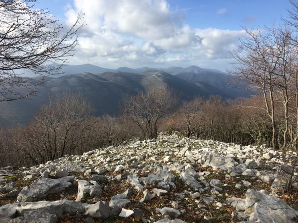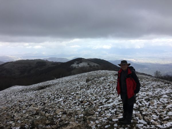 We left the sosta to wander up the marked path through the river valley. The markings on the path were the white and red of the Club Alpino Italiano which meant they were well maintained, unlike the locally maintained route markings in some areas which were funded by the EU and have been left to their own devices since funding dried up. The route was not too taxing as it took us on a gentle uphill through the valley criss-crossing the barely existent water. The sound of cow bells could be heard above us on the sides of the valley but the trees were too thick to see through even though most of their leaves had dropped. Along the watercourse were multiple stone dams, we wondered what they were for; they weren’t in use anymore and the pools behind them had mostly silted up. As we got higher we started to see snow on the ground and snowdrops growing around the path, a heartening first sign of spring. When we finally emerged from the woodland we were nearly at the top of the mountain, just a small climb up the slope to the summit cross, made slightly harder work than it needed to be by the thin layer of snow that slipped under our feet.