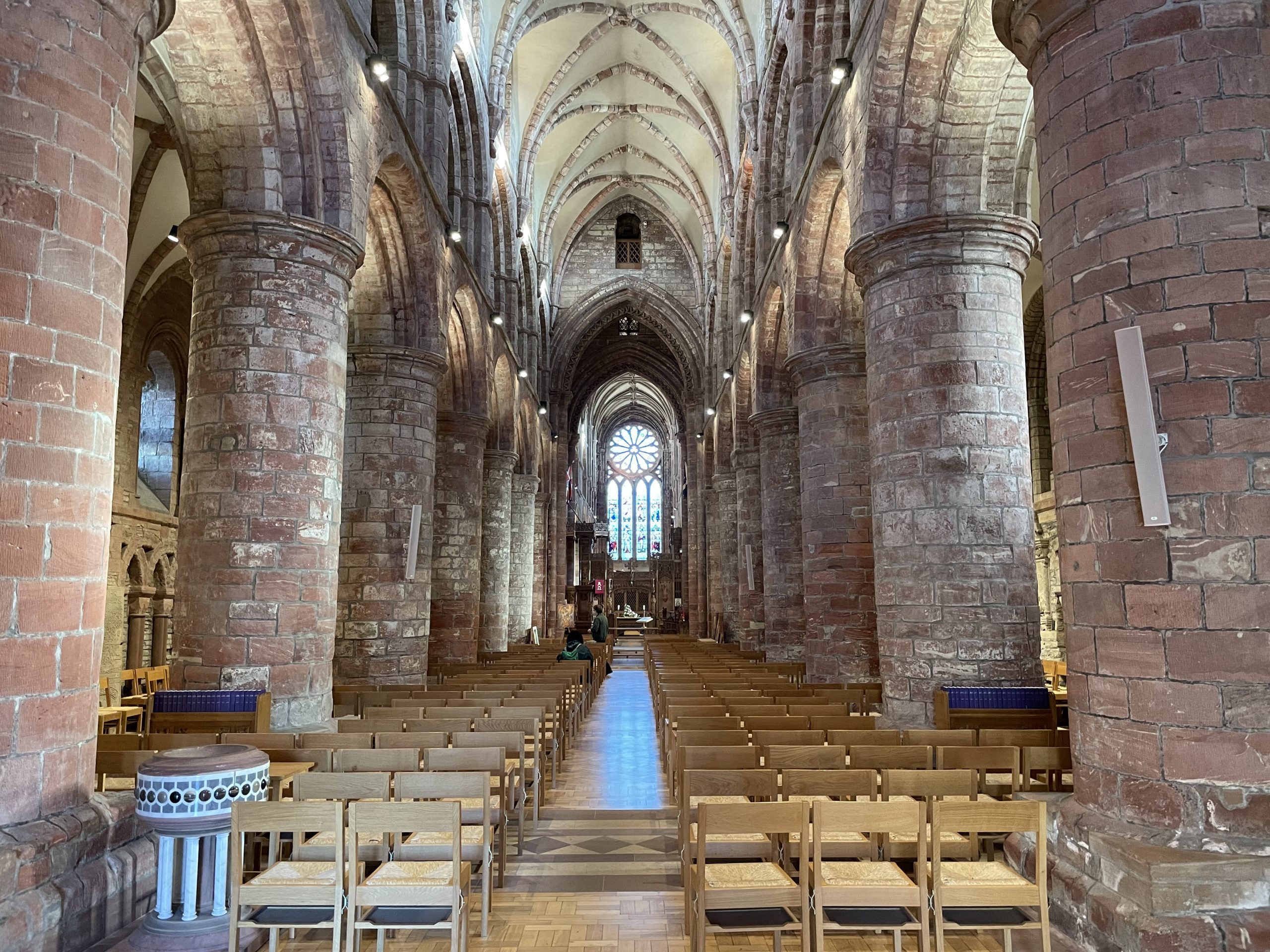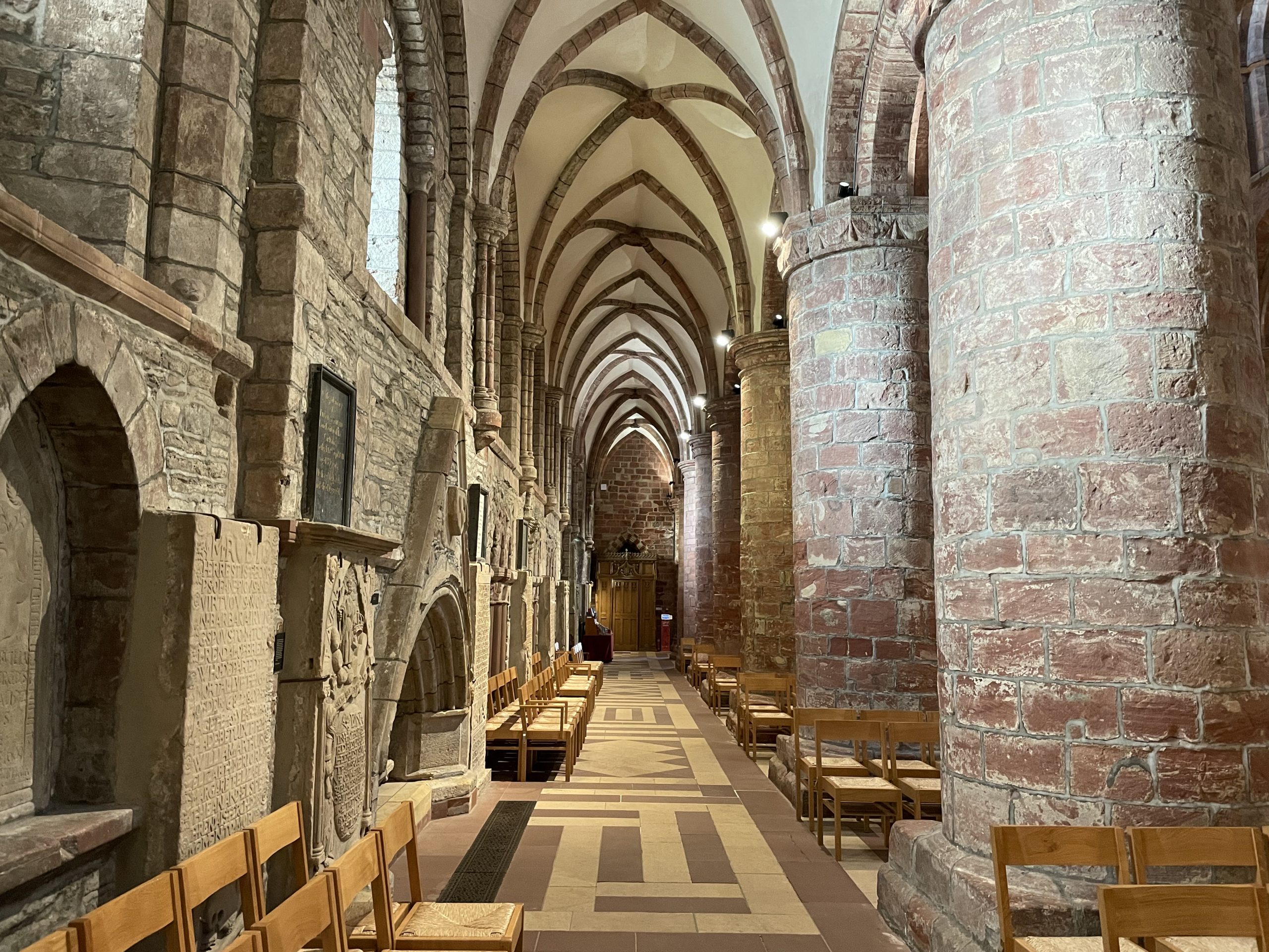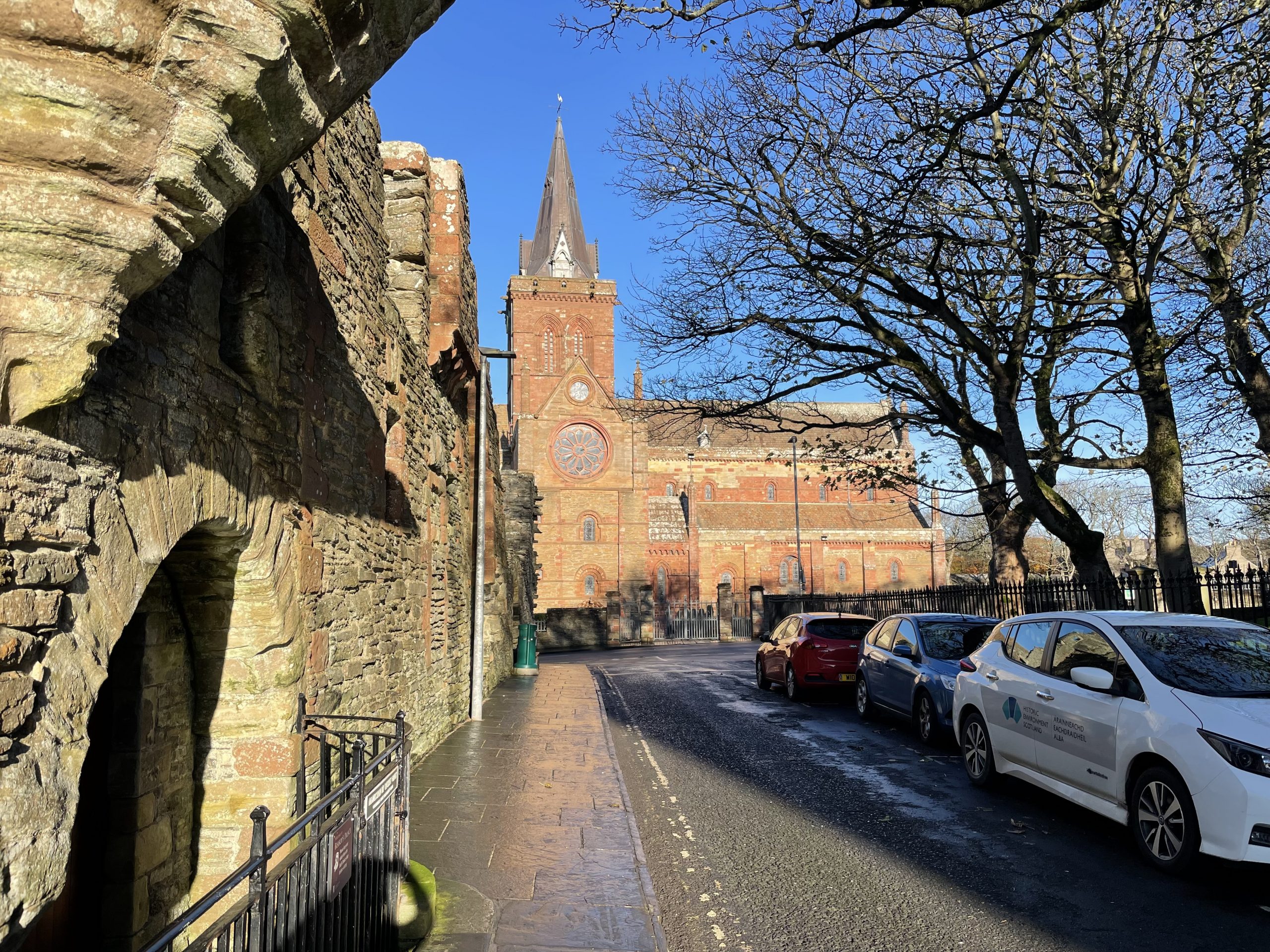 We visited St Magnus Cathedral with it’s warm red sandstone glowing in the low sun. The cathedral was restored in the early 20th century, revealing the beautiful stone which had been hidden under a layer of whitewash – a common practise in the reformation where decadent colourful decorations needed to be reduced to an austere blank canvas, the better to allow congregations to focus on worship.