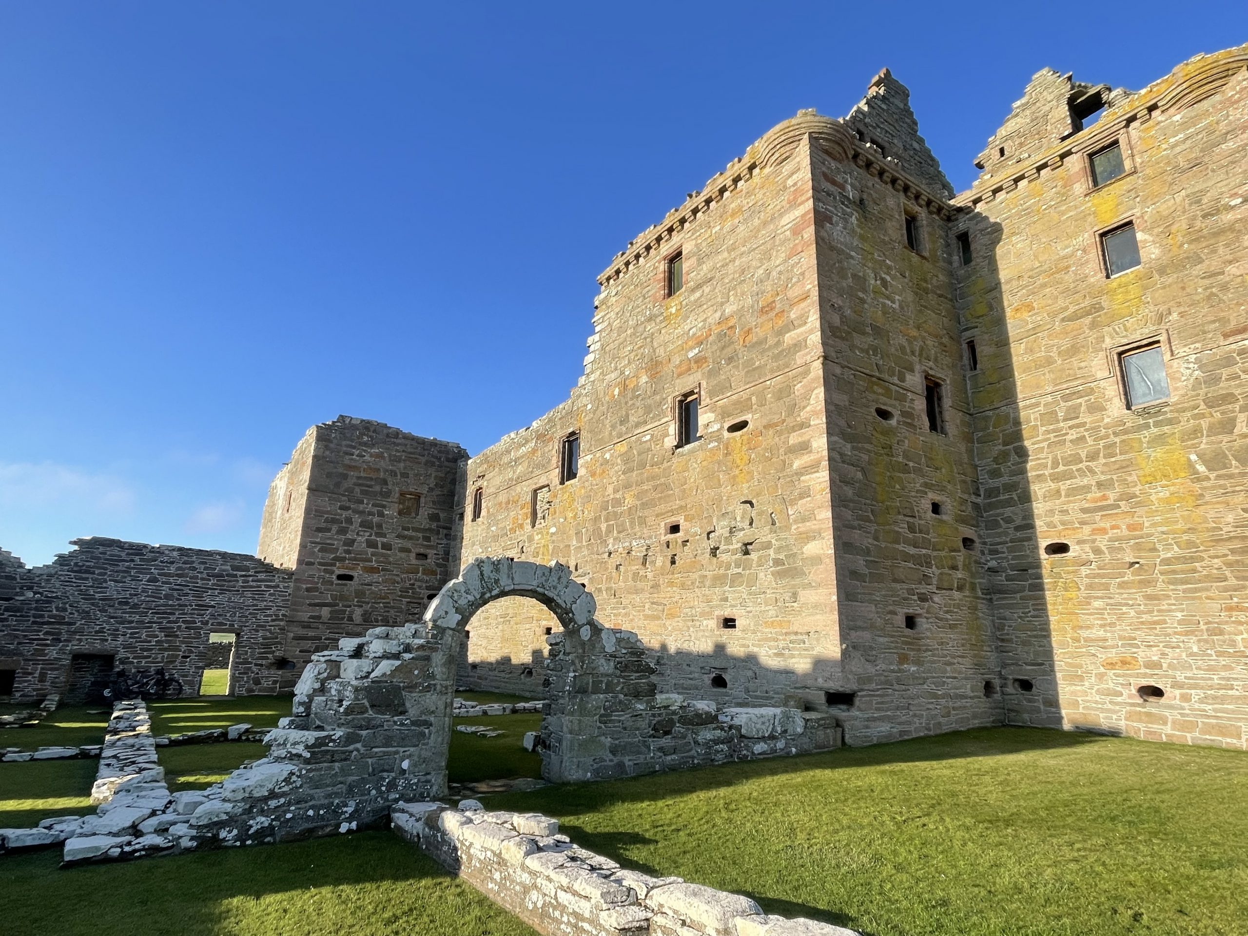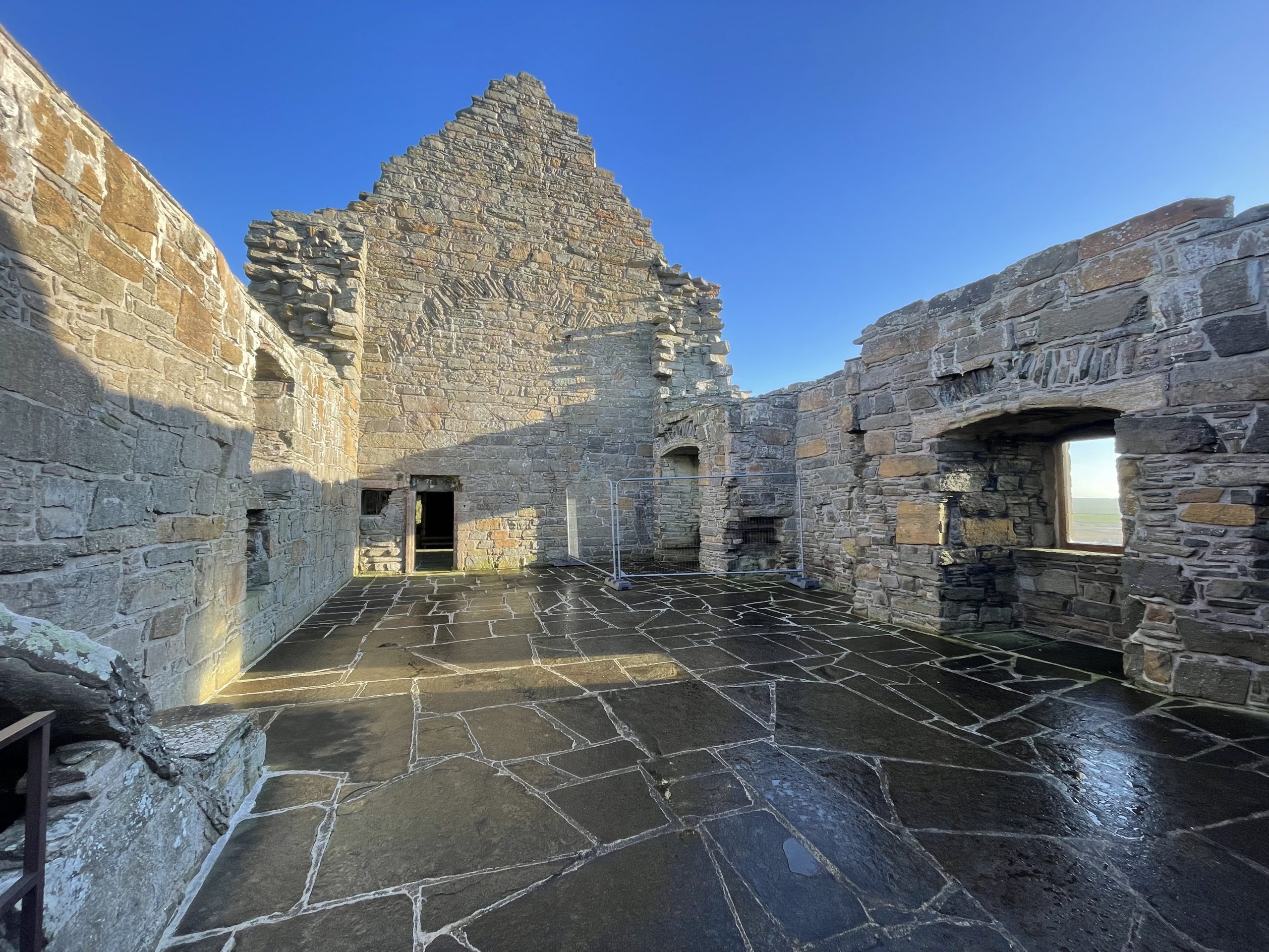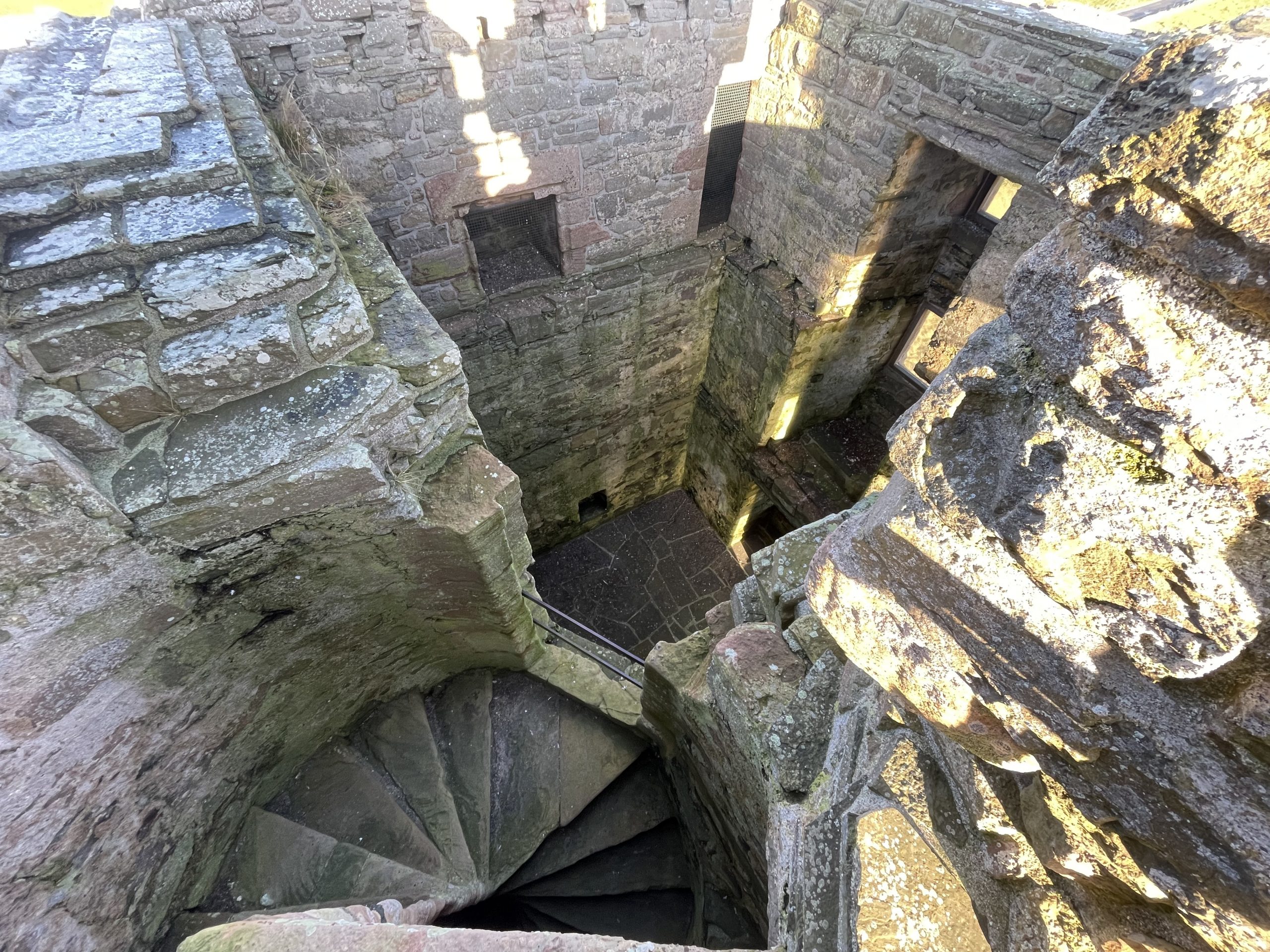We stopped off at the remains of a Broch before heading to Notland Castle. This 16th Century ruin was built for Balfour who was a support of Mary, Queen of Scots. His family’s fortunes seems to have been as changeable as that of his Queen. No wonder that it was built with defence in mind, studded with 71 gun loops (we didn’t count them). The castle is opened every day for visitors to access under their own steam, with kitchens, stairs, nooks and crannies to explore and torches placed a strategic points around the castle so you can peer into the darker recesses.