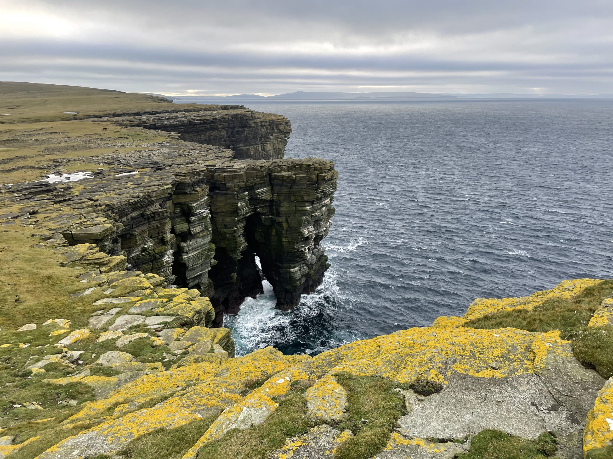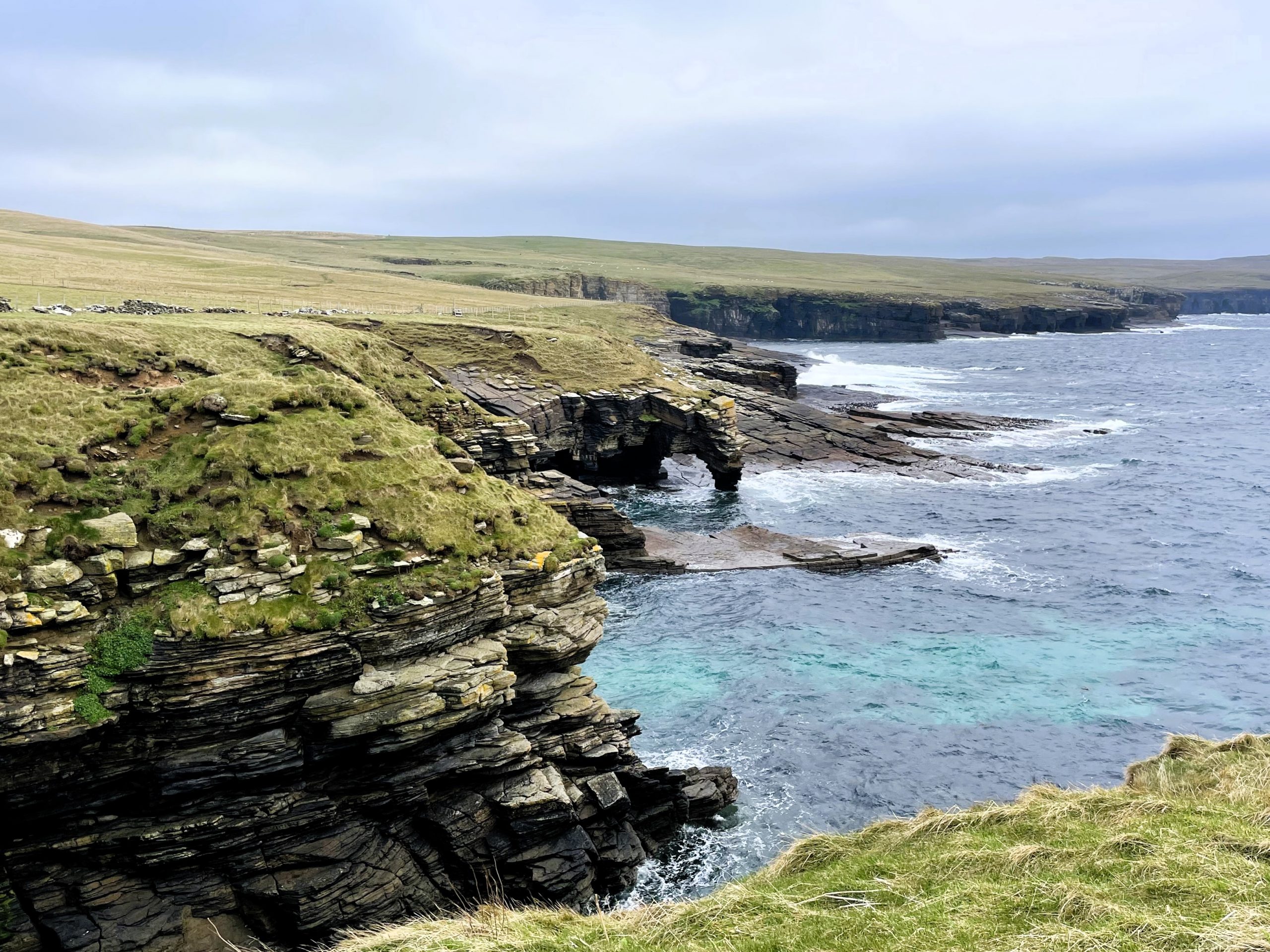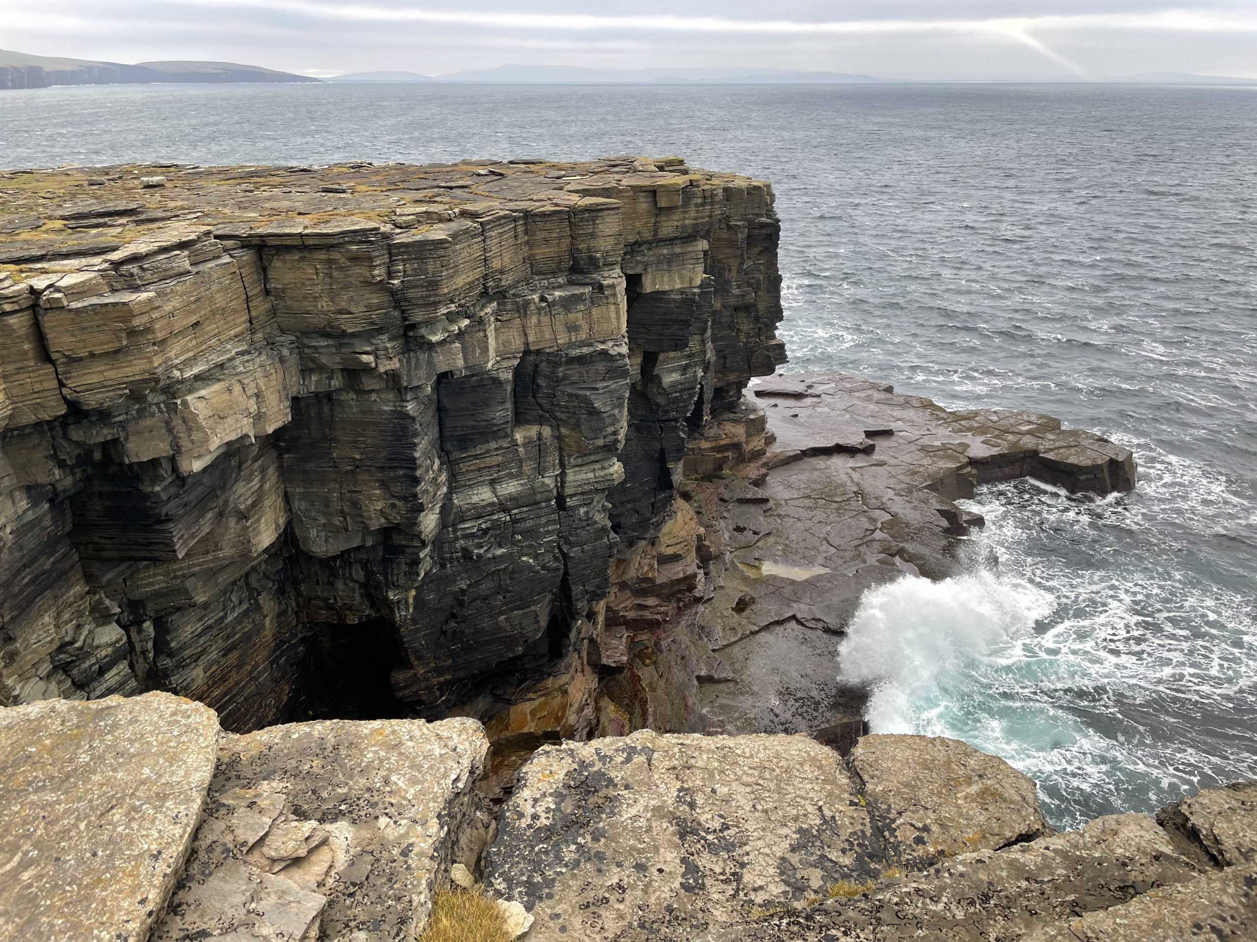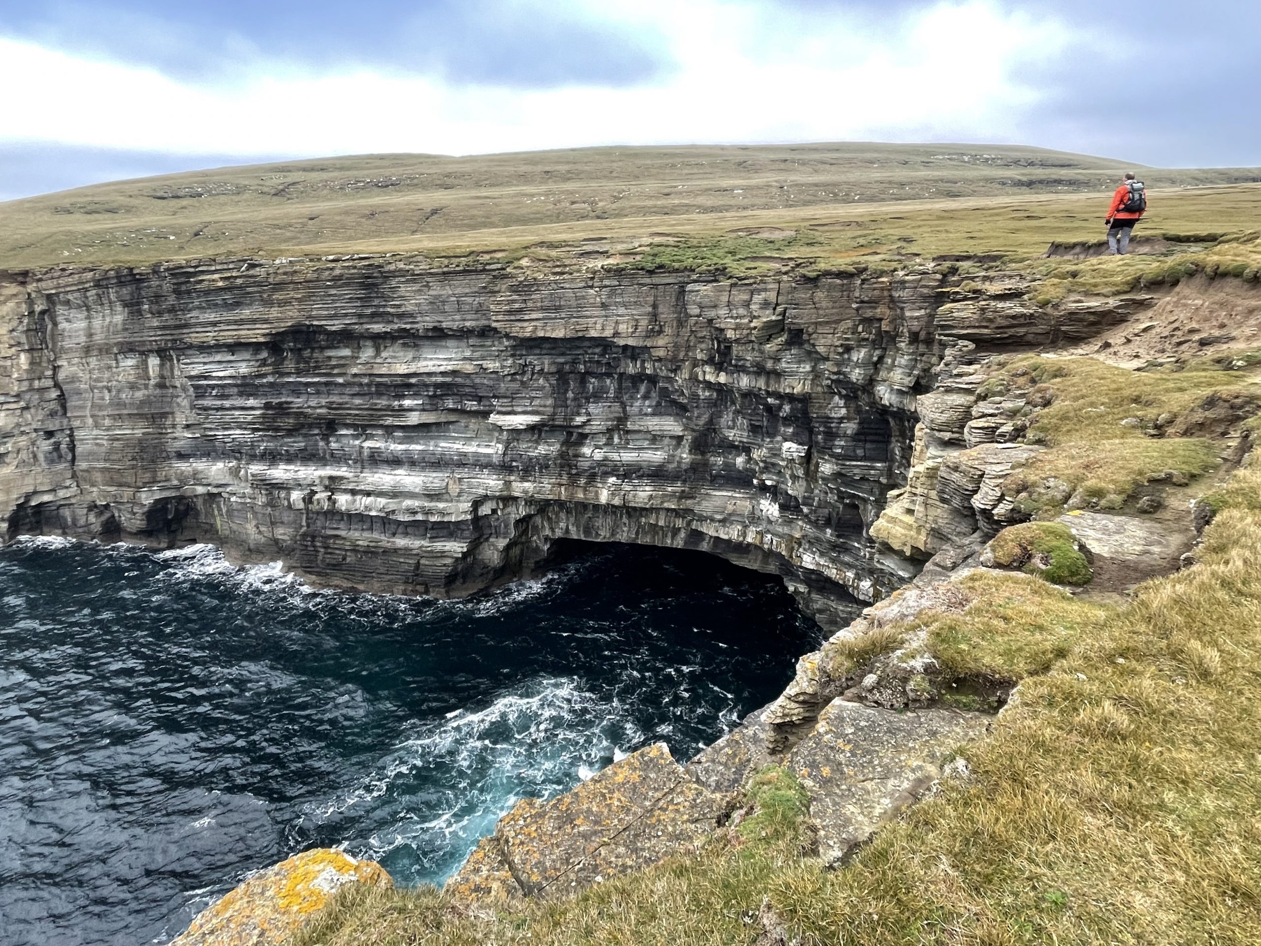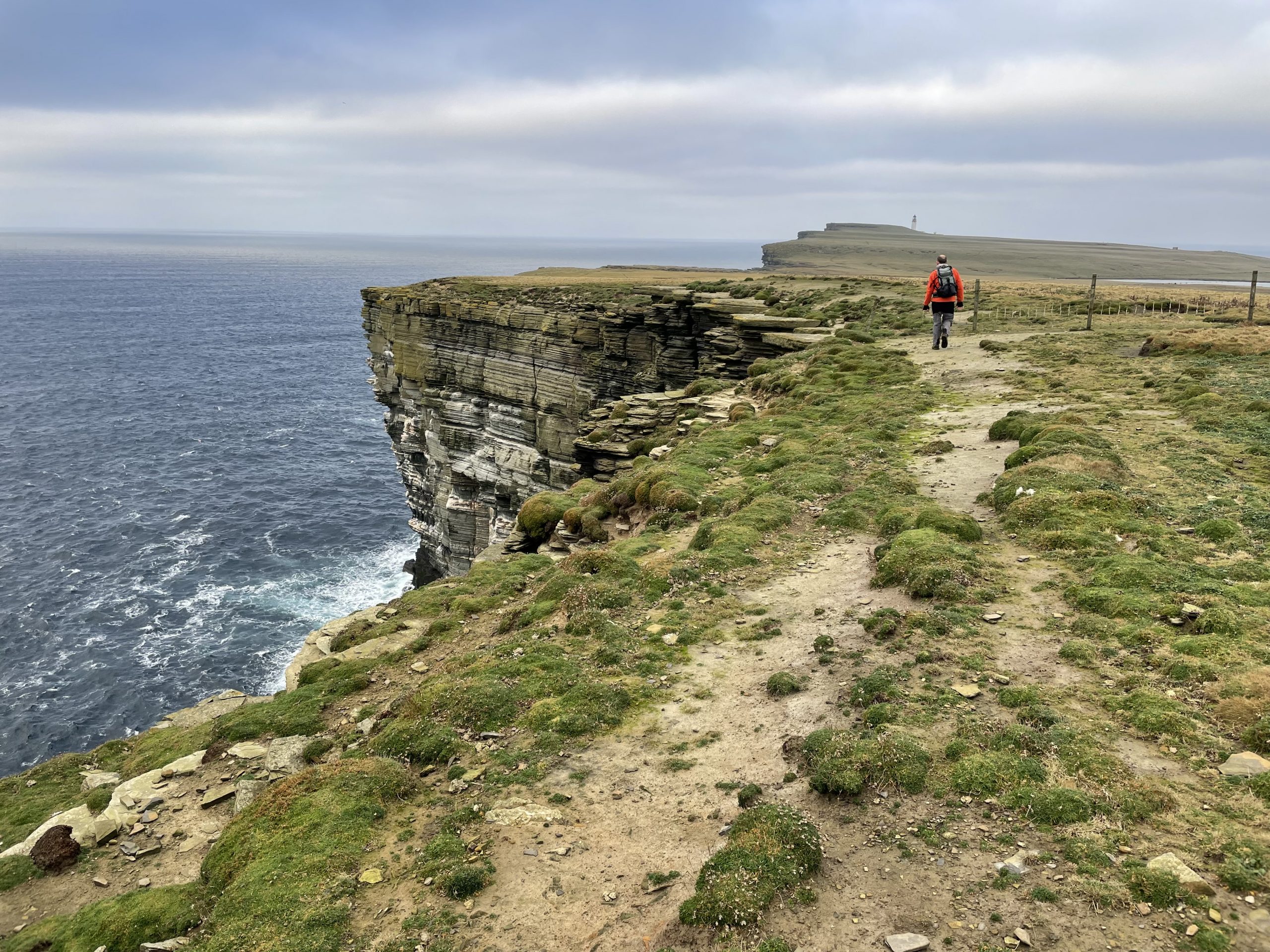 Our second day was spent walking out to Noup Head lighthouse. We cycled as far as the farm at Backarass and chained our bikes to a fence before heading out to the cliffs. Yet again we had some marvellous feature filled sandstone cliffs to gawp at as we made our way towards the tip of the headland. And yet again we were between cliffs and the soggy clifftop moorland with it’s pools and lochans. Along the way we spotted a feral cat hunting in the grass, probably from one of the farms.