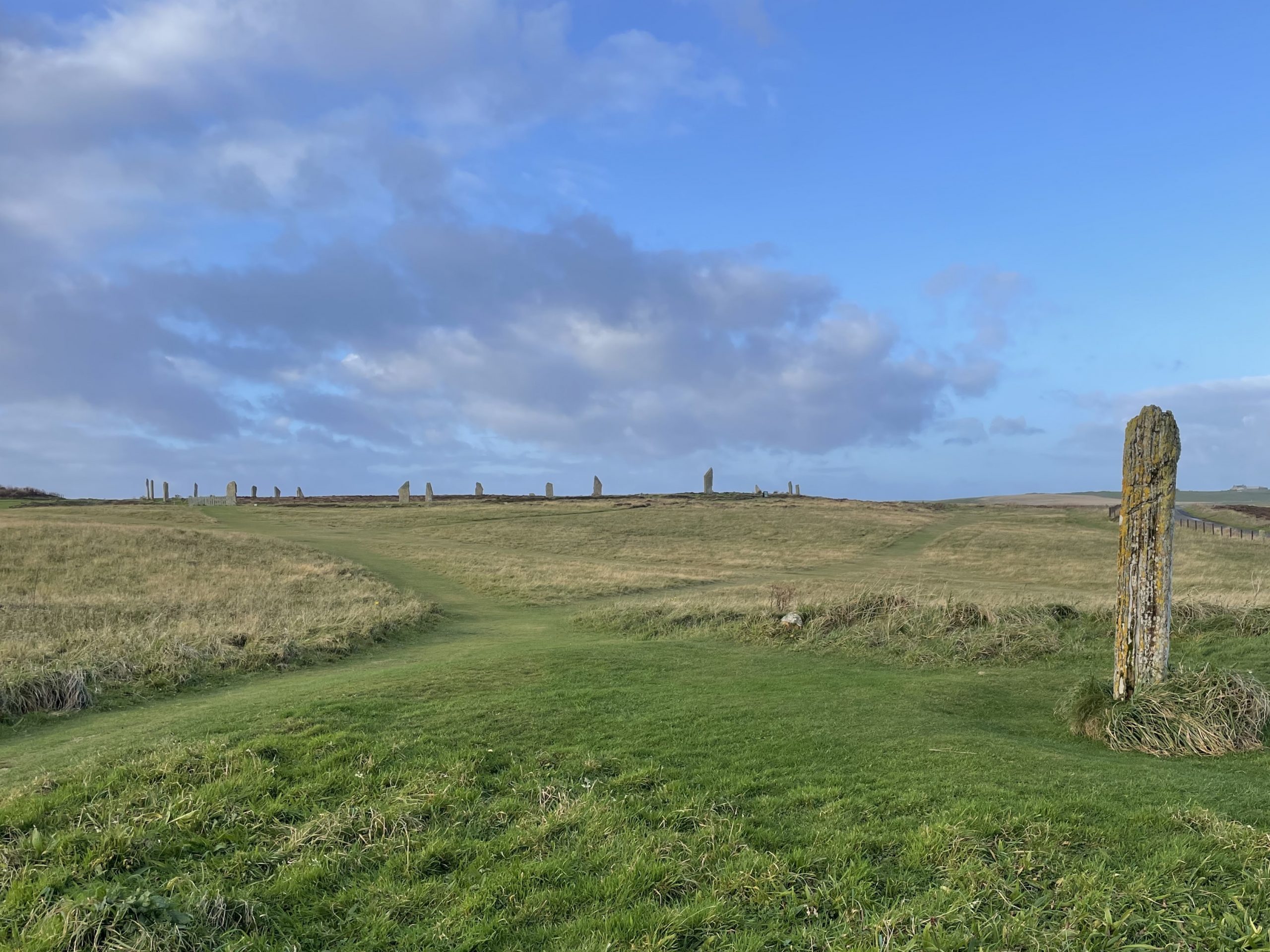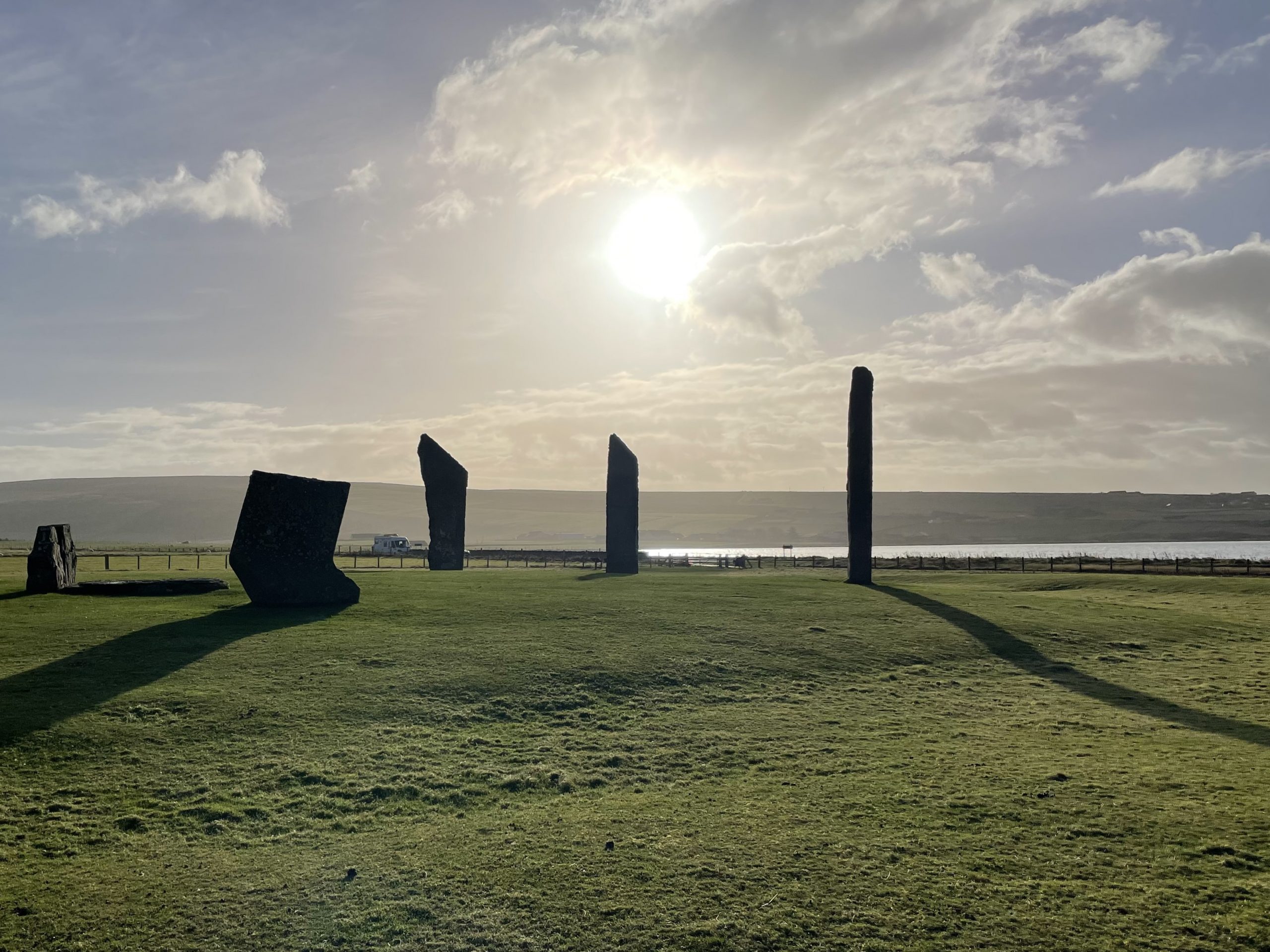 There are several sets of standing stones on Orkney and the Stones of Stenness were the first we visited. They are possibly the remains of the oldest stone circle in the UK. Only four of the original 12 stones are still upright. A couple were destroyed by a landowner in the 1800s who wanted to discourage the local population from using his land. He also destroyed the nearby ‘Odin Stone’ where locals used the hole in the stone to make binding oaths. The name of this stone is possibly a sign that Vikings used the stones for their own religious and ritual reasons many years after they were first raised.