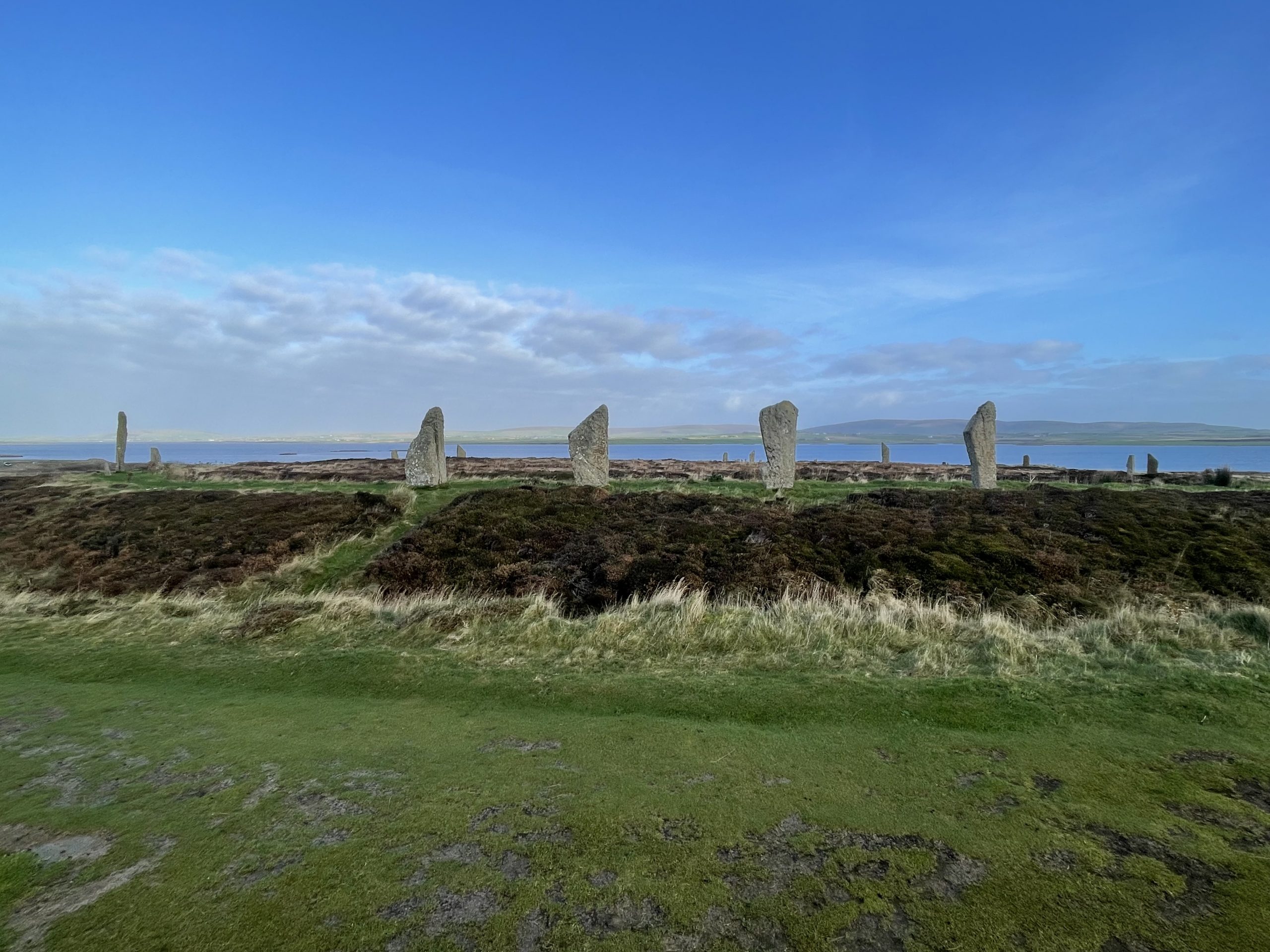 We parked Bertie at the Stone of Stenness car park and walked across the causeway to the Ring of Brodgar. This stone circle is probably younger than the Stenness Stones but larger with many more stones still standing.