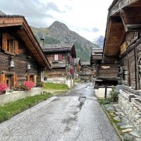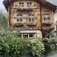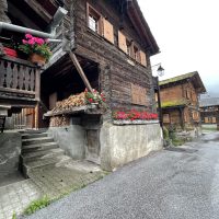 Whatever the reason, as we wandered around and explored the village on the afternoon of our arrival we were in a good mood about everything. The timber buildings were pretty, bedecked with geraniums and closer to my expectations of Swiss village buildings than anything we’d seen so far. The views were awe inspiring. The shop was well stocked and had a good bakery and butchers. Even the forecast of a day of rain couldn’t dampen our spirits. If anything we were looking forward to a day when we wouldn’t feel the pressure to do anything energetic.