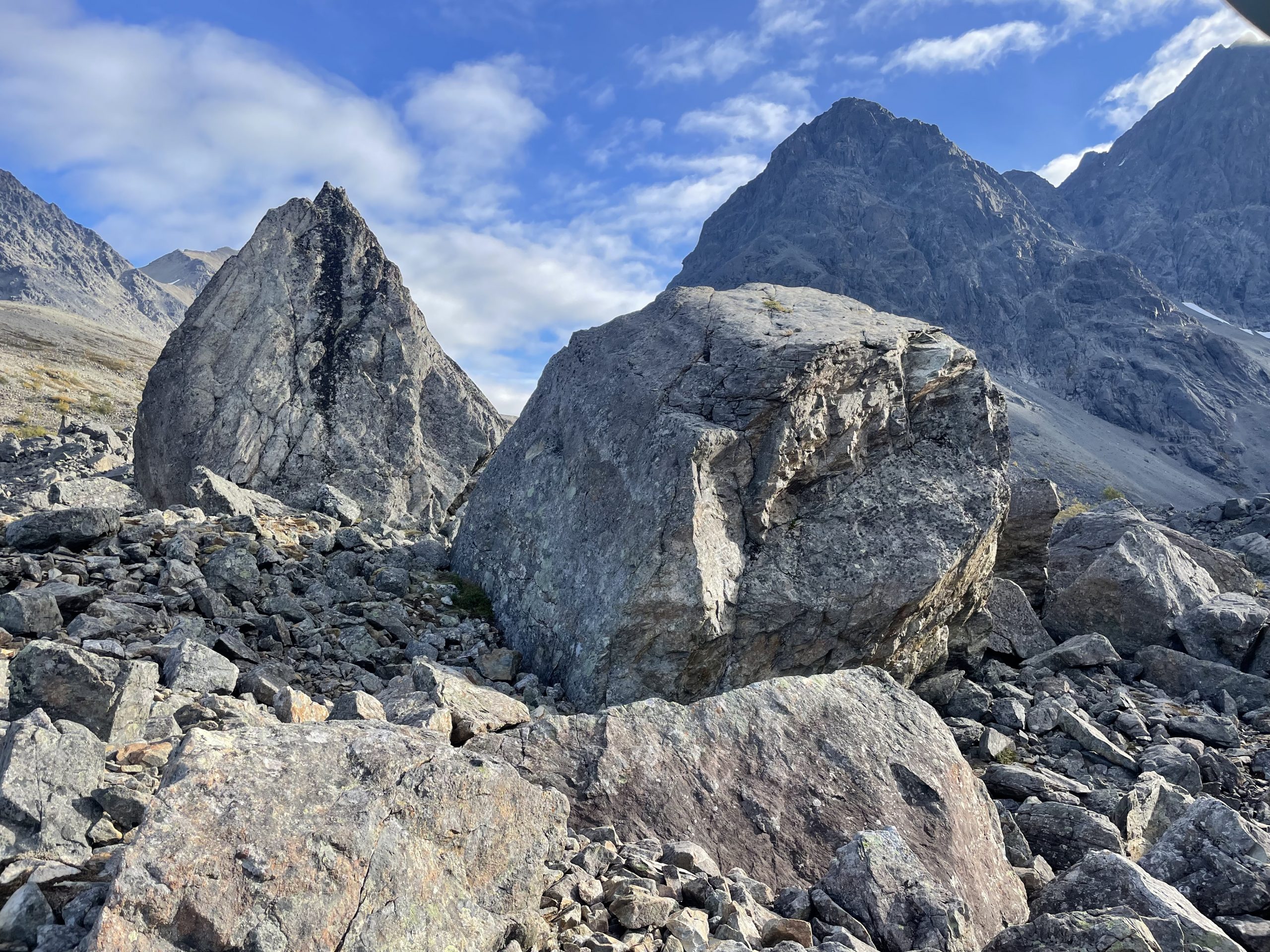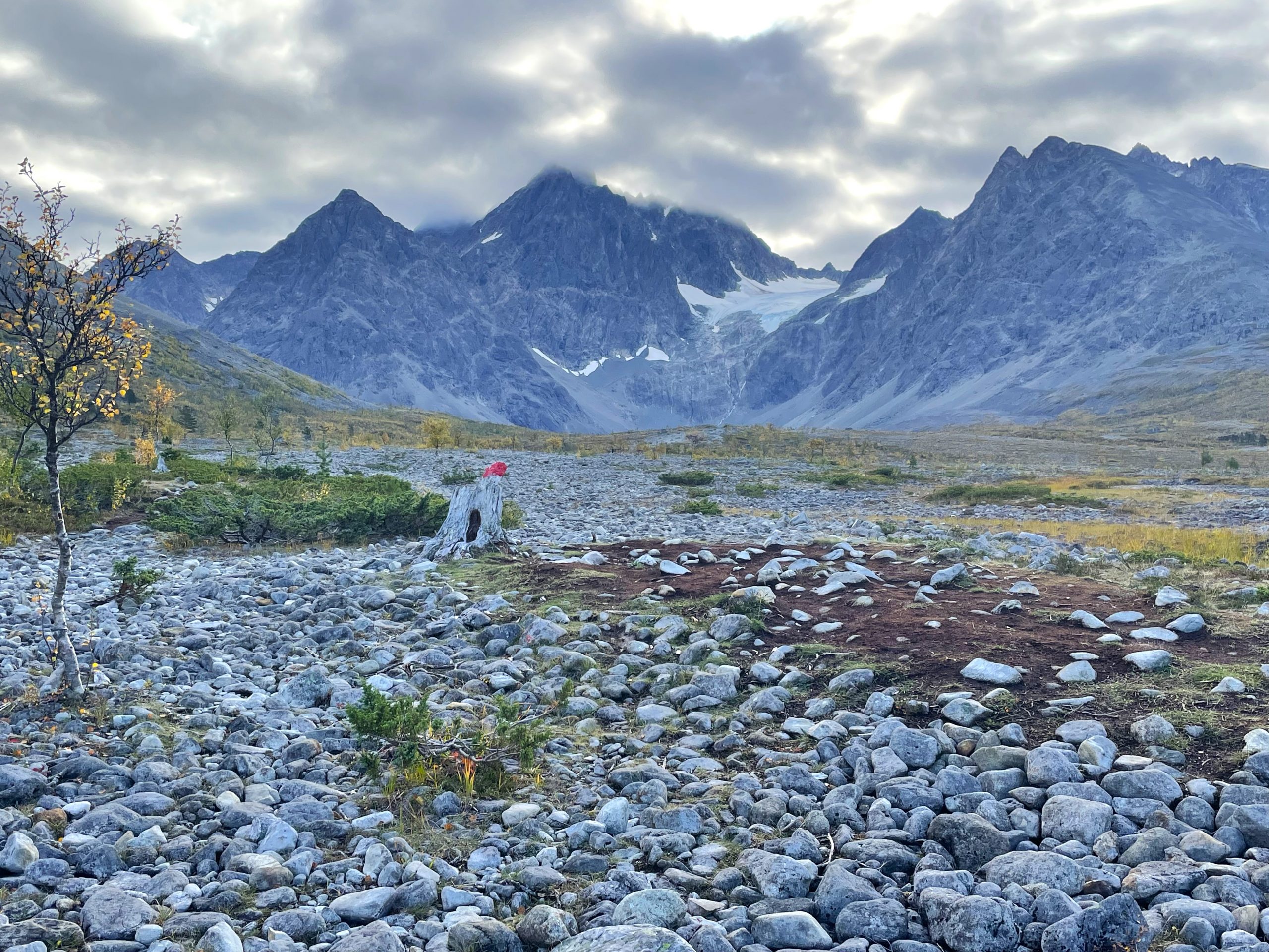The Blue Lake – Blåisvatnet – is a glacial lake at the foot of the Lenangsbreen glacier. We could see the glacier hunkering down in the shaded gap between the mountains as we set out on the walk.