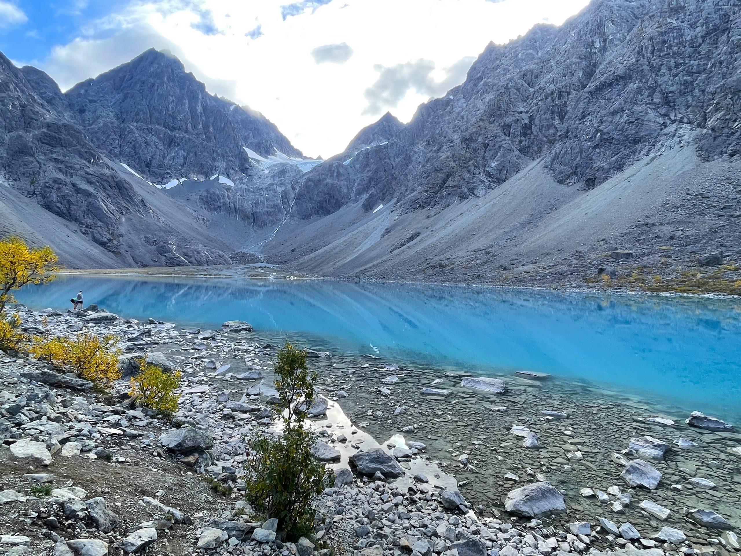 We sat and watched the lake as we sipped our morning brews from our flasks. We were amazed to see the flickering shadows of fish swimming in water that looks toxic. The blue is actually just light relfecting from the fine silt suspended in the lake, ground out of the mountains by the glacier.