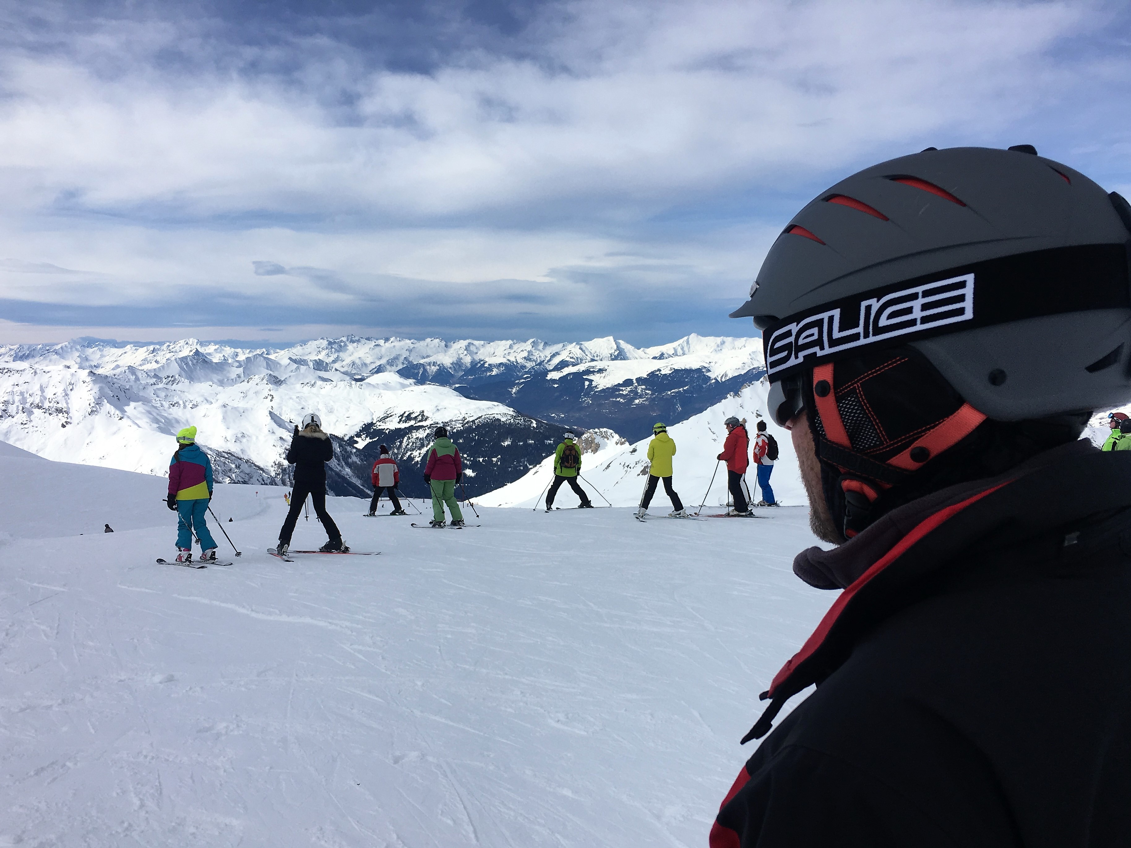 Bourg Saint Maurice gives access to the Les Arcs ski area, and from there you can get access to the wider Paradiski area which includes La Plagne. We got settled in at the campsite on the Thursday amongst a bevy of British, French, German and Dutch vans and caravans. A few housekeeping chores were done and we still managed to squeeze in a day’s skiing on the Friday before Aaron arrived on Saturday lunchtime. The snow conditions were pretty poor at the lower levels and the day was overcast. We cruised around the blue runs without an inkling of where we were as the clouds hemmed us in. Only luck got us back to the start.