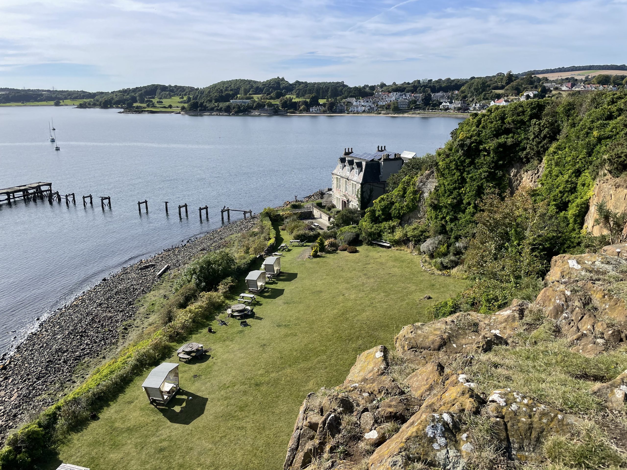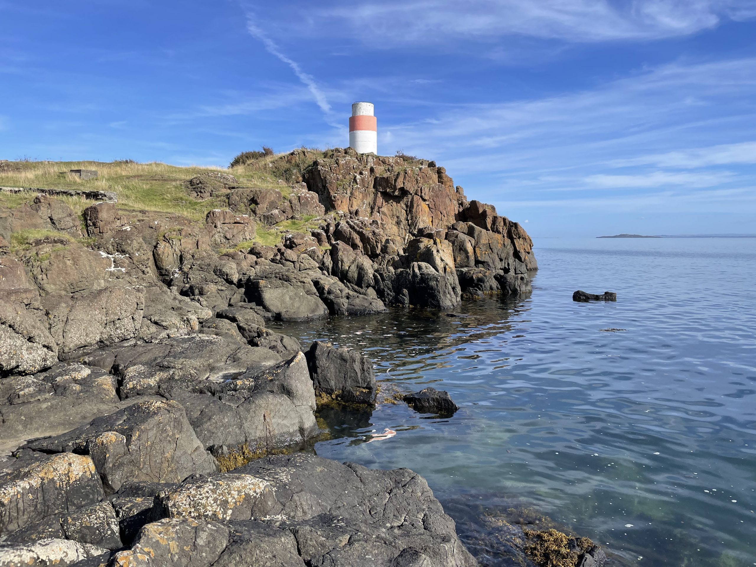 After our swim we did a quick circuit around the local area, walking around to the lighthouses on Hawkcraig Point, their automated flashing lights still a working signal to passing boats. A noticeboard informed us about the area’s history as an experimental hydrophone base and seaplane station during the first world war, There are patches of concrete and a dilapidated pier, but little else remains of this early attempt to foil the German U-Boats.