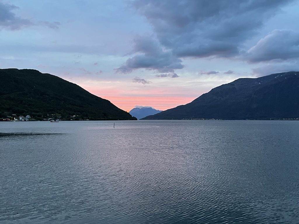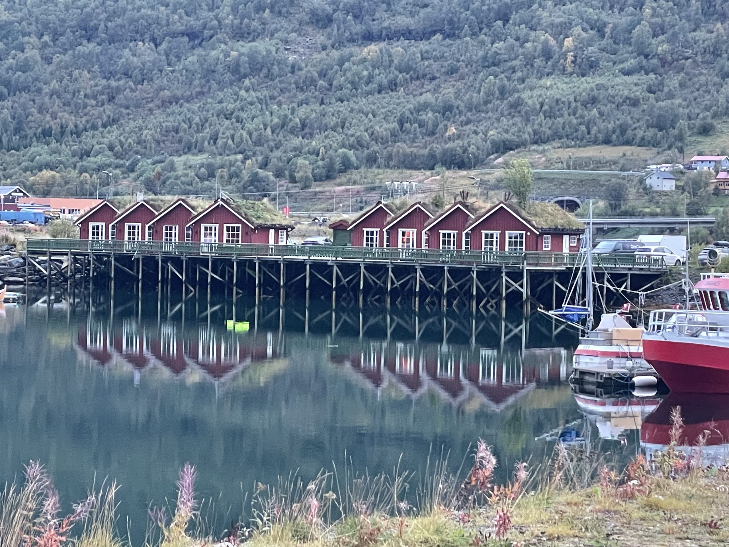 After stripping off our muddy outer layers and dumping them in the bathroom we drove around the edge of the fjord to the campsite where we were to spend the next couple of nights. It was unstaffed, but as we’d already booked we pitched up all alone on the site. Later a couple more motorhomes turned up and several people in cars booked into the small hytte (cabins) on site.