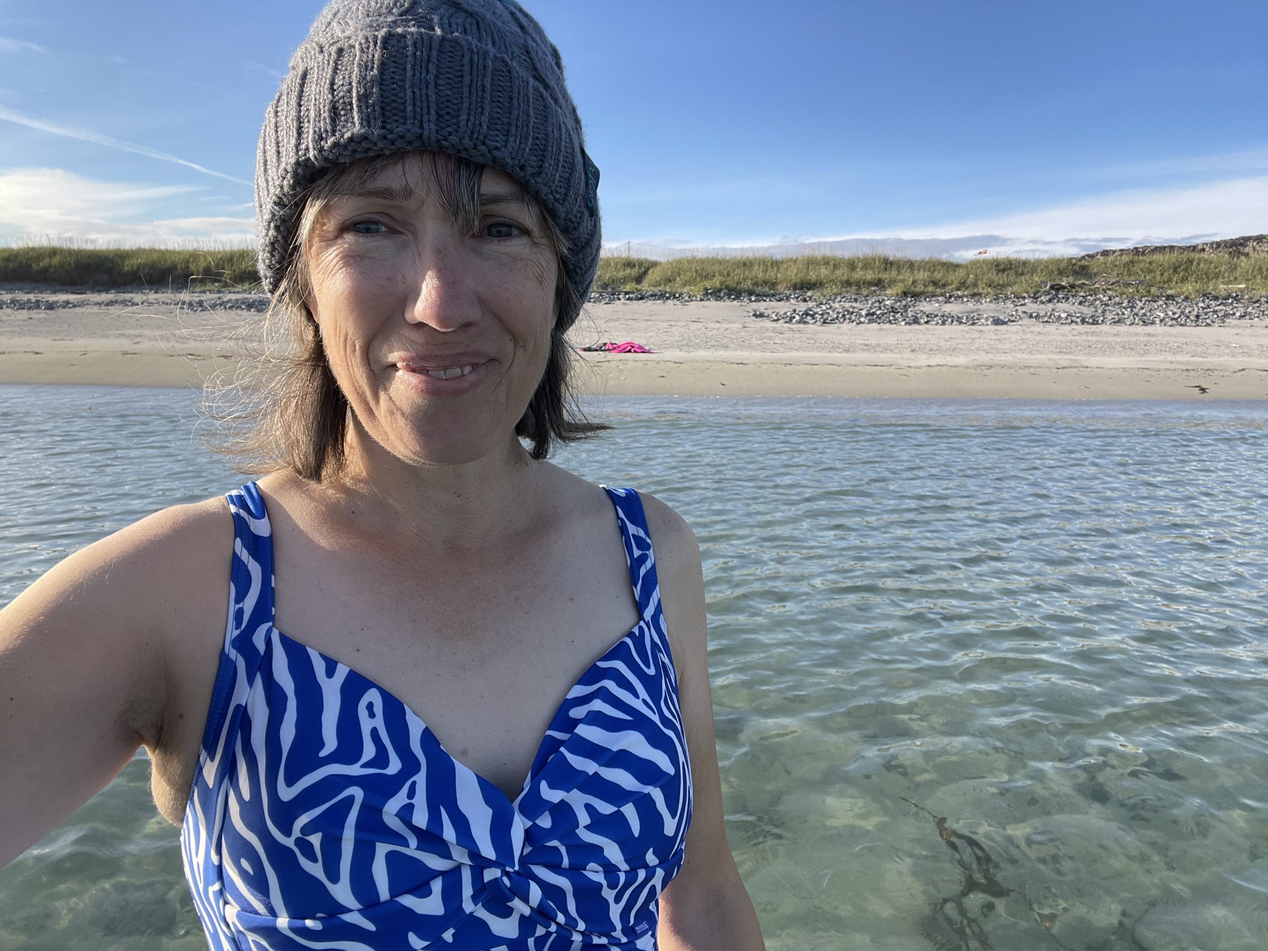 Paul wasnt feeling very energetic after we’d got parked up so I got into my swimsuit and dry robe and walked down to the sandy beach we had passed on the way into the village. It was only a 10 minute walk and the sea was calm and inviting. I left my stuff on the beach and made my way into the water where I swam across the bay a couple of times. I’m not an expert swimmer, you wont catch me doing a swift front crawl. I like to bob along sedately with my head out of the water – in this instance with a woolly hat on top to keep me warm. A group of tourists in puffer jackets walked down onto the beach and watched. I really thought sea swimming would be more of a thing here but it only seems to be me so far.