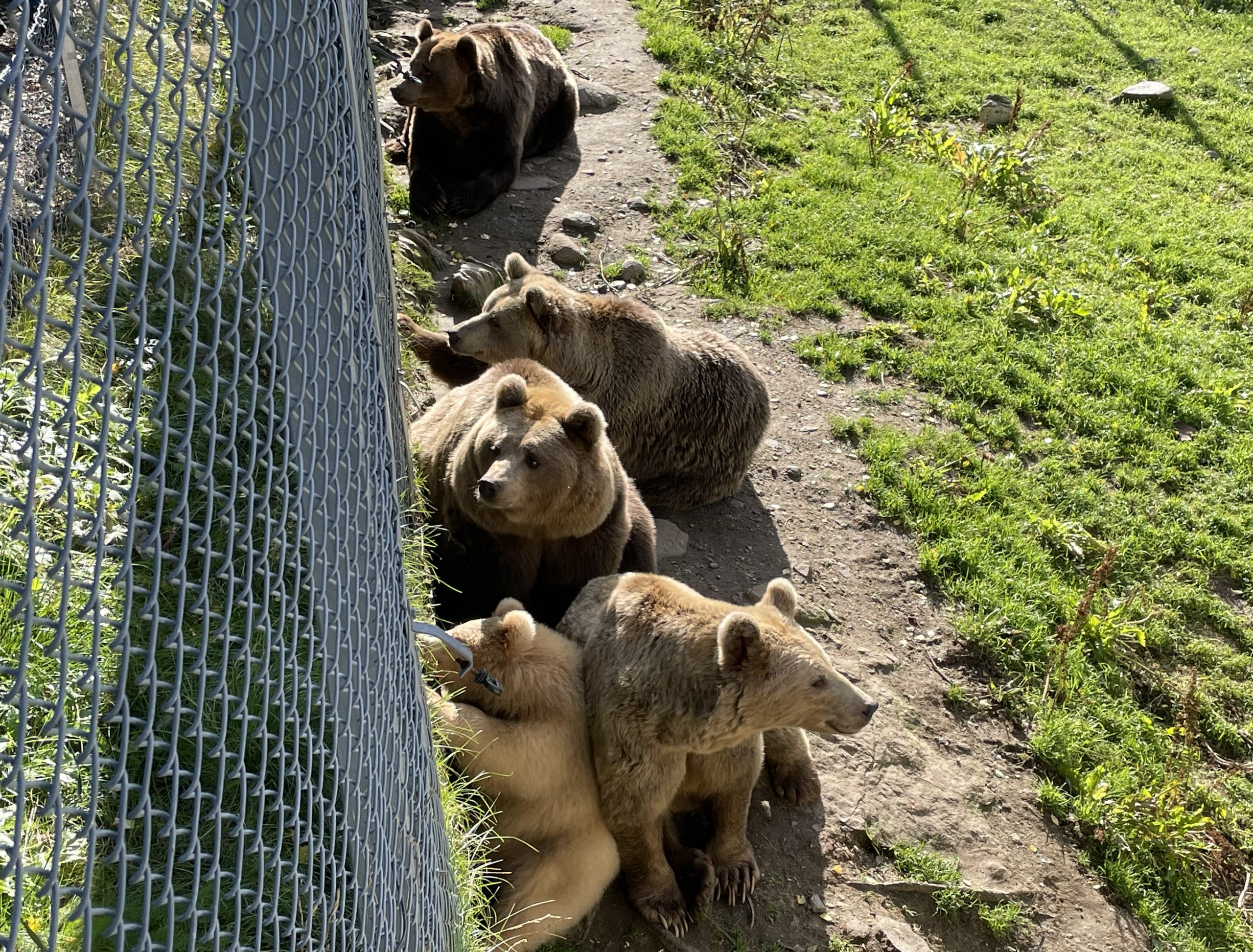In the bear enclosure all of the bears were ready and waiting to be fed, lounging against the wall in the central part of their enclosure. We could see that one of the bears and one cub were albinos with a paler fur and pink nose and ears.