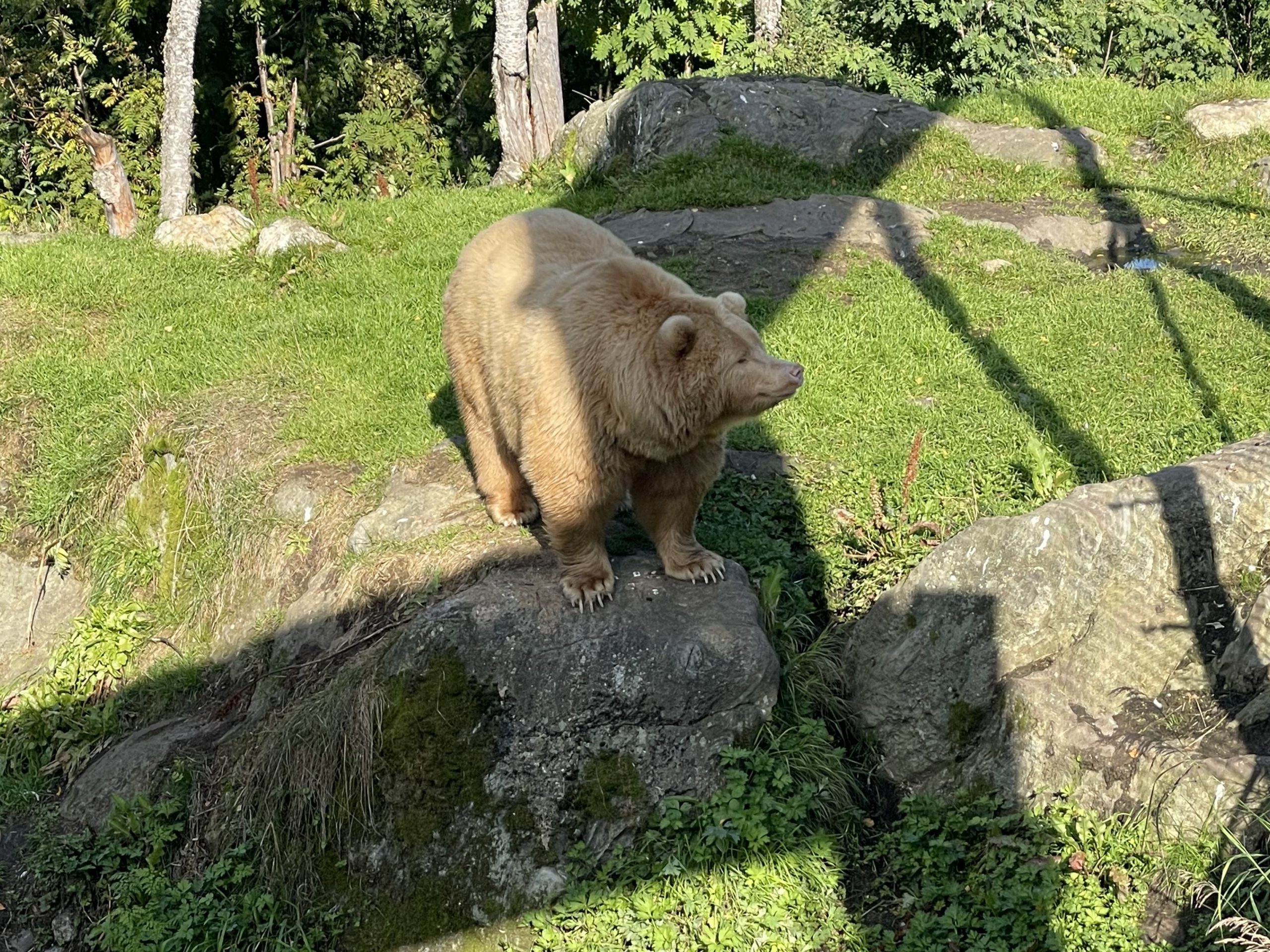 Paul was on super-spotter form as he next spotted wolves and wolf cubs in one of the wolf enclosures and then a bear on a distant slope far from the main enclosure. We were disappointed we didn’t manage to see a Jerv (aka Wolverine). We later found out that, in summer, mornings are the best time for spotting the animals in their enclosures as they often retreat into the shade to sleep in the warmth of summer afternoons.