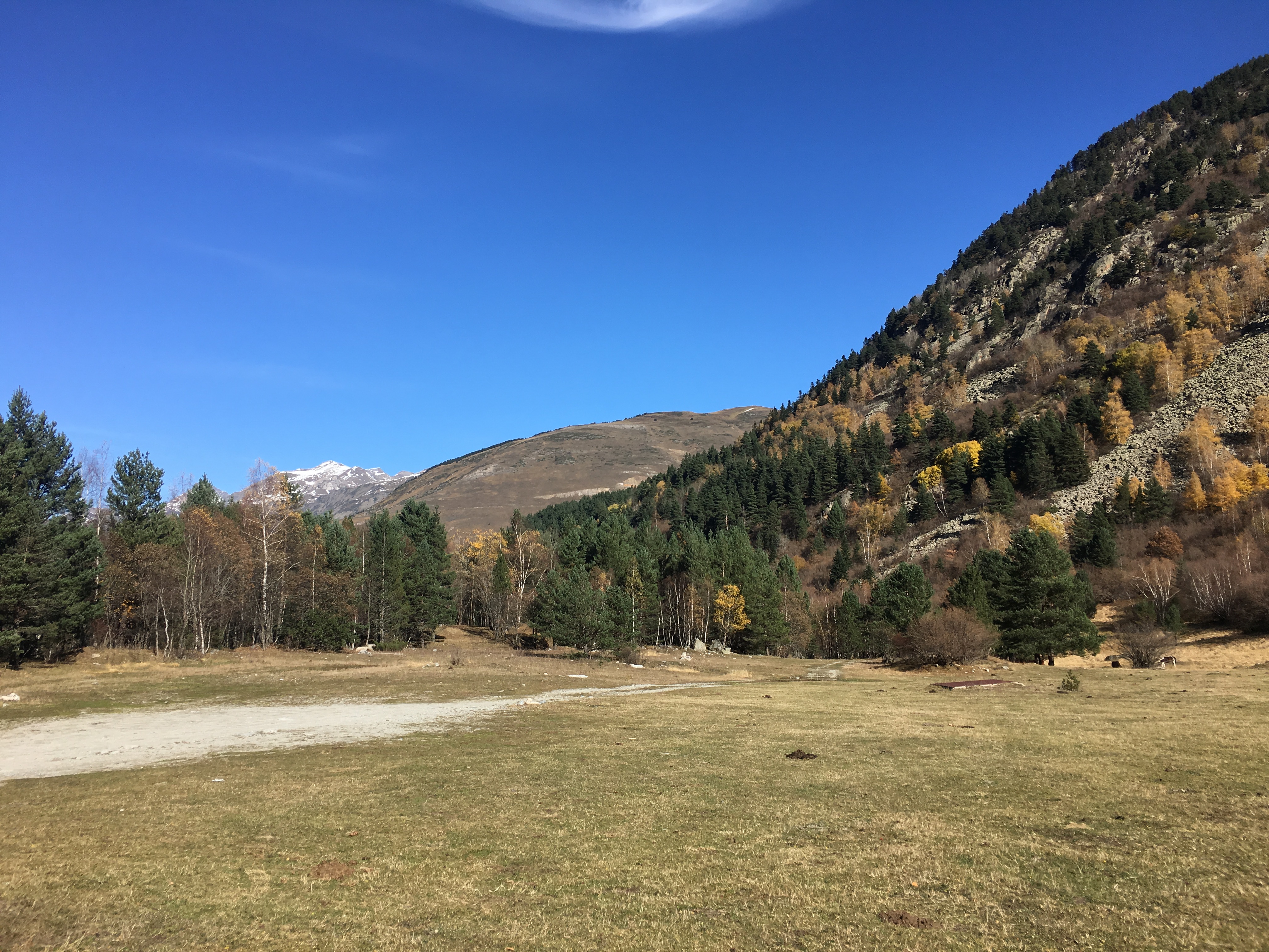 Down in Salardu the motorhome parking was in a rough gravelled area next to the river with good views of the mountains. A bit of undeveloped ground that was being put to good use from our perspective. A number of vans were obviously there on a long term basis, being used by workers or just parked up by locals. There were no services but it was flat and there were water fountains in the village where we could fill up our bottles.