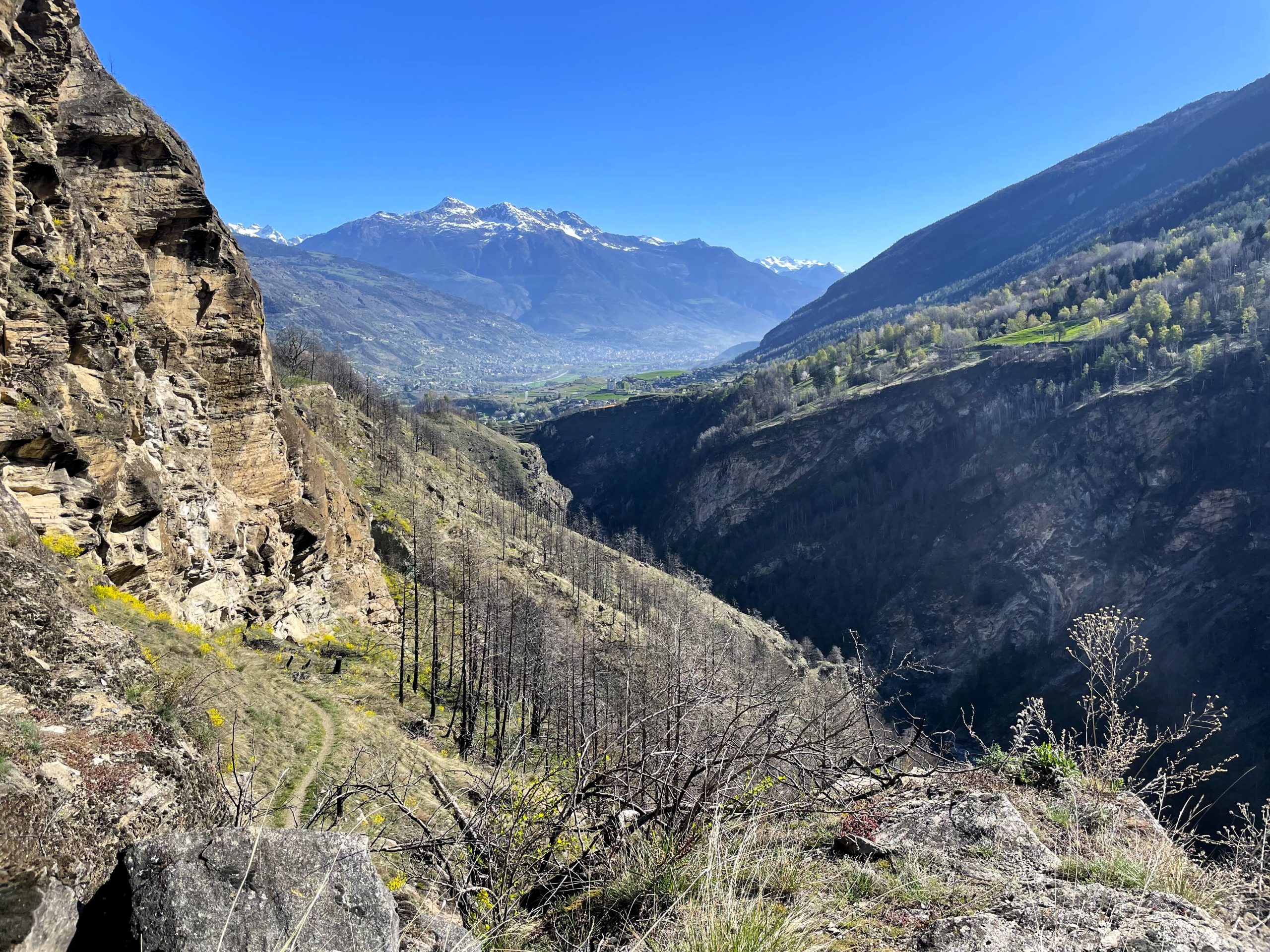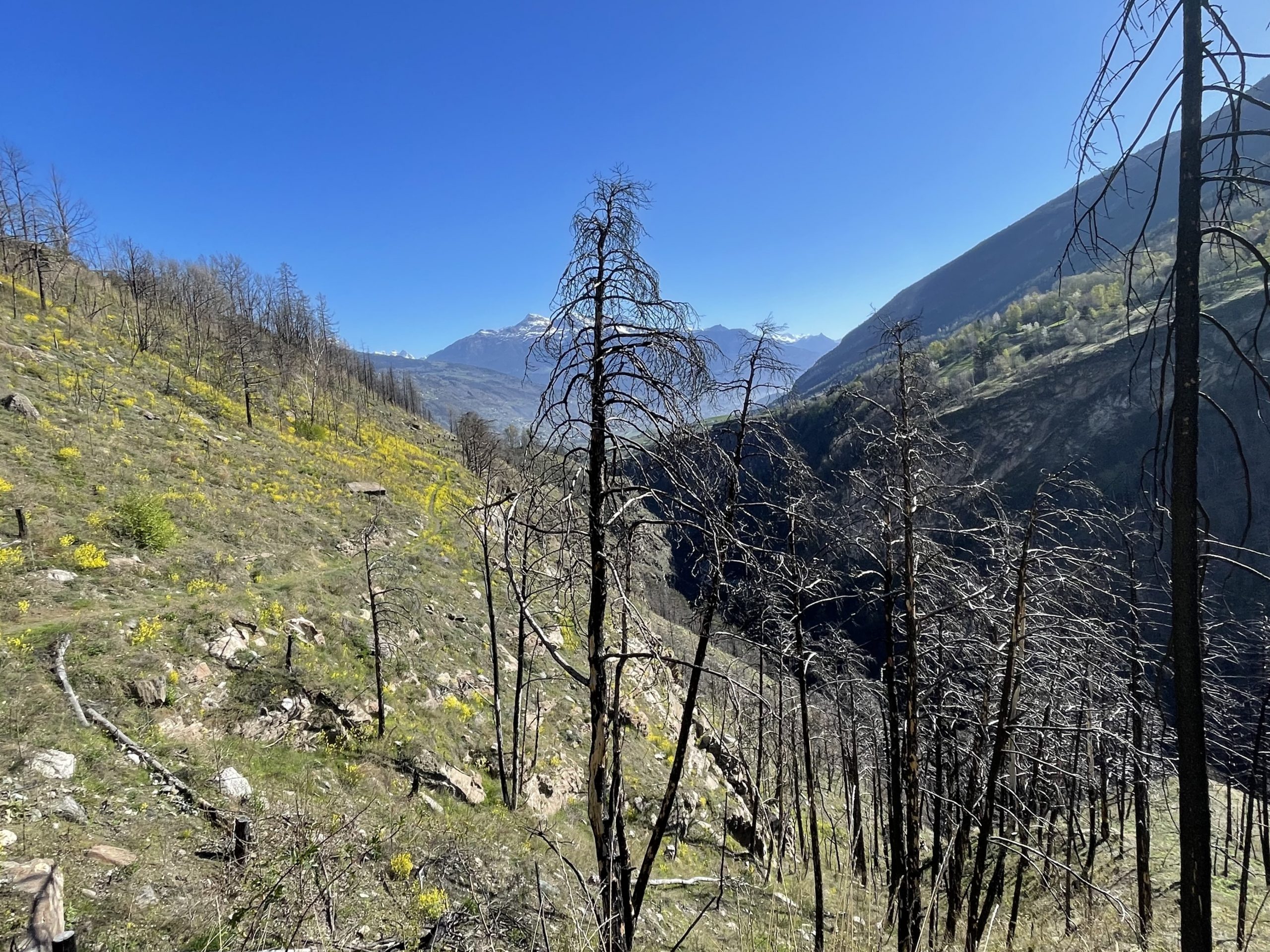 We started with a climb up up the side of the valley and then a traverse high above the river and road that we knew were below us but couldn’t see due to the steepness of the cliffs. The recent hot sunny weather meant that the path was dry and dusty. We were accompanied by the rustling of lizards in the grass as they darted away from our footsteps. Once the path would have taken us through woodland, but today we were walking through the blackened remains of trees that had been burned in a wildfire the previous summer.