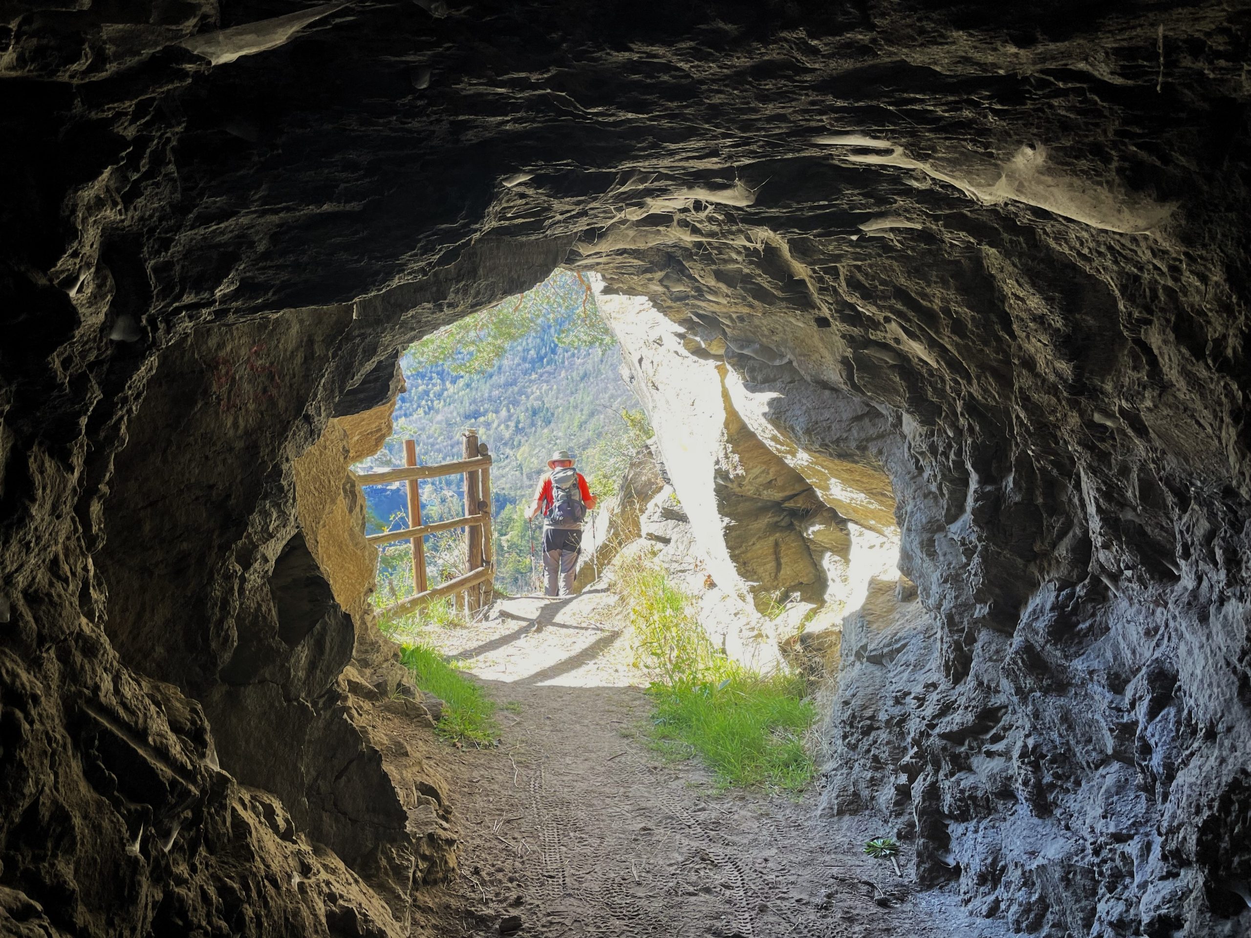 As the surroundings became more rocky we could see a cascade of water dropping from a small hydro electric plant high above us The path routed us through a tunnel behind this stream so that we didn’t get a clear view of the waterfall until we were on the way home. The cool tunnel was a welcome relief from the heat, even more so when we found the window carved into the rock allowing us to feel the water’s spray. We tried to find out what this tunnel had been built for, but couldn’t find any information, we can only surmise that it was part of the hydro scheme which had possibly diverted or changed the nature of the water falling from above.