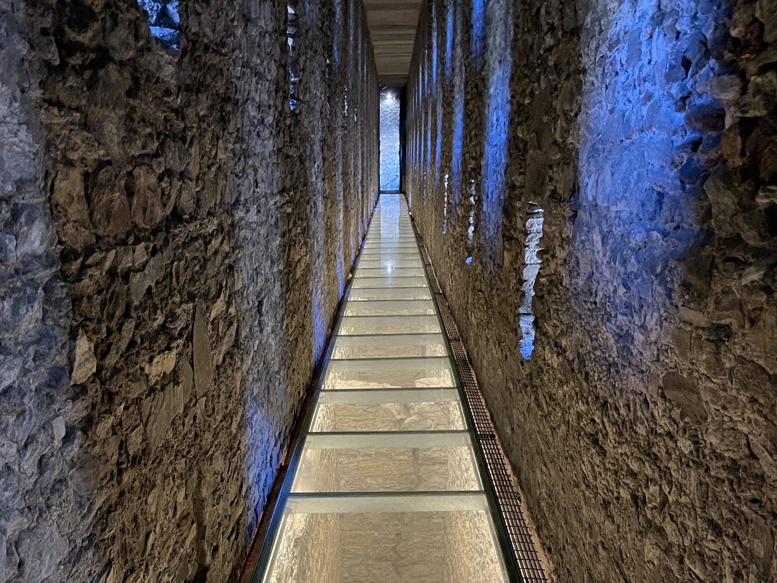 Anyone can walk across the top using the original water channel. The original pedestrian thoroughfare is below the aqueduct, inside the bridge. We paid €5 each to walk through this internal corridor. Glass floors gave us views into the internal structure of the bridge, the empty spaces beneath us designed to make the whole structure lighter.