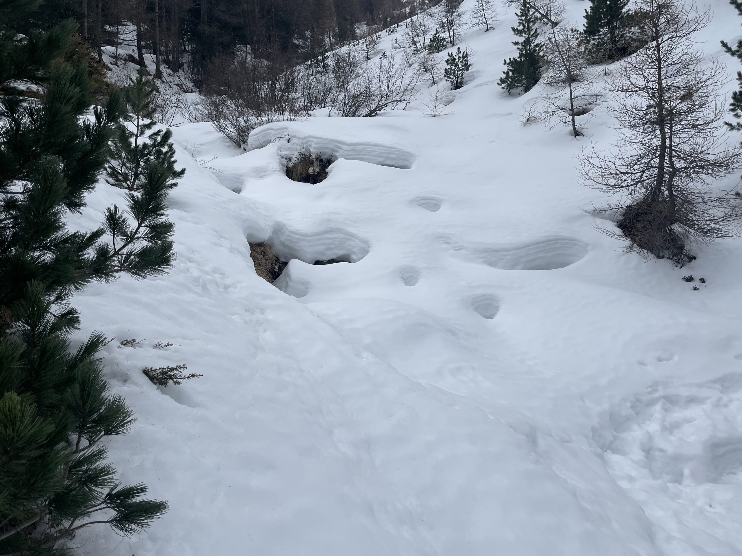 The paths around the waterfalls were already icy and we had to don our microspikes to get higher up into the hills. As we ascended the snow got deeper and we switched to snowshoes. It was hard going and we decided to turn around at the Alpe di Loie, there was just so much snow and we could see clouds gathering in the valley, promising more.