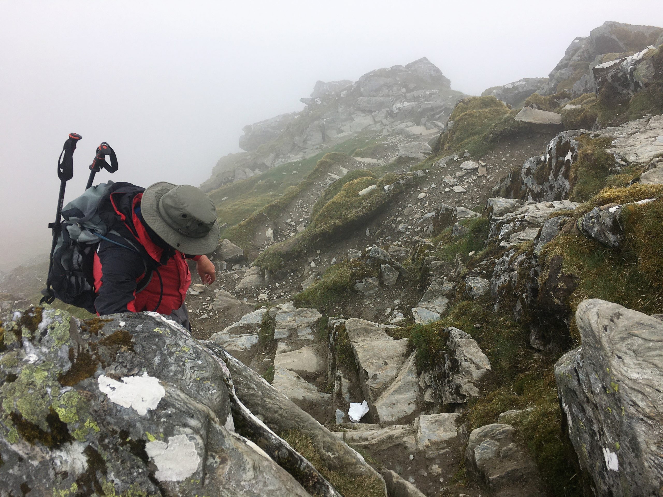 From the car park we could see the cloud lingering on the summit but we were hopeful that it would clear as we ascended. The climb up the tourist path started as a warm and muggy affair through pretty woodland, but as we climbed onto the open hillside and ascended the shoulder of the mountain the cloud descended and from about 600m we were enveloped in it’s misty claggy dullness. It’s a busy mountain and so we ascended past family groups (including a delightful child who lay in wait to throw stones at us), and were ourselves overtaken by groups of fit young things. Then we started to meet many descending parties in the mist. It was only on stopping for a cuppa that I checked the map and realised we were nearly at the top.