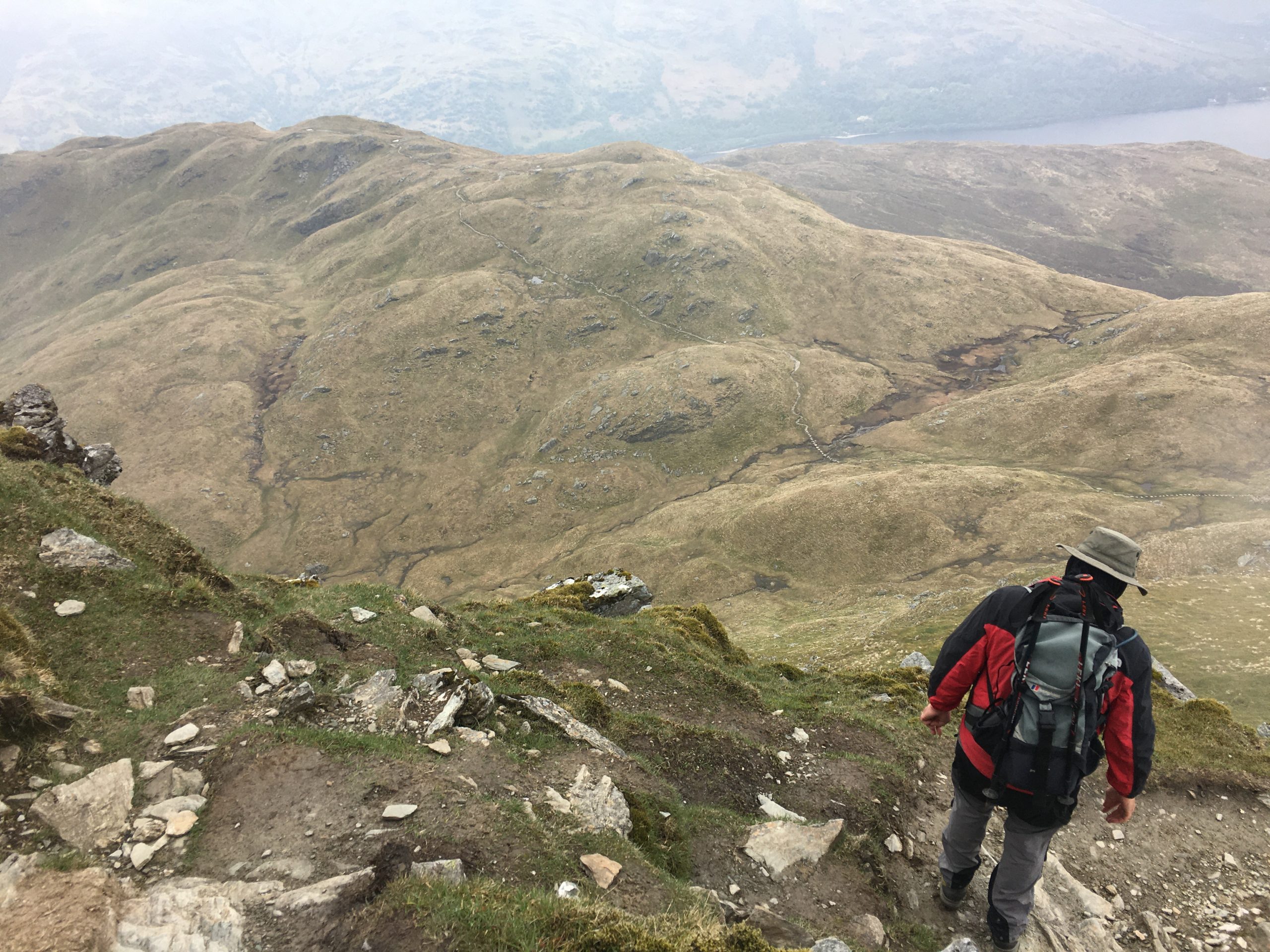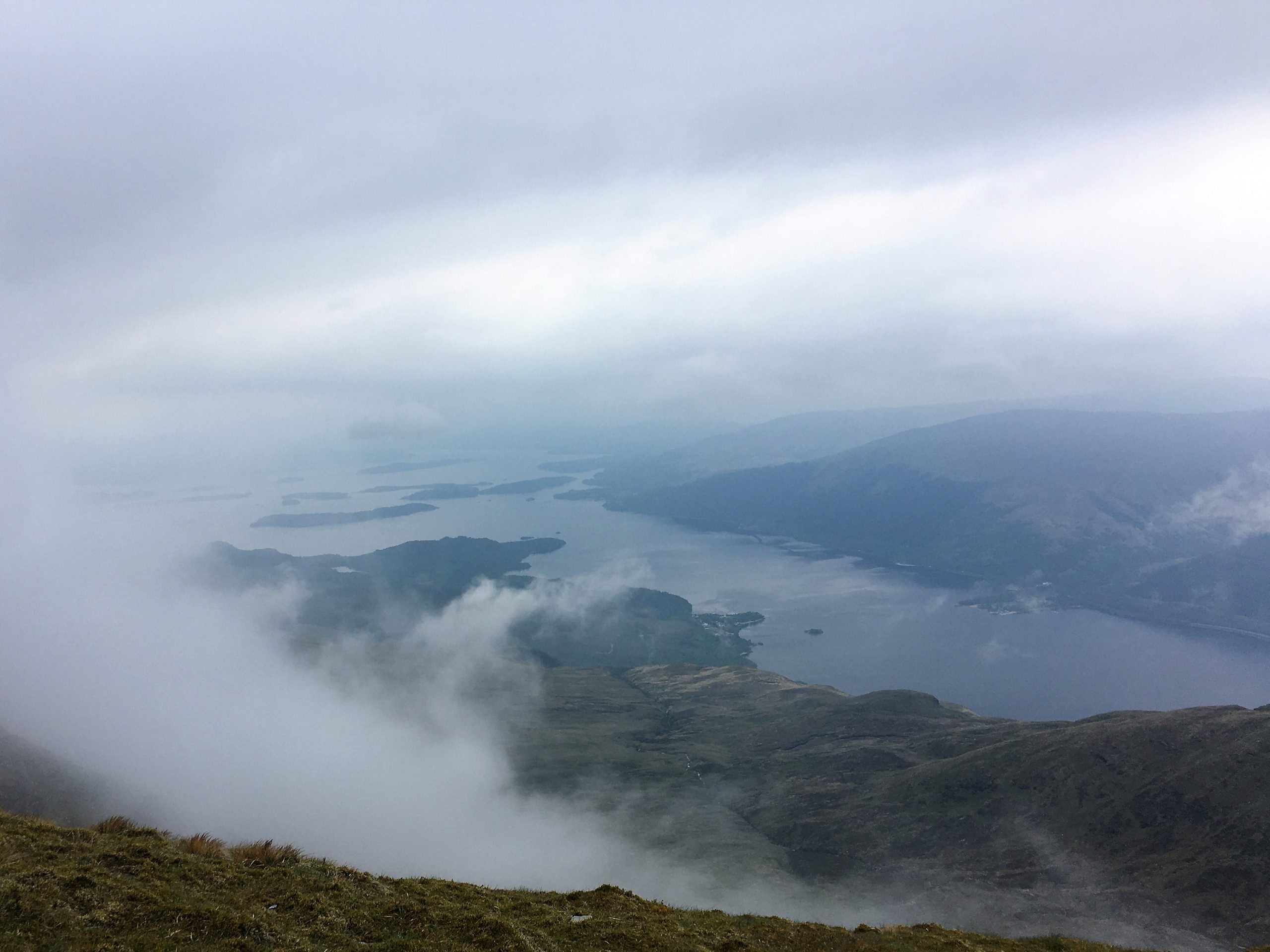 When we reached the trig point we were resigned to a cloudy descent, we made our way to the past the summit onto a path far less trodden that would take us down a short section of very easy rocky scrambling onto the Ptarmigan ridge. Paul called out to me as he spotted what might have been a view in the swirling mist. A surprise view of the steel grey loch, studded with darker grey islands, opened up briefly below us, It wasn’t much of a view but it was more than we’d seen for a while, and as we descended we saw more breaks in the cloud, giving us spoiler glimpses of the path ahead and the view below.