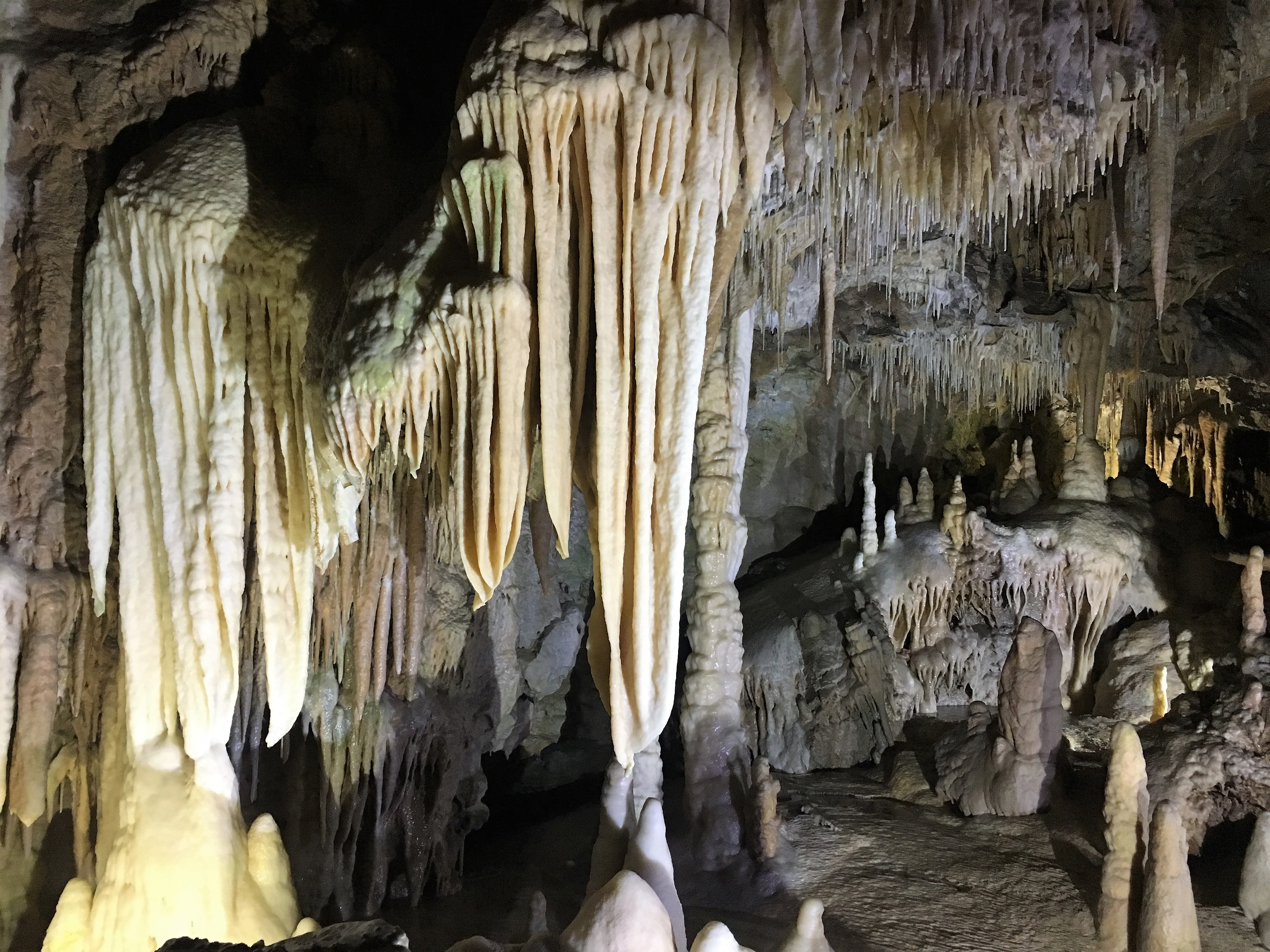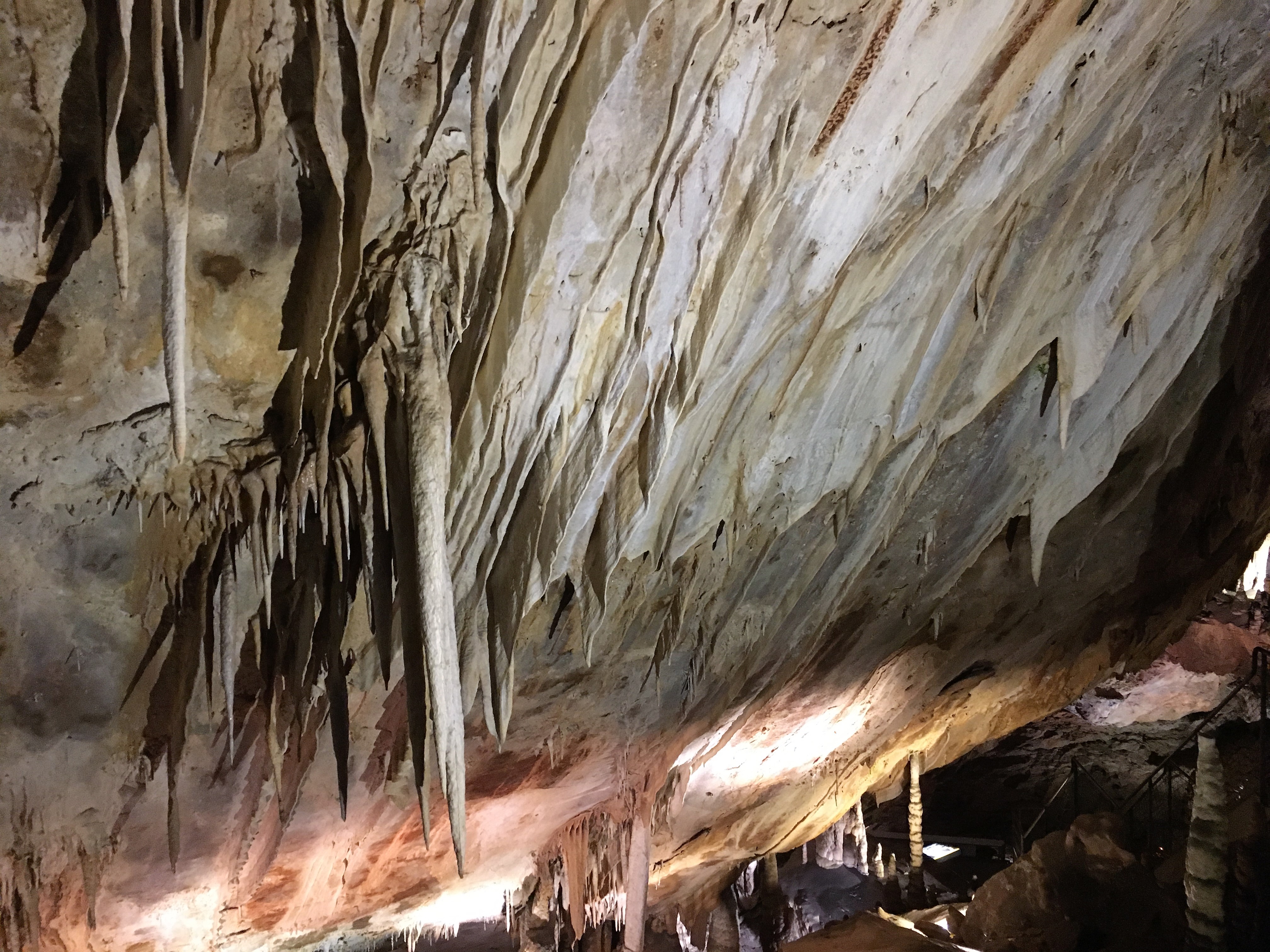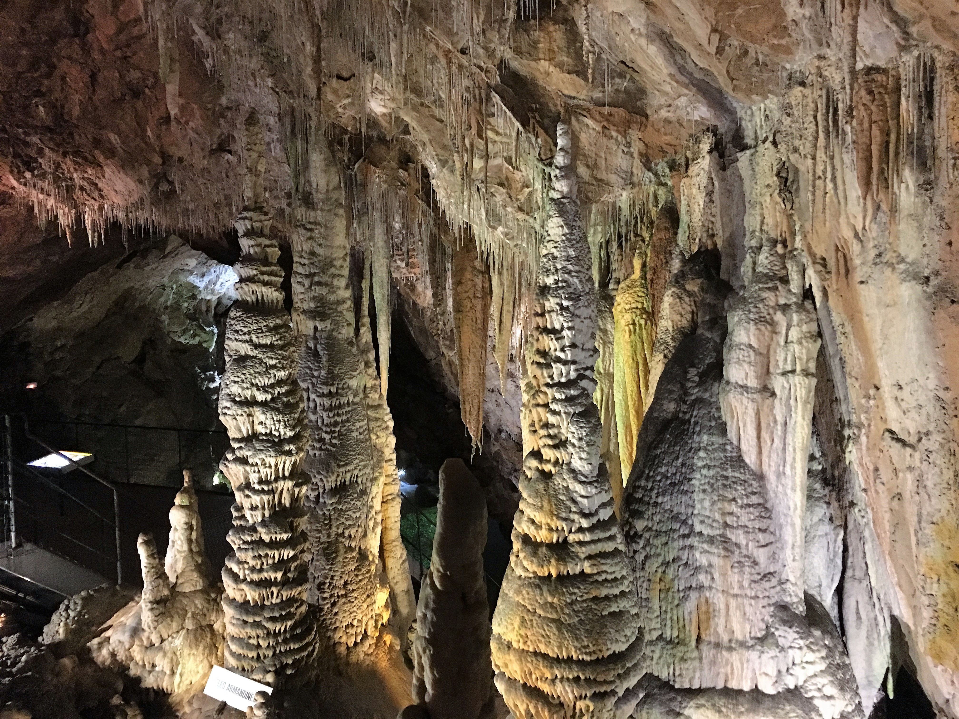 We payed our €10 each to get into the caves, rather an expense for us, and proceeded through the tourist tat section of shopping and café into the caves themselves. The entrance way was not very dramatic and we looked at each other as if to say ‘what have we just spent our money on’. The tunnel showed the evidence of drilling by whoever had opened it up for tourists and was just rather drab brown rock. Soon, though, we were into spectacular large chambers with all sorts of formations. Unlike many caves we didn’t have a guided tour but were left to our own devices to explore the caves and read information boards, this was a blessing as it was the French school holidays and children were running around having a great time with the UV torches they had been given. We could let them get ahead of us and then take in the surroundings in peace and quiet. It must have been great for the kids too, not having to be quiet and listen to a tour guide, it definitely reduced the whinge factor.