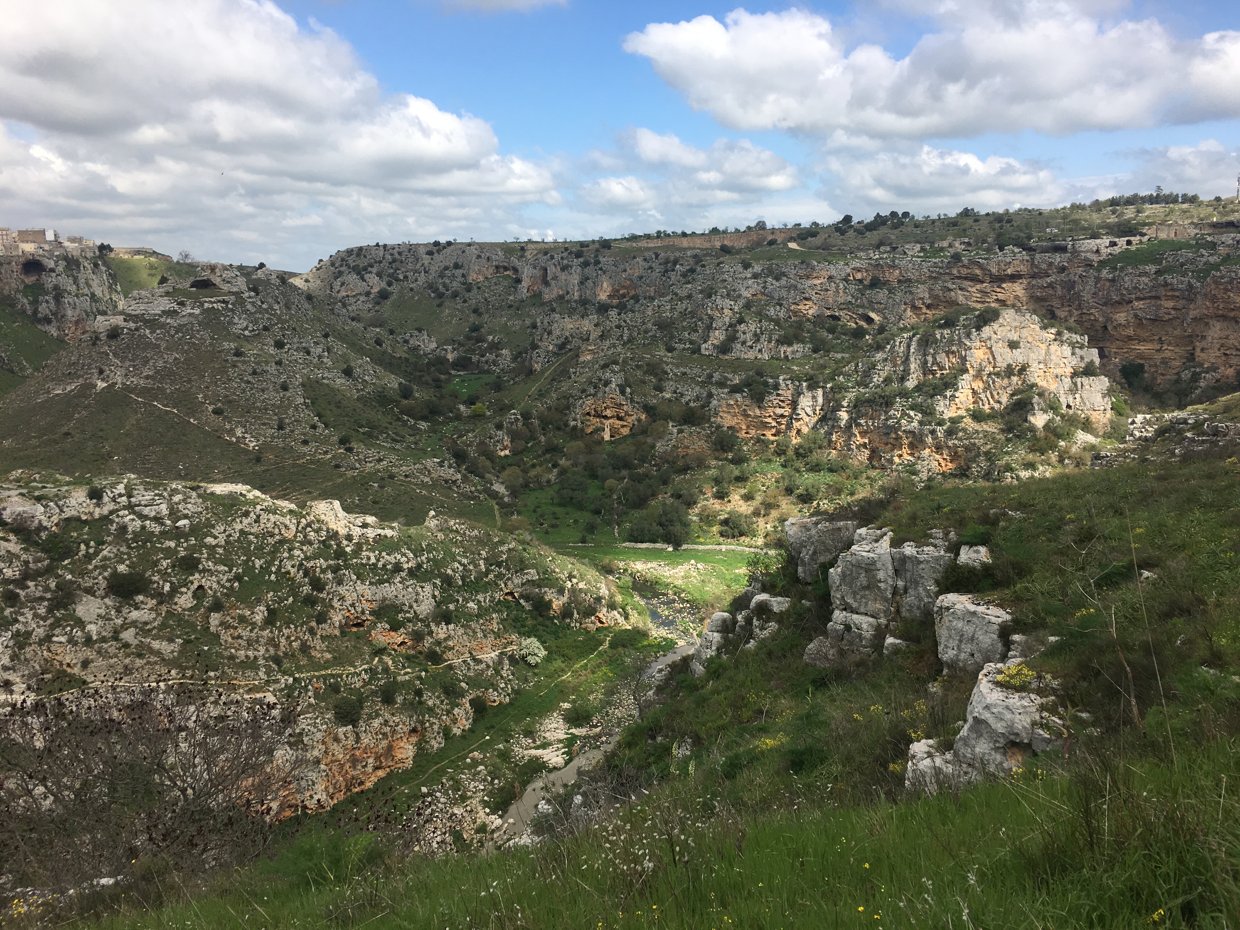 As we descended into the ravine we got our first indication that the day wasn’t going to turn out the way we expected. ‘Il ponte e chiuso’ said a couple who were climbing back out of the ravine. We decided to descend anyway, the bridge might be closed but before it had been built the route had involved fording the river, so possibly we would find some stepping stones. We walked up and down the banks but couldn’t find an easy crossing, the river was full from the previous day’s rain and the way north was eventually blocked by a rocky outcrop over the river. Our next option was to ascend the ravine and then go back down another path a bit further north where the crossing might be easier. At the bottom of the path we encountered a British couple who told us that not only was the bridge closed but the path was completely closed on the Matera side, so it wasn’t worth trying to cross the river.
