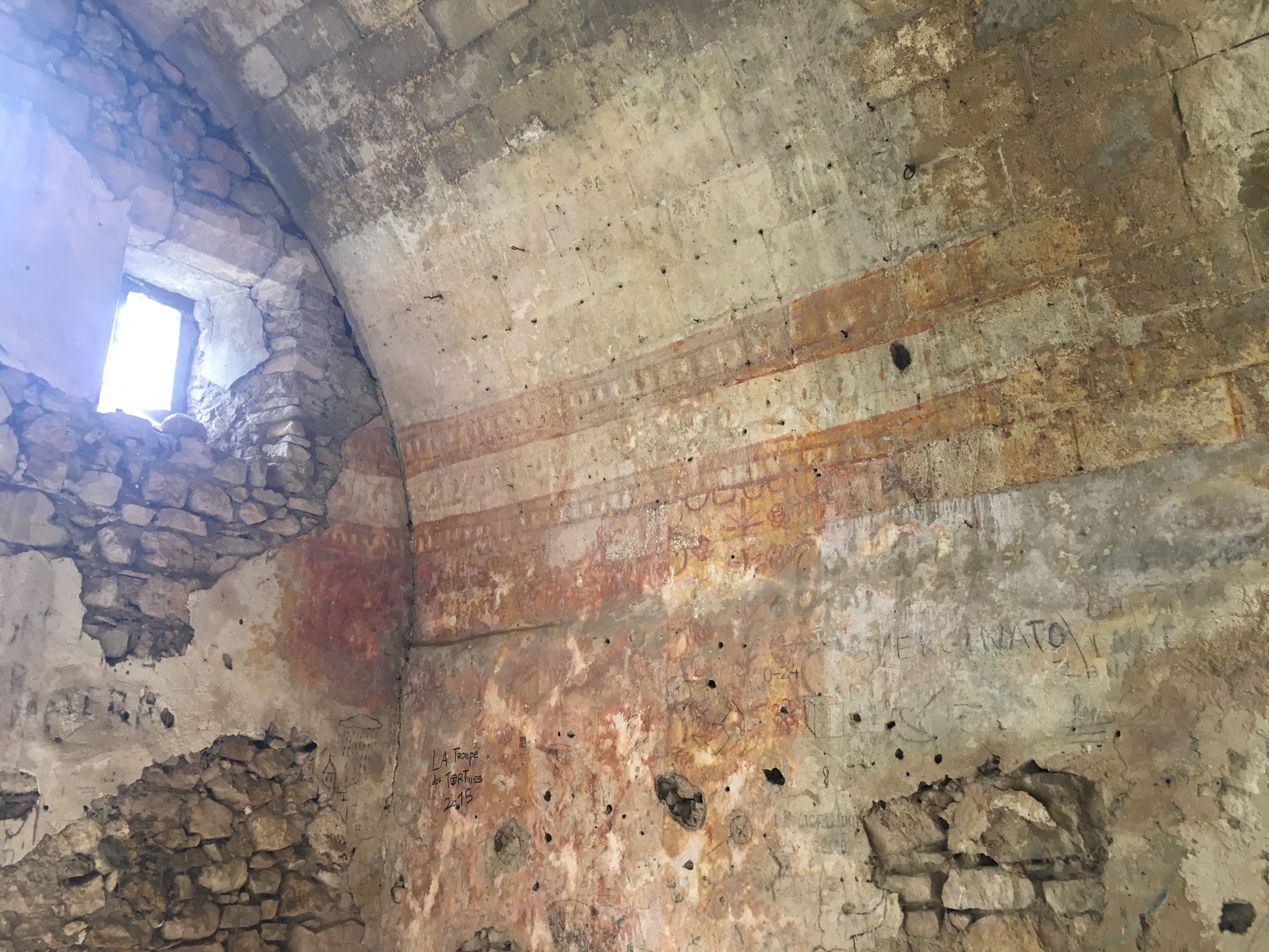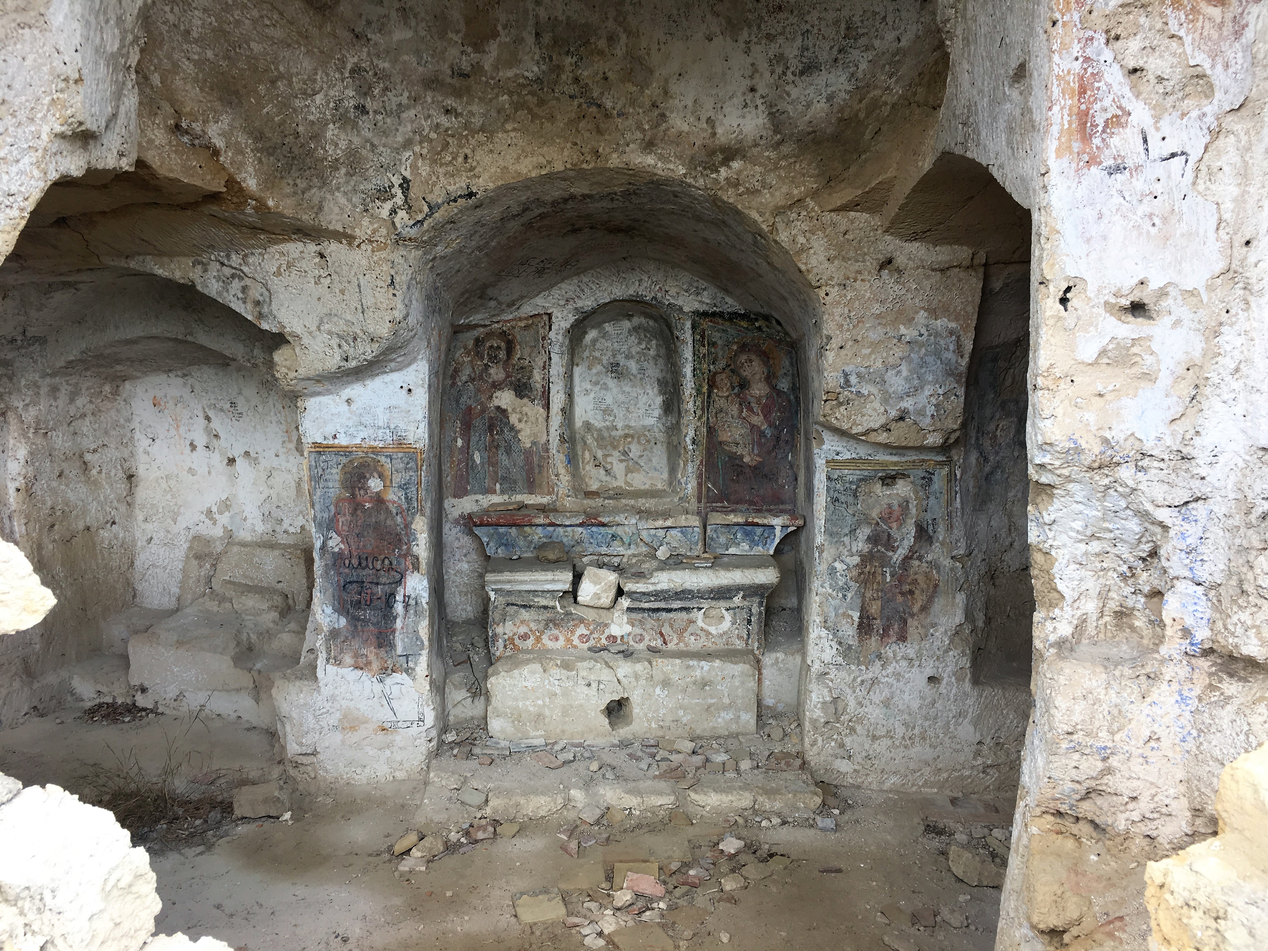 At this point we changed our itinerary. Instead of visiting the city we would do a round trip walk taking in some of the lesser churches and caves. The main Rupestrian Churches are locked and you need a guide to access them, but there are plenty of smaller caves and churches still open. So we followed the gorge north and west for a while, before heading up to the top of a hill with a church ‘Madonna degli Angeli’ that still had some murals visible. When we descended this hill we found another small church in a wooded valley. Here we sat and watched the butterflies and birds, we were looking for wild boar – the British couple had seen a sow and piglets wandering through the valley earlier – we didn’t have any luck but there were loads of beautiful swallowtail butterflies and kites and kestrels danced in the wind.