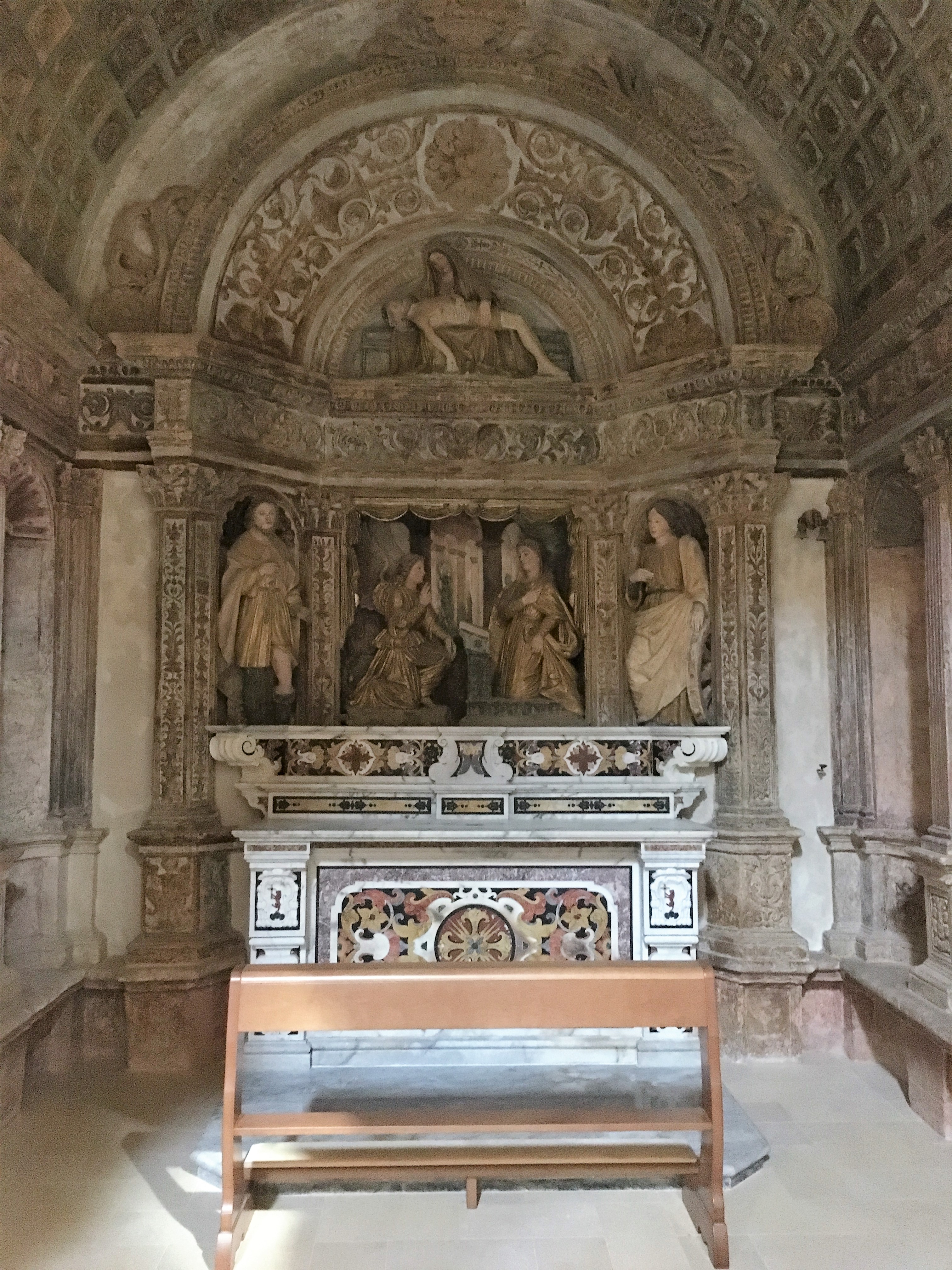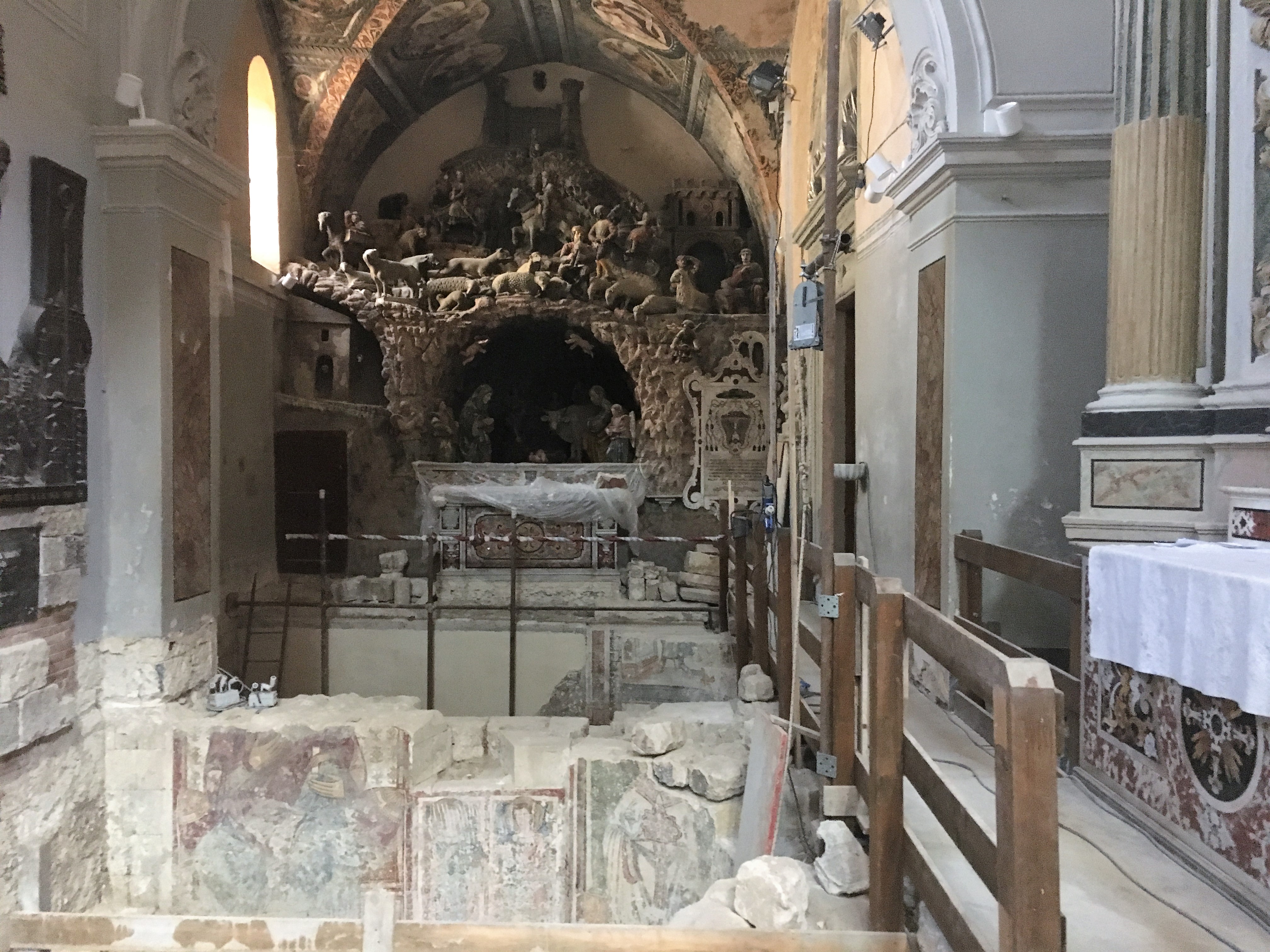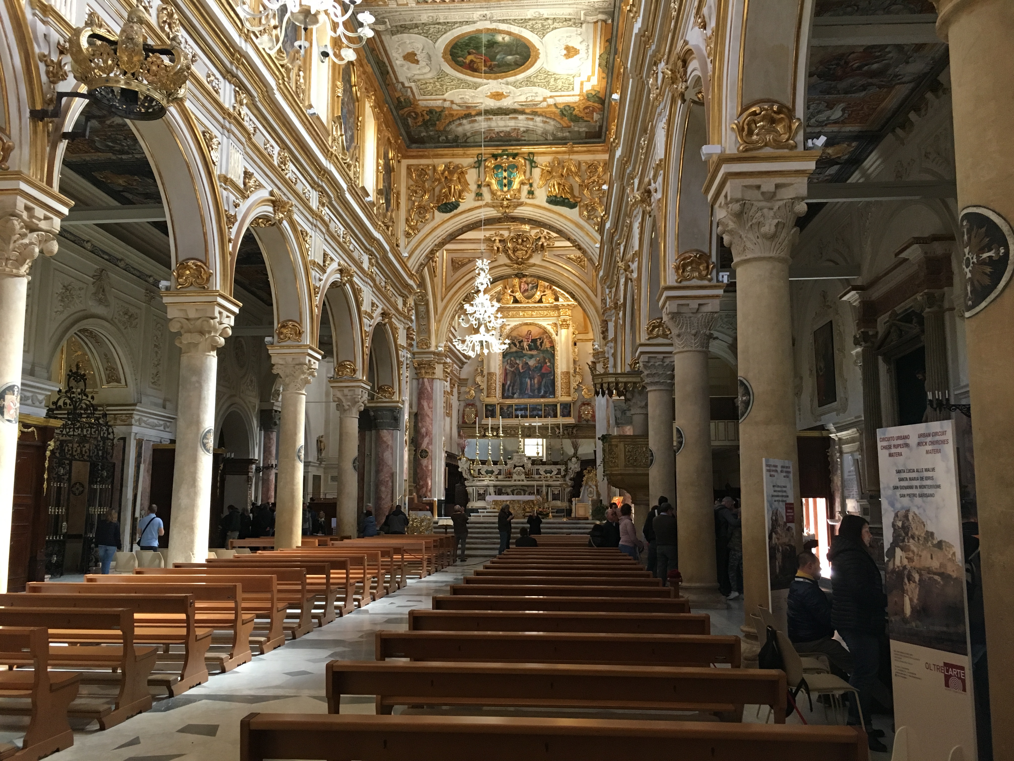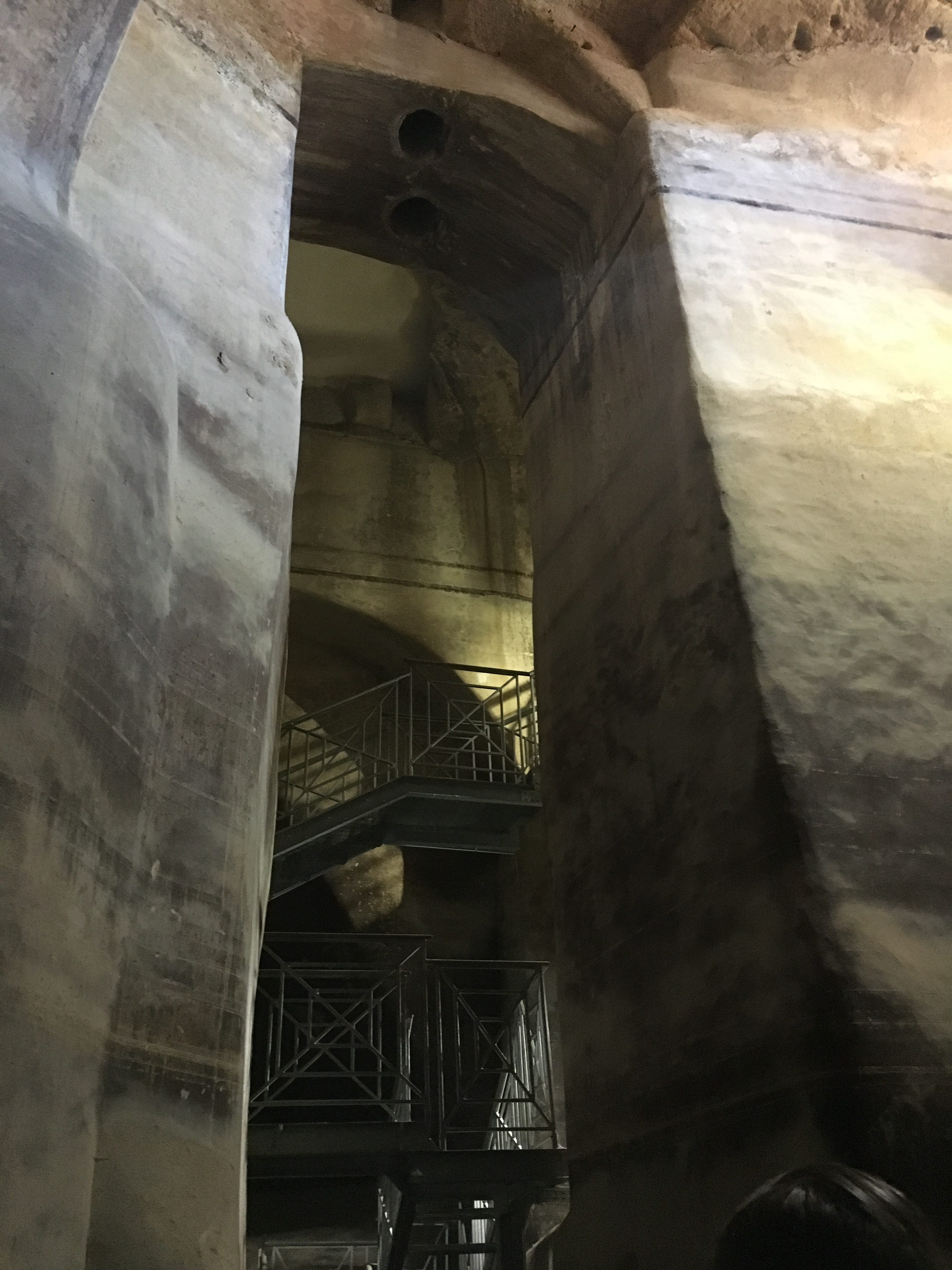We spent the day wandering around Matera. The Piazza Vittorio Veneto hides a 17th century engineering marvel – the Palombaro Lungo is a huge water cistern, built by expanding and joining several cellars and cisterns that had already been excavated in the limestone and then plastered so that water could be retained. It seems odd that this fresh water reservoir was built at the top of the town, but it’s base sits in a naturally occurring aquifer between layers of clay and so water would collect. Water was always a major issue for the Materan population in this limestone country where water percolates through the rocks deep underground and river beds are often dry. The sassi buildings collected rainwater from roofs to store in individual cisterns, but in dry summers this water became very scarce. The Palombaro Lungo made a much larger source of water available to the town. We took a short guided tour (€3 each) into the depths of the cistern, along walkways that had been constructed to show off the scale of the caverns.