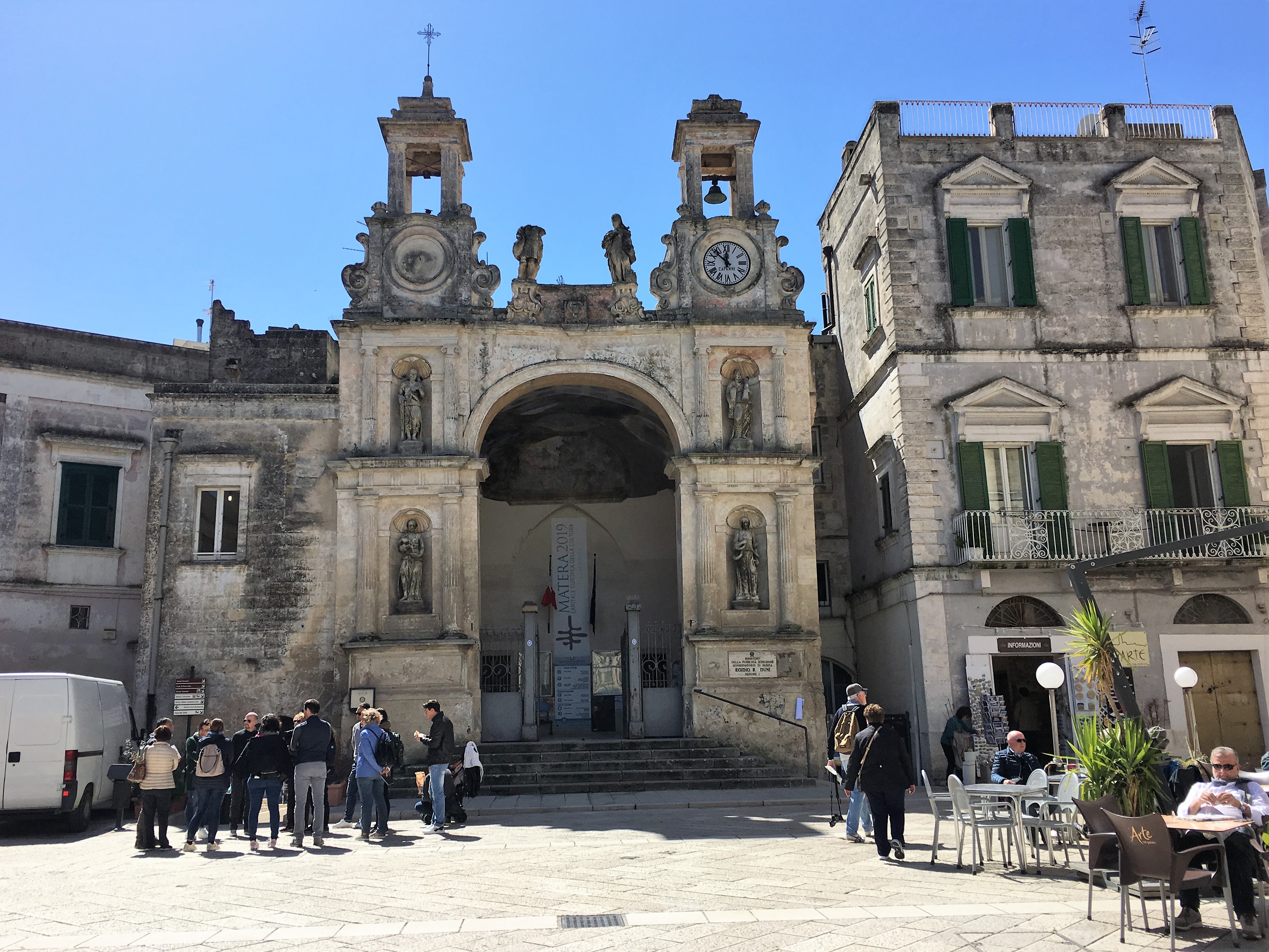 The following morning we opted to leave the campsite and drive into Matera. On our way here we had popped to the supermarket where an elderly gentleman had accosted us to recommend parking in Viale Europa. He was quite insistent that we should park there and I didn’t have the Italian to say that we had already decided where we would stay. But his advcie came in useful when looking for parking in Matera – the parking was a small sosta on the side of a busy main road, so probably not the best for overnight, but it has facilities (closed when we were there). There is a charge for staying for the day (6 euros), but no one was manning the office or answering the phone number so we parked up, left an answerphone message and figured that the worst that would happen was that someone would be there asking for money when we returned.