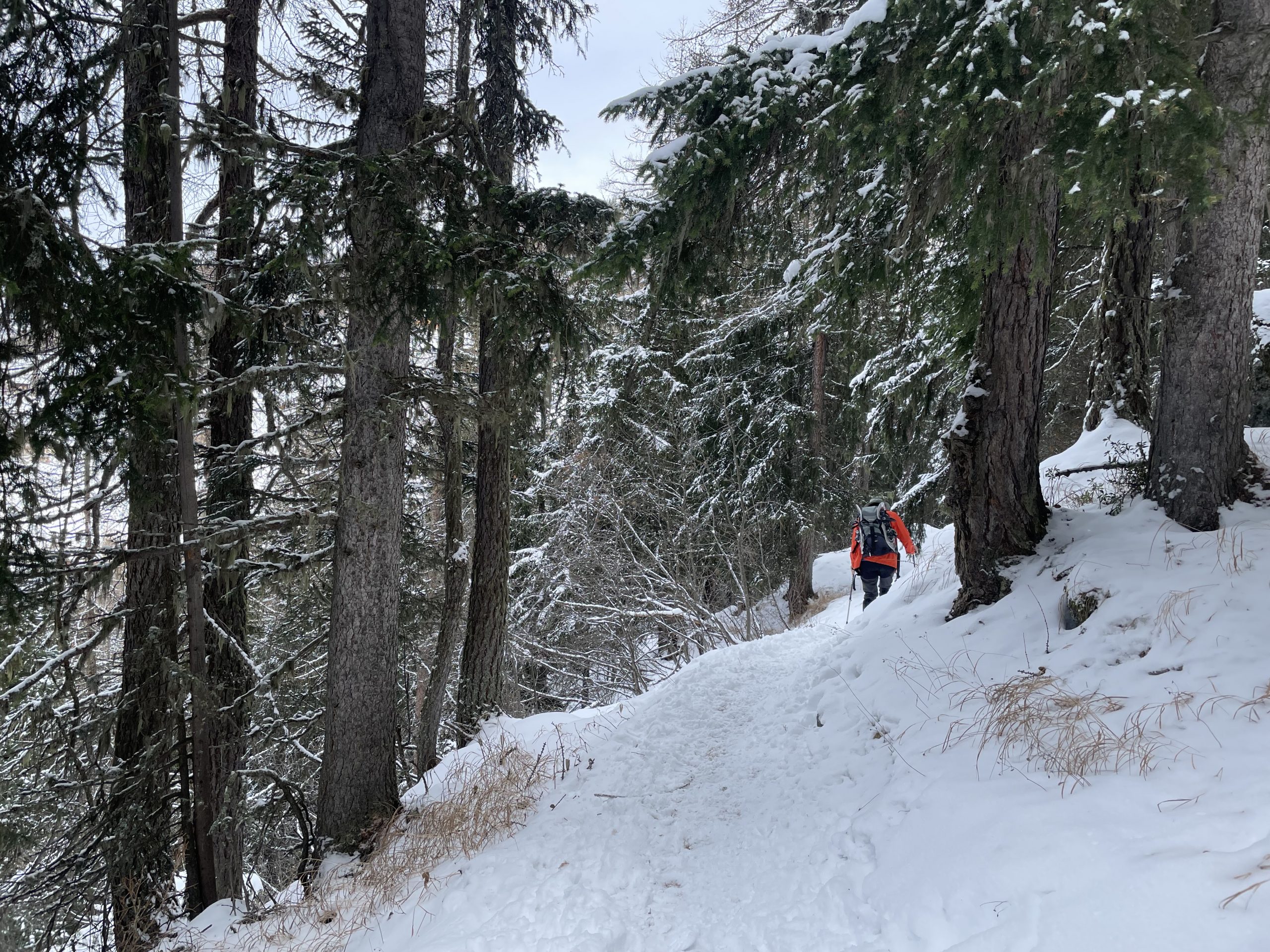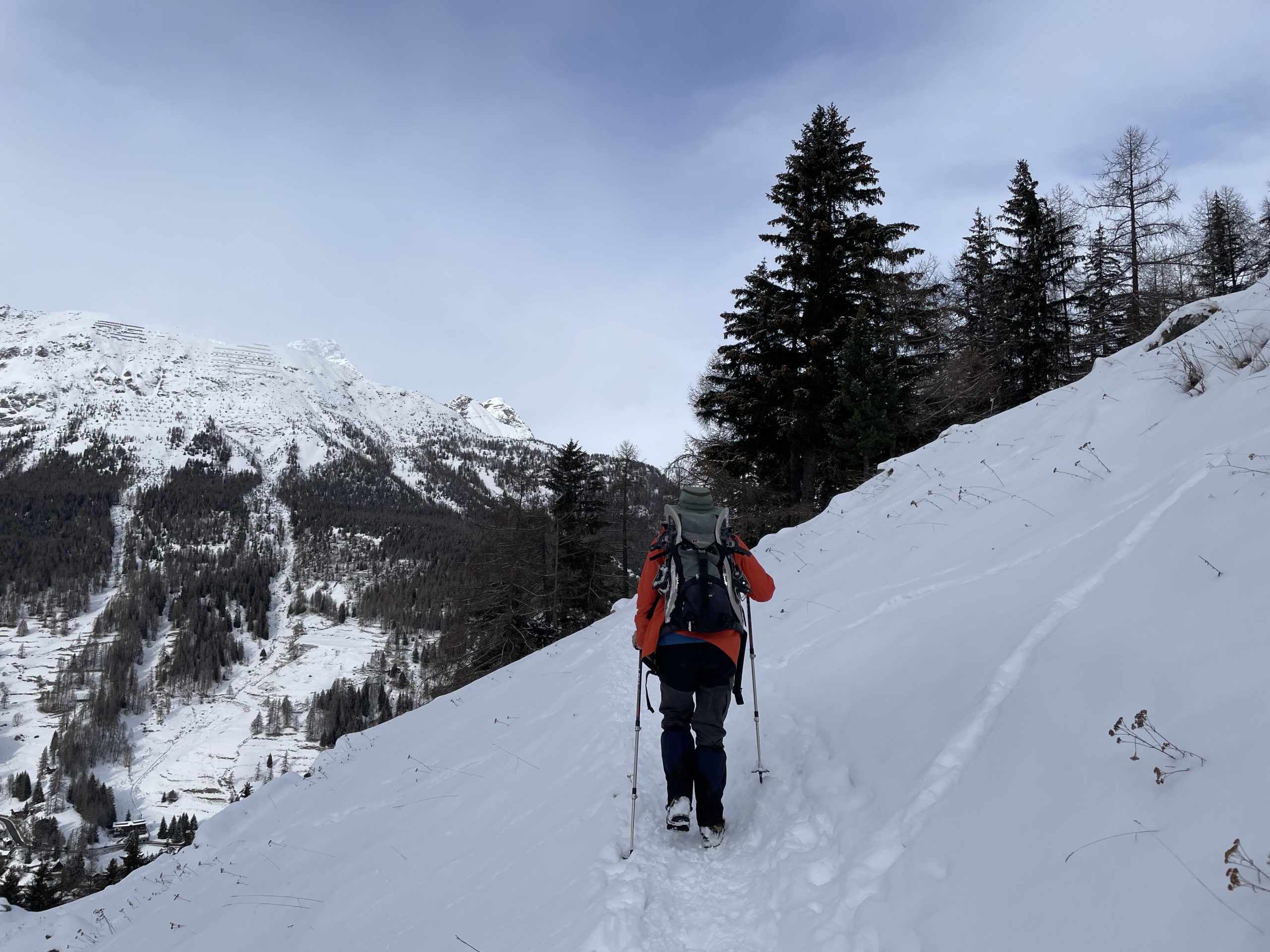 We reached a small bar where we swapped our snowshoes for microspikes to tackle the steep downhill path to the village. It was the first time we had used them and we were very impressed with the help they gave us on the slippery rocky path.
