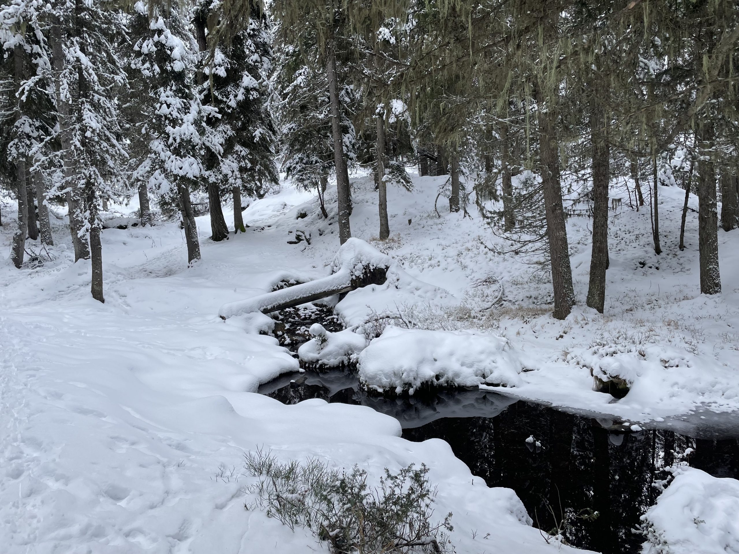After satisfying our curiosity we walked across the stream and took a footpath towards the forest. Our snowshoes went on at this point as the snow depth increased and the path became less trodden in a frozen wonderland of snow laden branches, streams and pools.