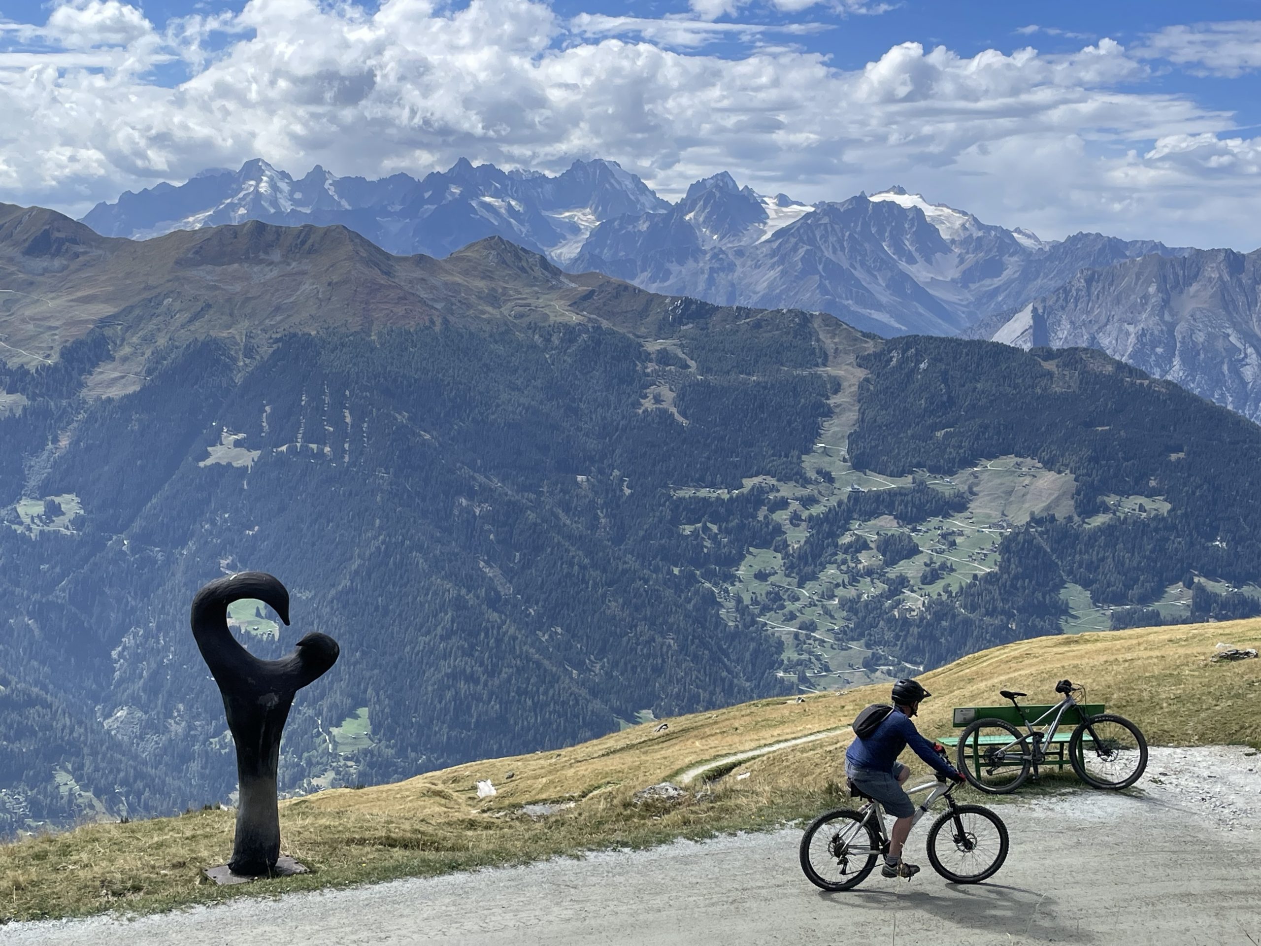 We had enormous fun and when we were ready to return to Bertie in the valley below we were cheerful enough that we decided to cycle all the way. We followed the blue run and then tracks down to Verbier and then roads through the quiet resort town (which was also a bit pongy, there must have been a drain problem). We didn’t want to follow the main roads down to Le Châble so guessed at the right turns down through the hillside villages until we found a mountain bike VTT route that seemed to be going in the right direction. It was dry and dusty and very skiddy but it got us down in one piece, both very happy to have had such a great day on the bikes.