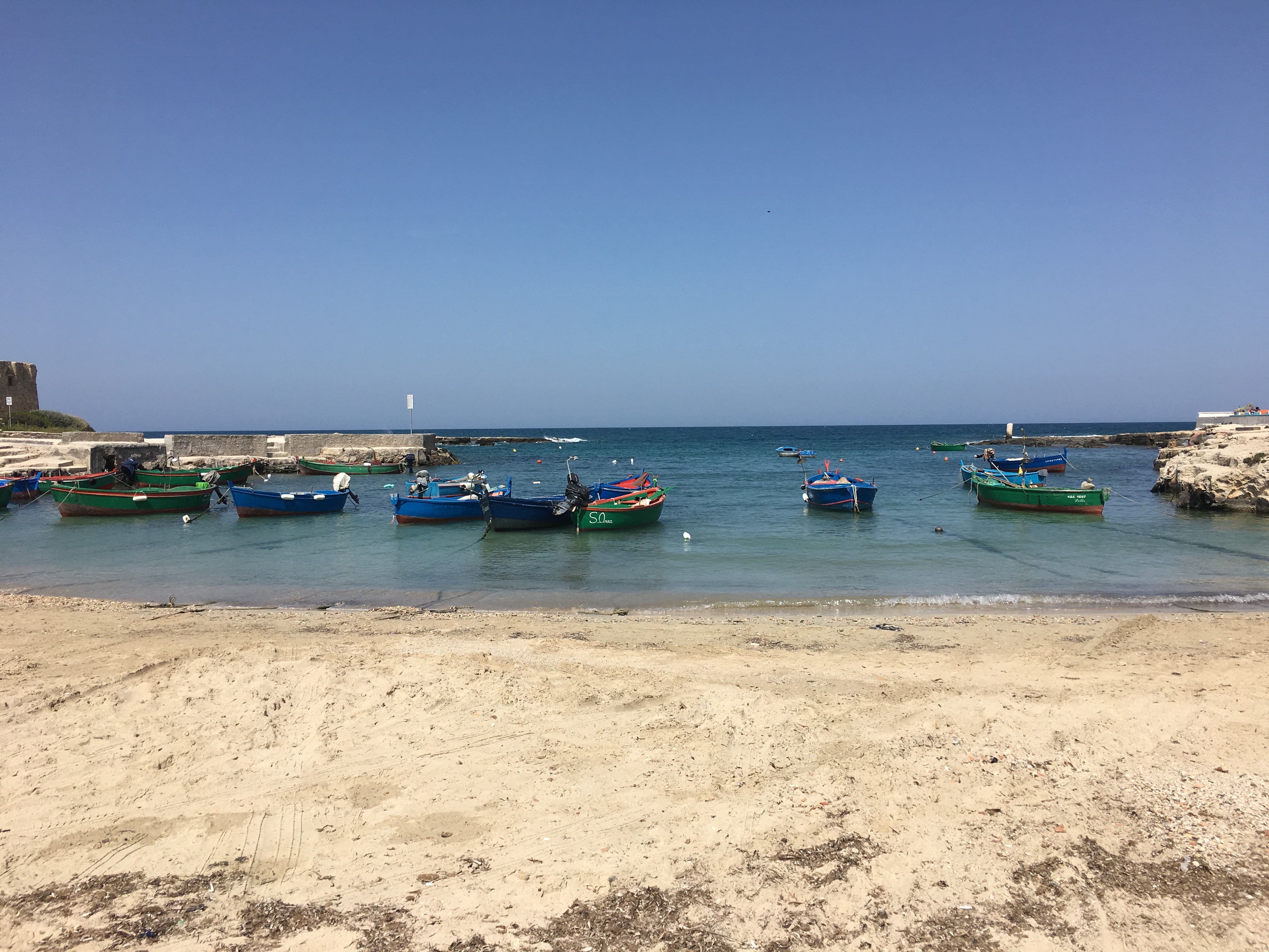 It’s the type of place that is busy throughout the year, so restaurants and gelataria were open for business. There were people of all nationalities, including quite a few British families, enjoying their Easter holidays here. We spent time on the beach, paddling in the cool sea, climbing onto the cliffs to get sight of the fish swimming below us and clambering over the clifftop limestone spotting lizards. We ate pizza and pasta, creamy soft burrata and lots of ice cream (Bella Blu was our favourite place for gelato). We drank the non-regional but very easy drinking Lambrusco. We wandered out in the early evening to spot bats flitting around the lampposts and fisherman setting out with bright lights for catching squid. Between times we relaxed in the apartment, talking, reading, and listening to the kids playing ‘the shopping game’.