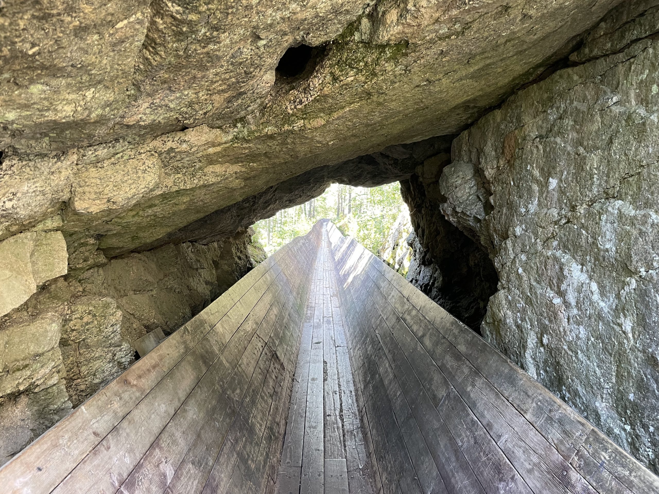 The wood has obviously been replaced over time but was still springy underfoot and there were plenty of holes and sections where the fixings were starting to work loose. There were two suspension bridges both of which seemed pretty rusty and swayed slightly as people stepped across them. The one tunnel was long enough that torches were required as we crouched down and squat-shuffled along, and yes we did have to pass other people in the tunnel too.