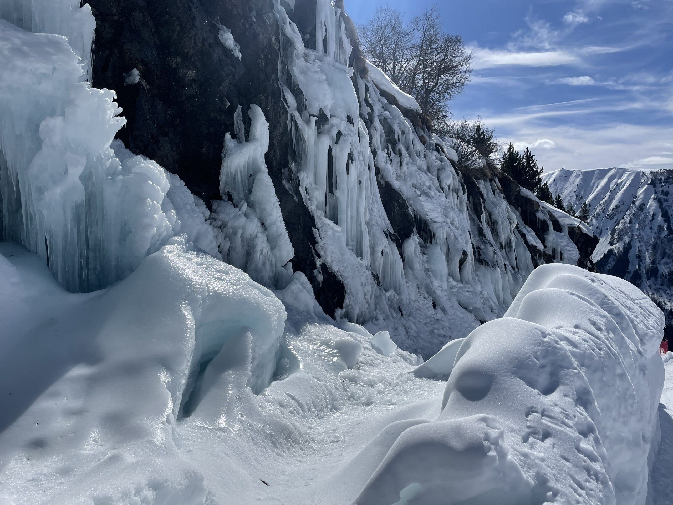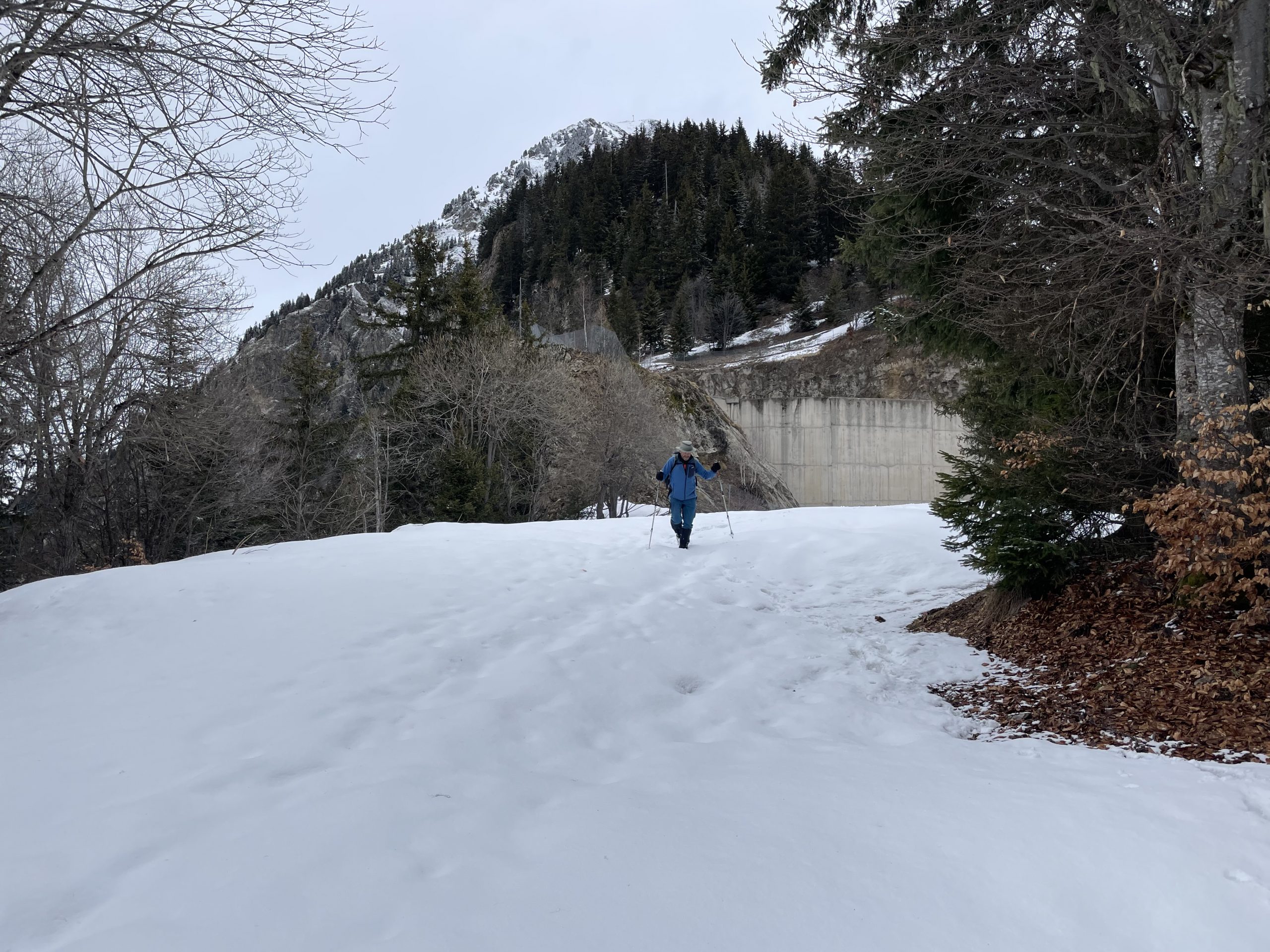 We didn’t make it to the Col as we hit snow at about 1700m and didn’t have snowshoes, but we managed to turn it into a sort of circular walk by following the road back down to a leisure area and then taking a higher path back to Vaujany. At the top we were surprised by a group of skiers who were using the snowy road as their ski run.