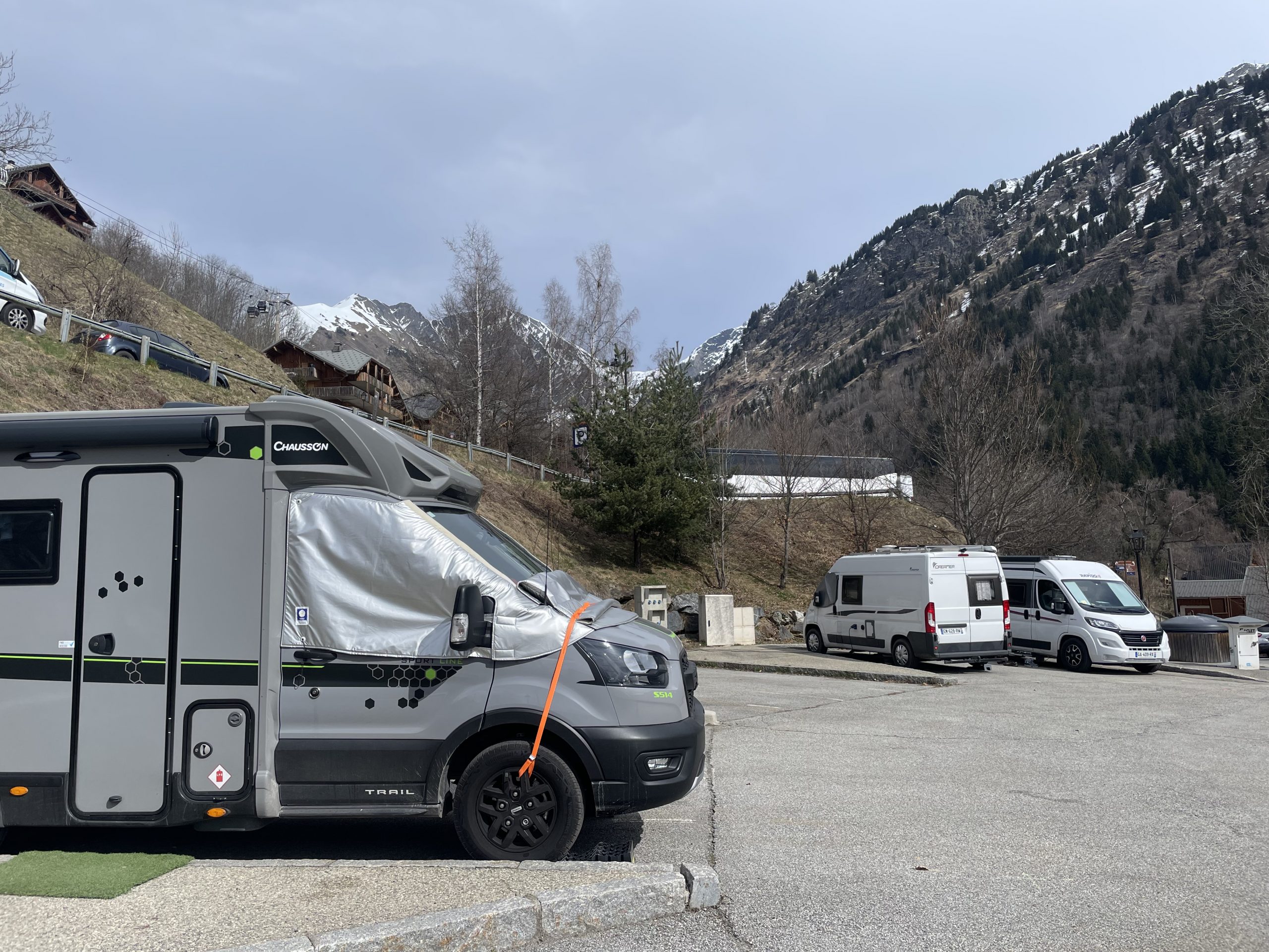 On our first skiing day we moseyed over to Vaujany where we’d enjoyed a stay back in 2019. We decided that the aire in Vaujany looked much more comfortable, peaceful and scenic than our carpark stopover. With a couple of work days impending, and some overcast weather on the horizon, we also determined it would be better to be on hook up.