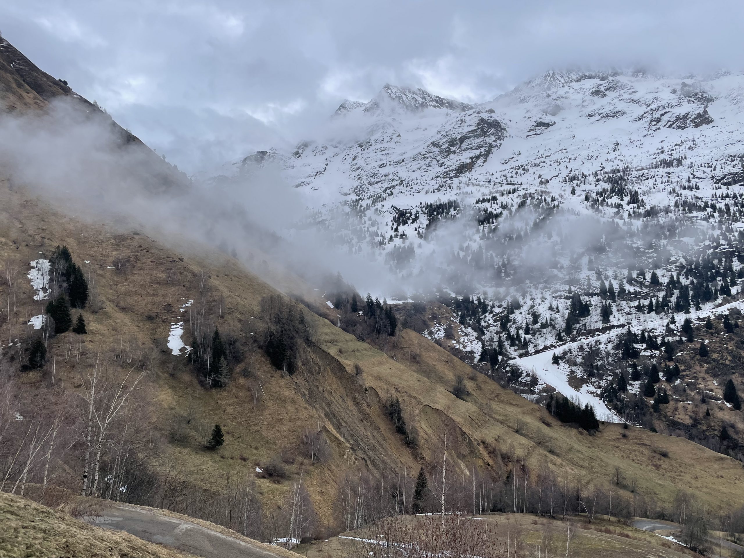 Our first walk was up the valley, under the Montfrais lift, through the hamlet of La Villette and up towards the Col du Sabot. The cloud swirled around us, sometimes settling into the valley below us, and sometimes rising above.