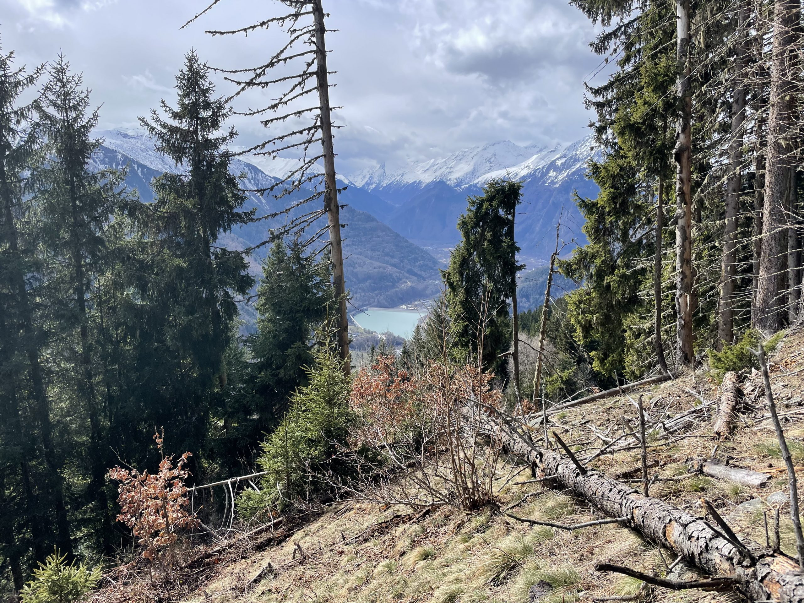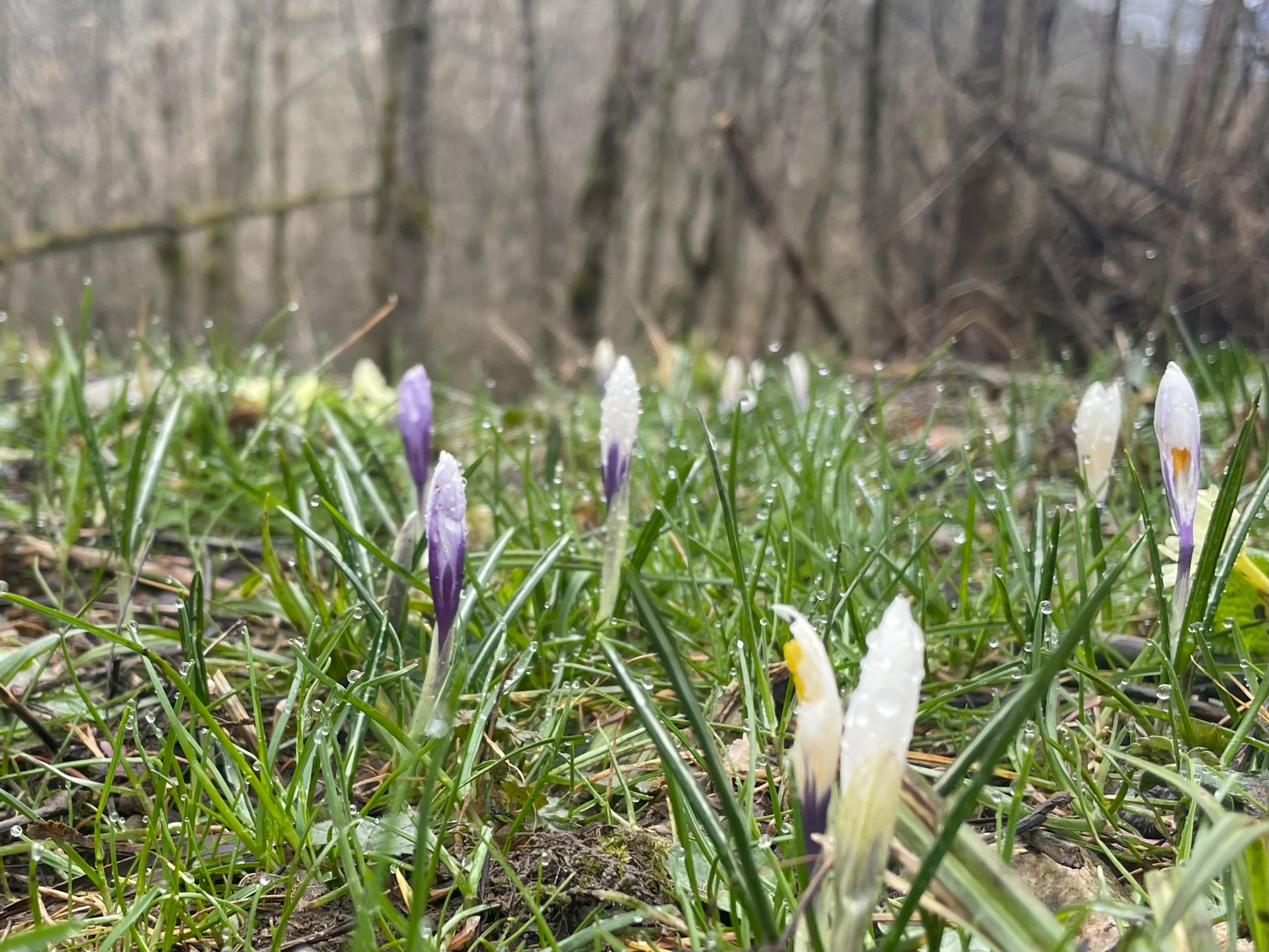 The first part of the walk traversed the hillside on a lovely primrose and crocus strewn path. Unusually there was a fat seam of slate in the limestone. Then the path became steeper, taking a direct line up the slope through the trees. At the top there was enough compacted snow and ice on the path to make us glad of our microspikes to stop us slipping back down.
