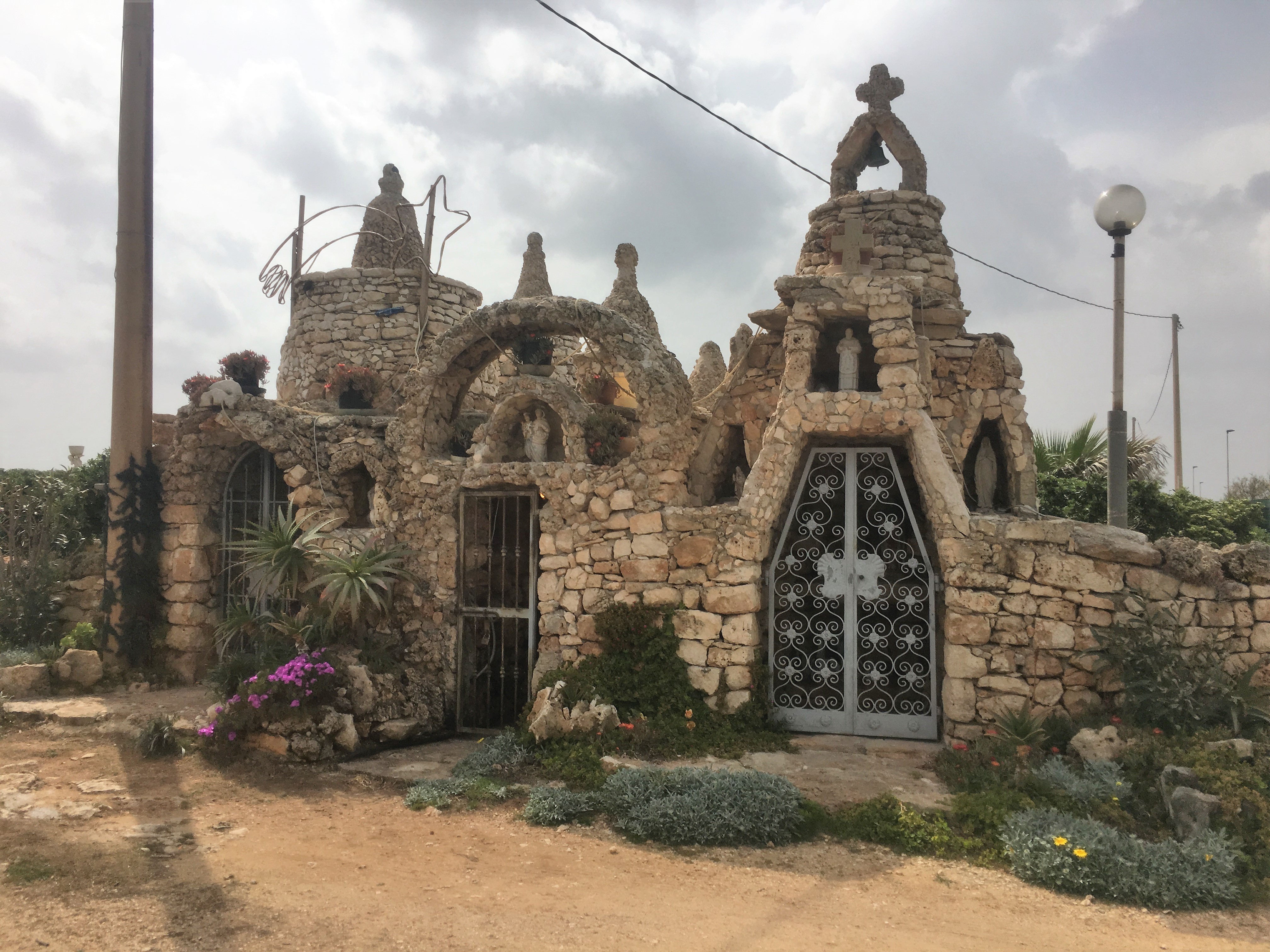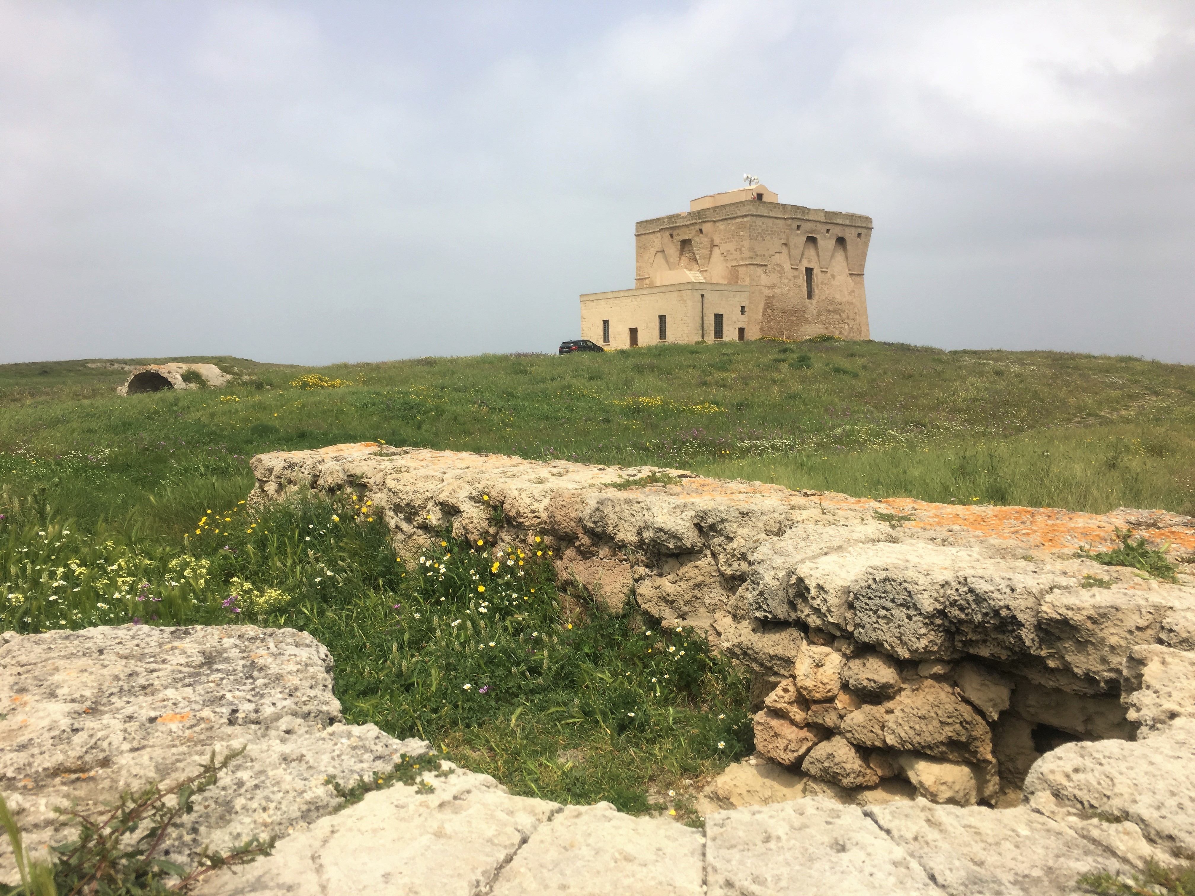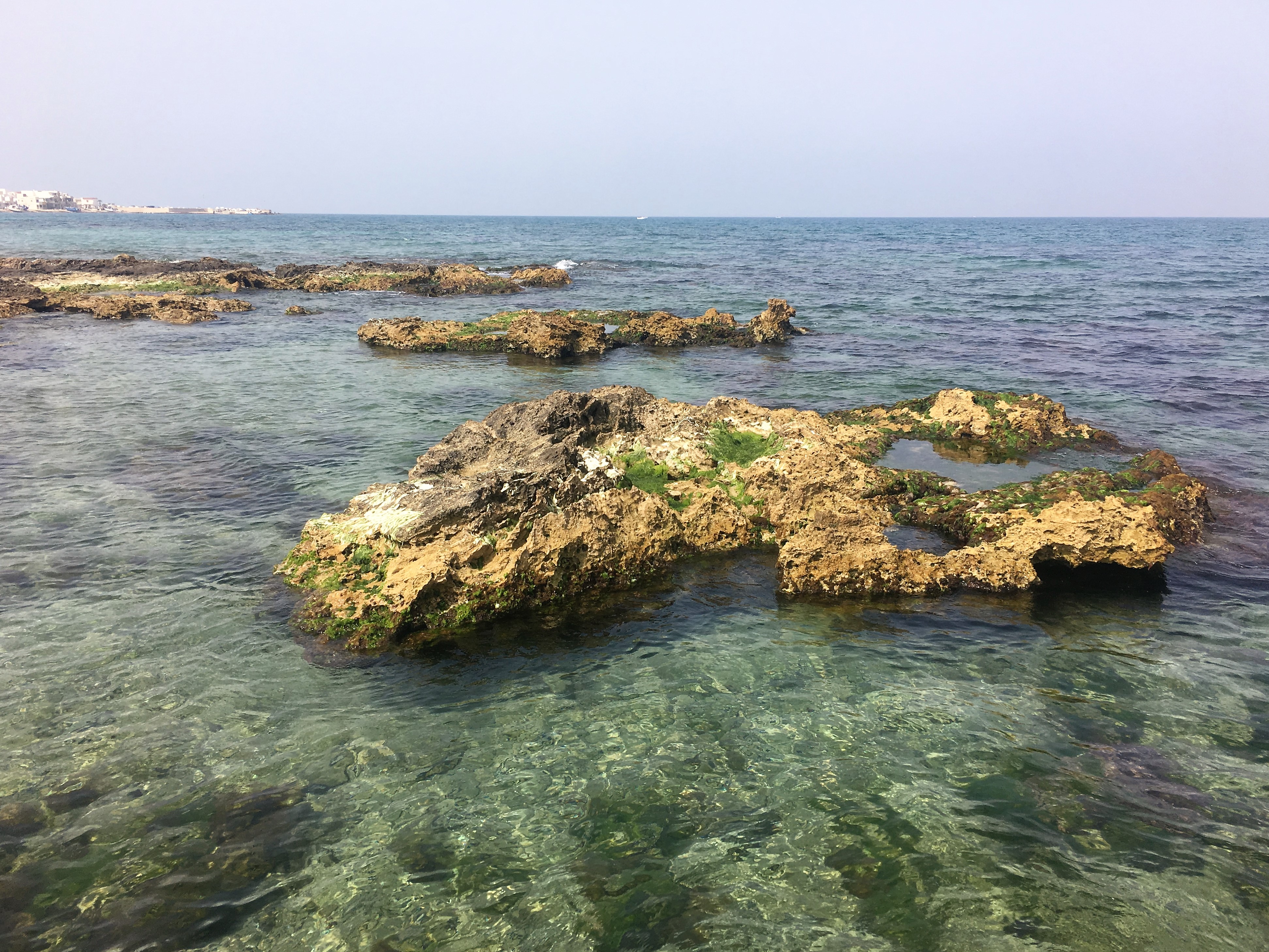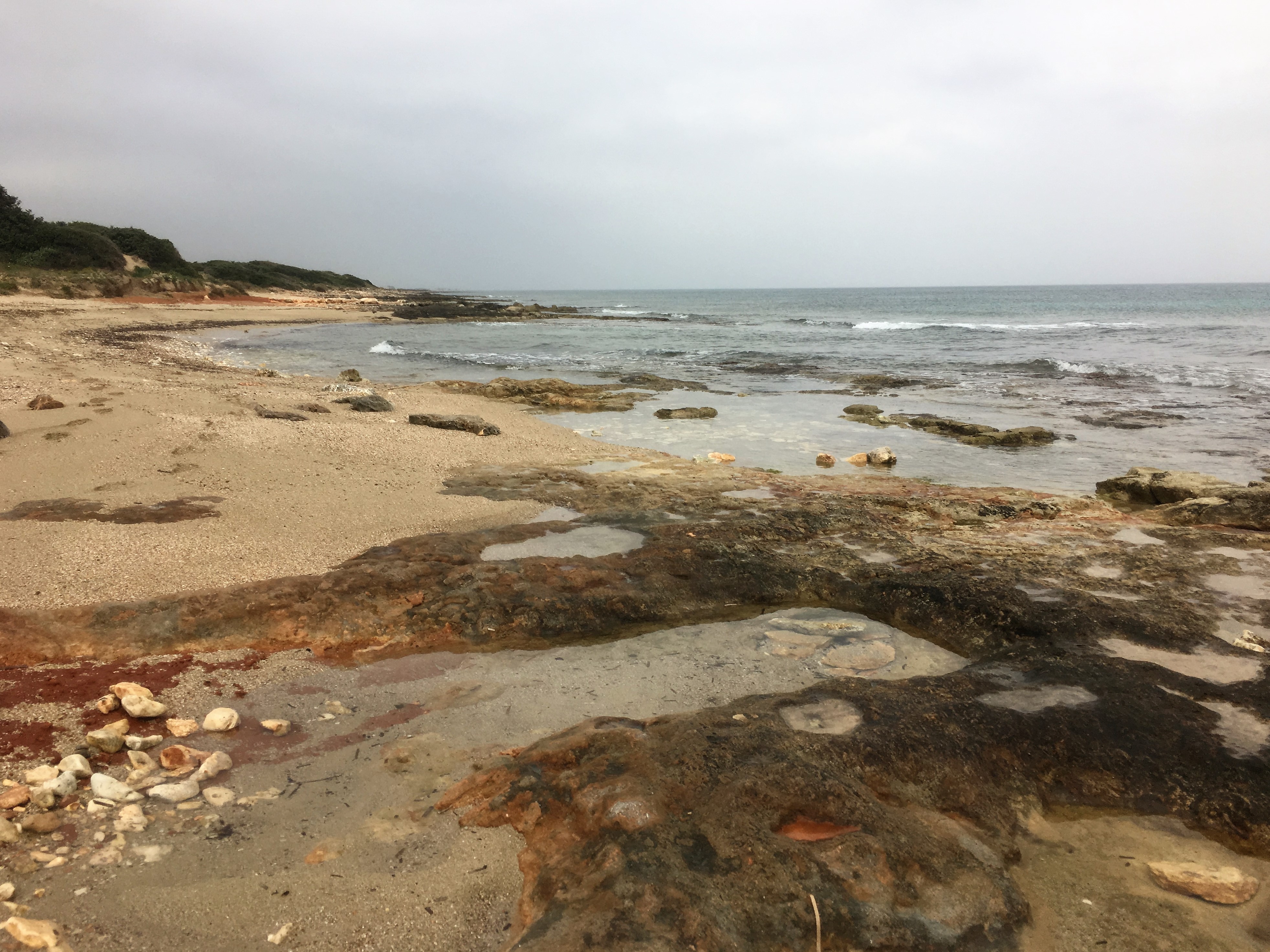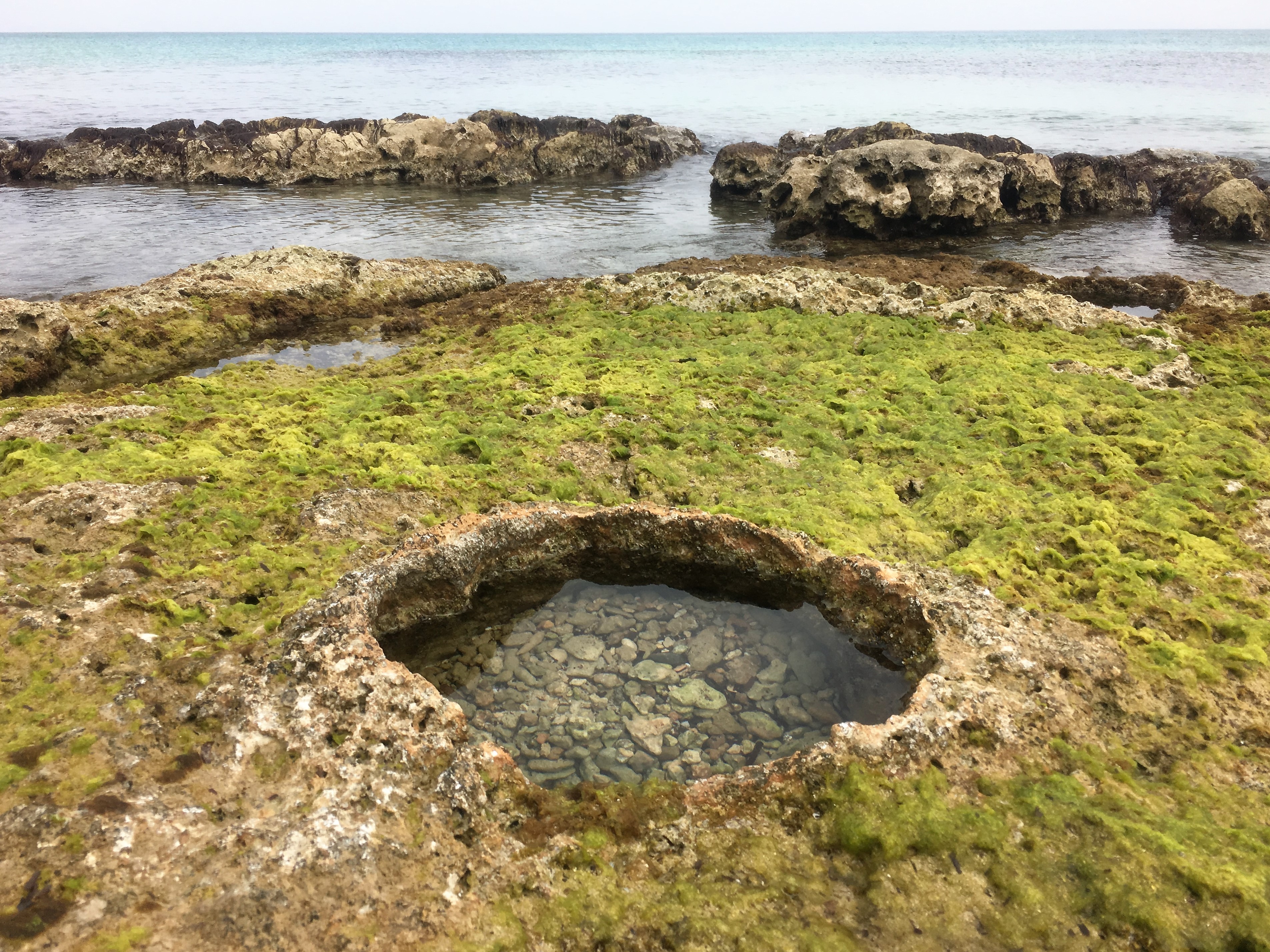 The following day we moved down the coast, passing by Brindisi where we stopped for some supermarket essentials. We parked in Torre San Gennaro, a seaside town that was almost lifeless apart from a couple of cafes doing their pre-season painting. The coast here was friable limestone and clay, a look could crumble it into the sea. Our parking area had new bollards in it to stop anyone from venturing too close to the edge where the sea had undercut the asphalt. We bimbled around the coast, wondering what had created the perfectly round rock pools, like miniature craters. Lumps of clay – we surmised – that had been scoured out of the harder rock by the sea.