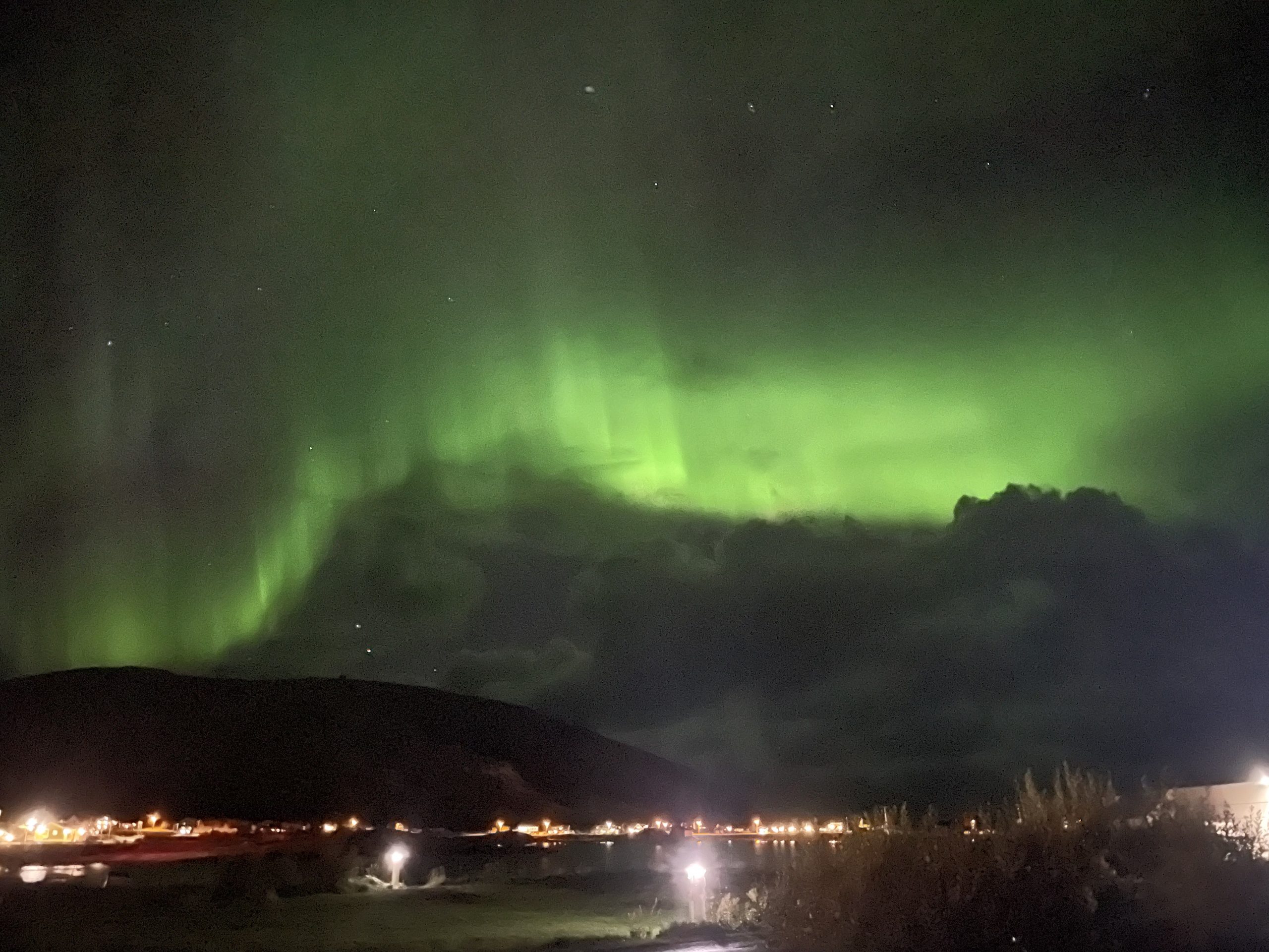 This had to be the best aurora of the trip. The sky danced with ribbons of sky-fire. As the clouds scudded overhead we saw ripples of undulating green reaching high into the sky. The display continued for over an hour, our neighbours put their chairs outside so they could lean back and see the spectacle without suffering the cricked necks we developed.