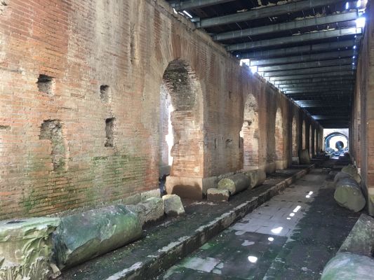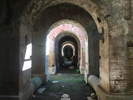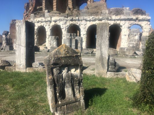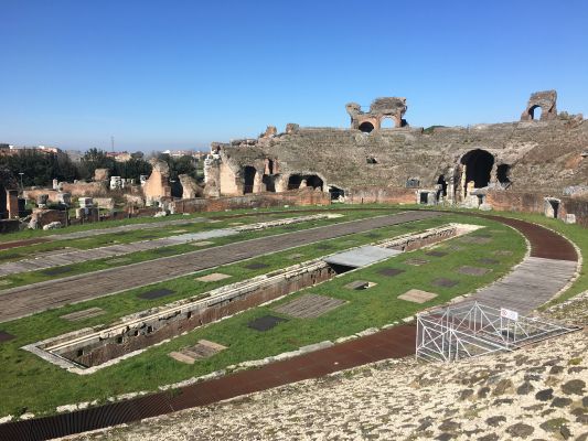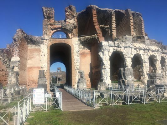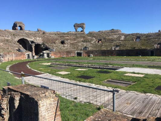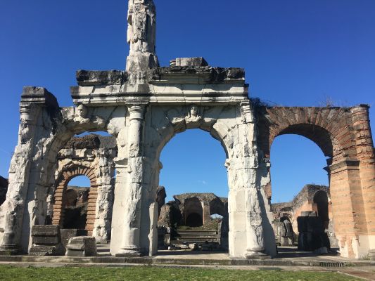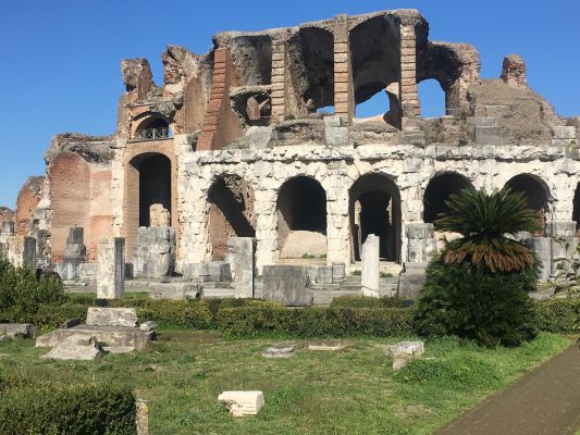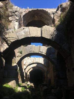 This amphitheatre has shot to number one in our favourite amphitheatres of all time. Was it better than the Coliseum? We spent some time discussing this as we wandered around and decided that yes, we thought it was. Now the Coliseum is spectacular and huge and incredibly intact, but it is thronged with tourists, sanitised and large areas are off limits unless you book a tour. In contrast we were walking through an unkempt site where grass and weeds grew with abandon in the late winter sunshine. There were large sections of stonework piled in a ring around the site awaiting archaeological inspection, and many of the decorative elements have been plundered to enhance later buildings in the area. The walls of the amphitheatre don’t stand as high as the Coliseum, but what you get is an ancient monument that is quiet and allows you to wander at will, especially in the area underneath the main arena. As you explore this virtually deserted building you feel as though you are the first person to find the many corridors and stairways. It is incredible that a country can be so full of ancient monuments that a site like this is virtually unknown and it’s restoration underfunded. For the freedom of exploration, the sense of adventure, the peace and tranquillity, the friendliness of the staff and the price it cannot be beaten.